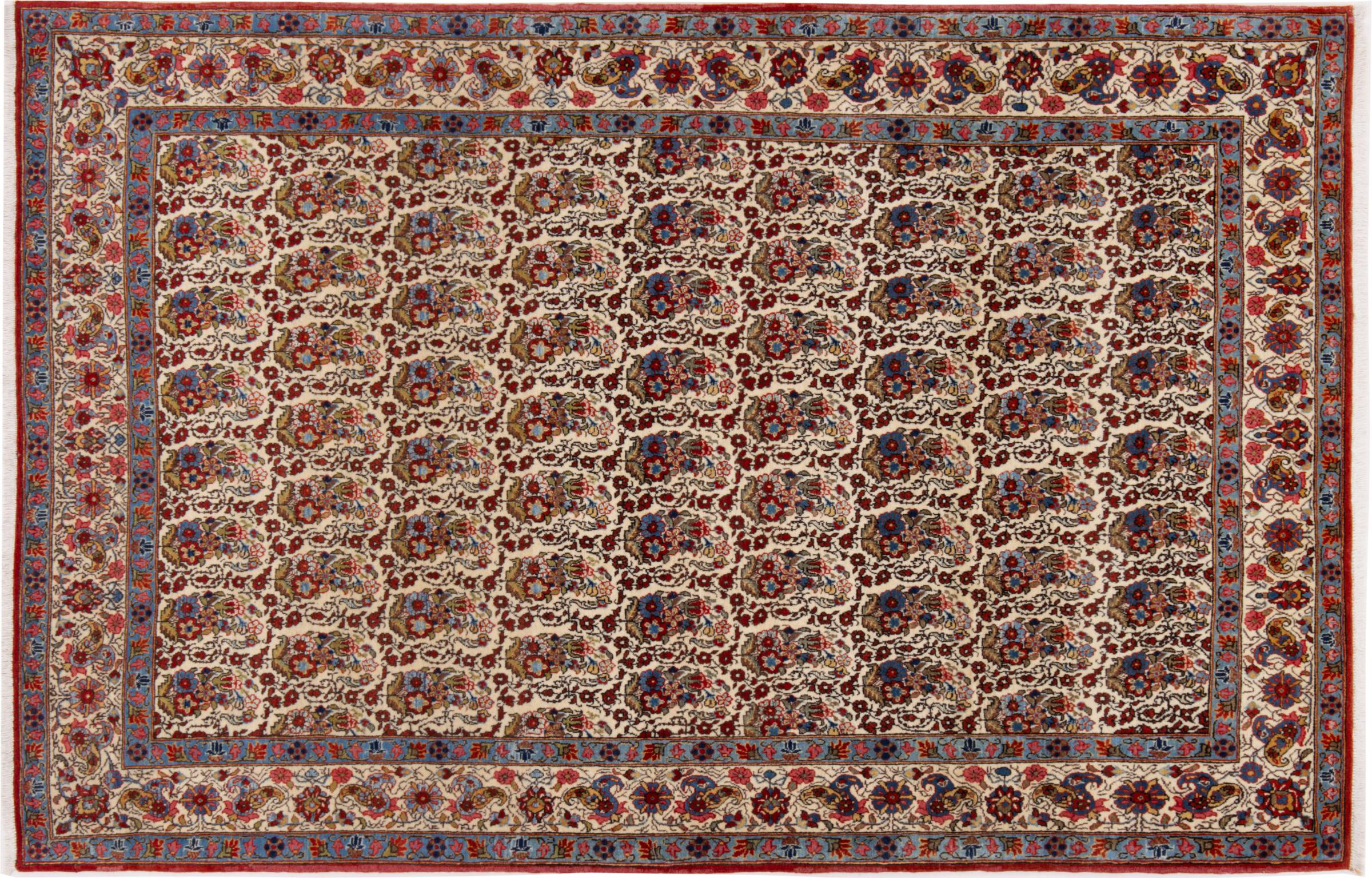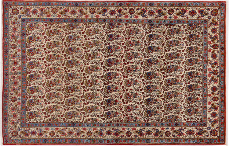 Mattans ID: 292350001882162 Storlek: 214x138 cm Tjocklek: ap. 10 mm Knuttäthet: 320 000 - 360 000 / m² Tillverkning: Knuten för hand Lugg: Ull med silke Varp: Bomull Ursprung: Persien / Iran Ålder: Ny Vikt: ap. 10 kg I lager: Unik - Endast 1 i lager