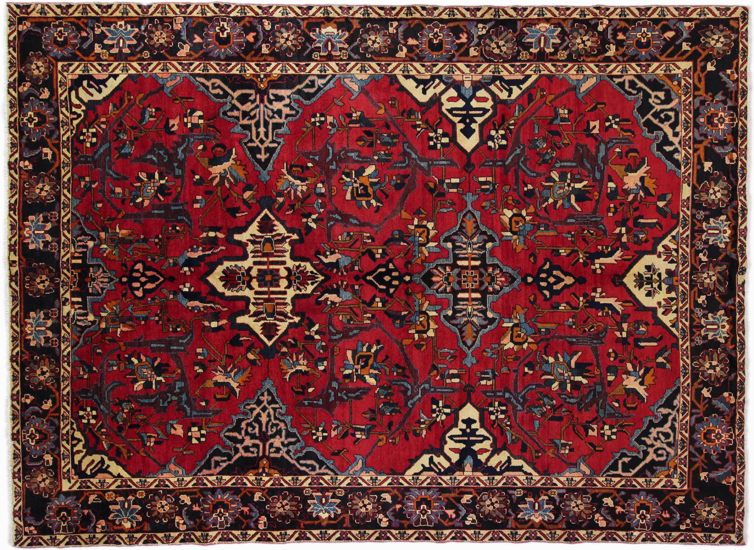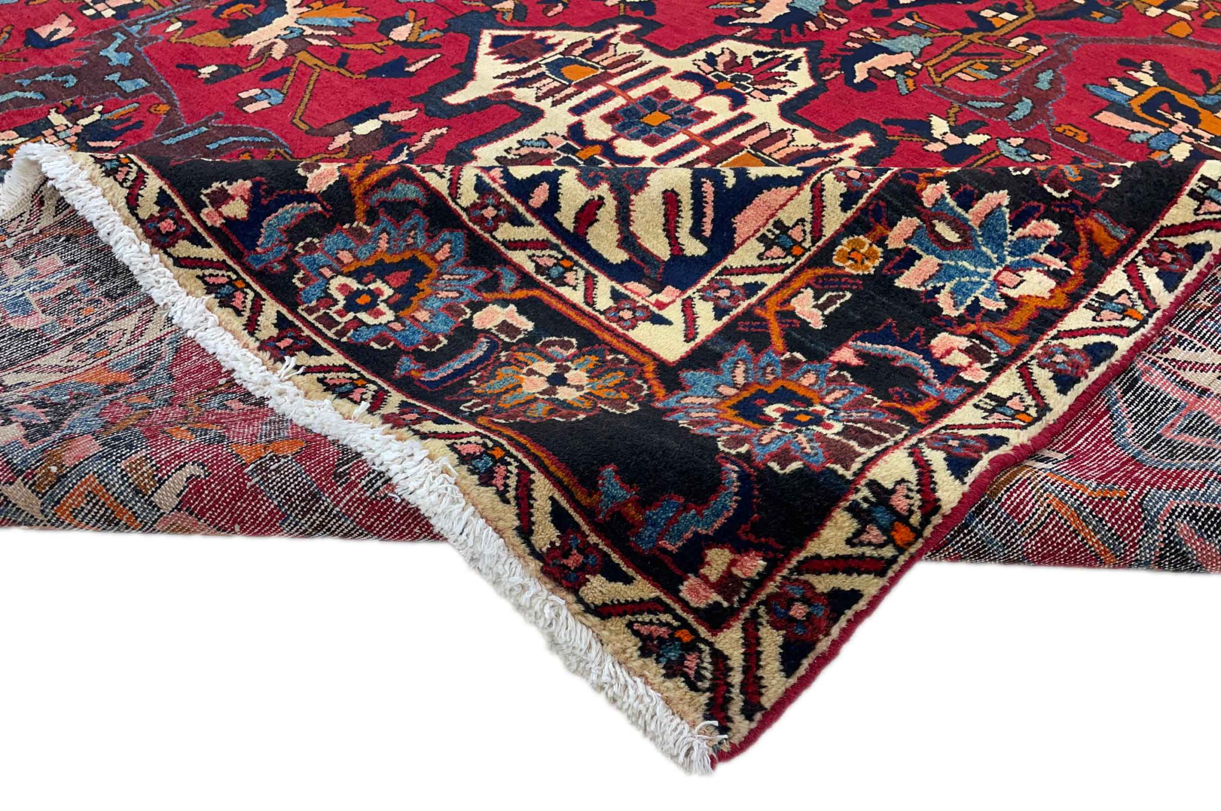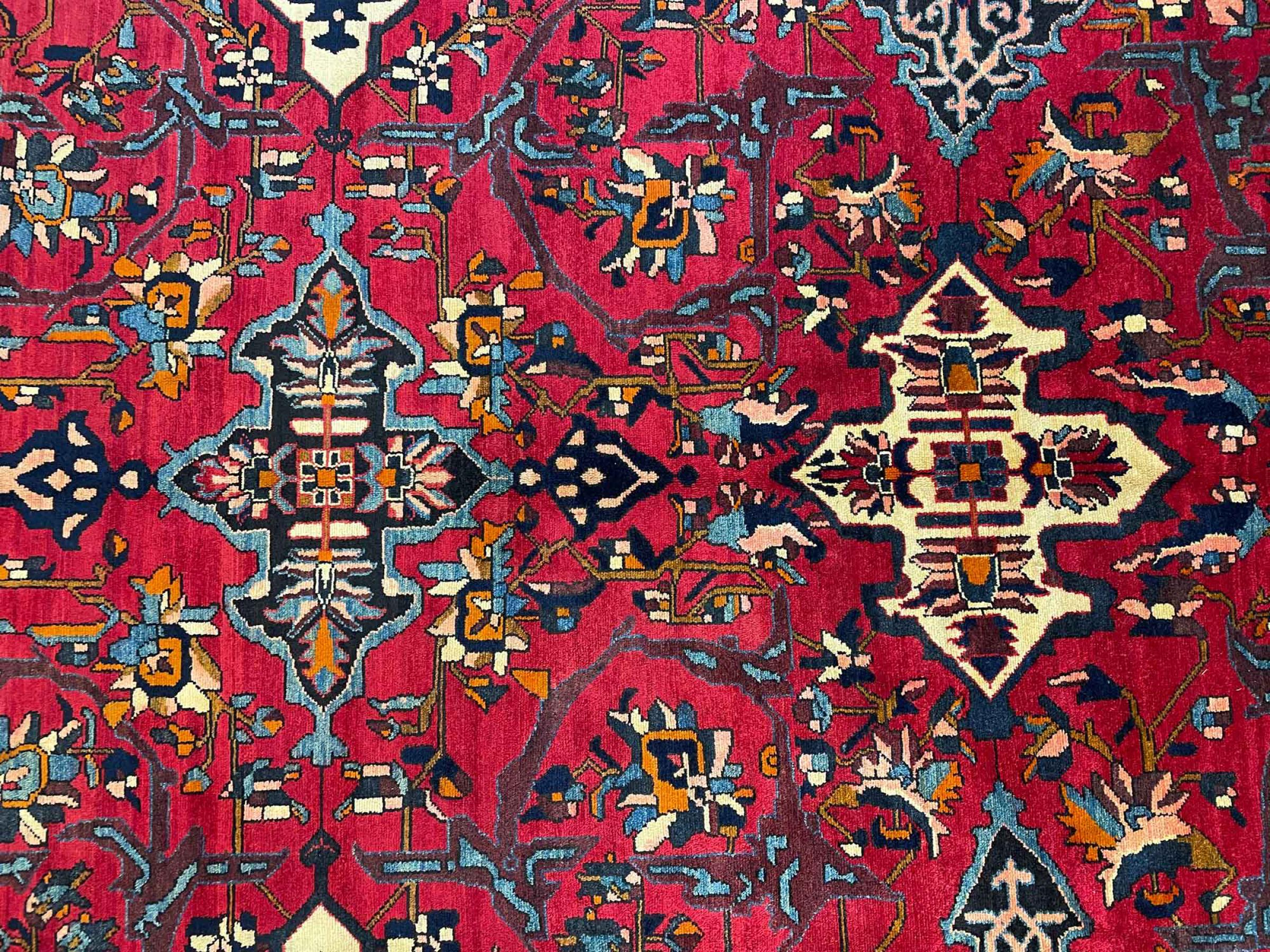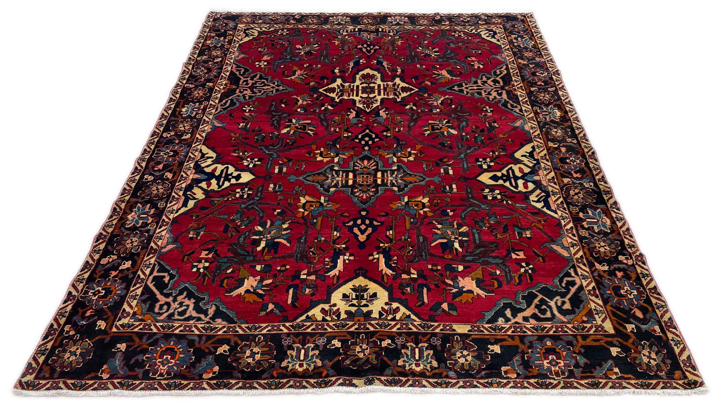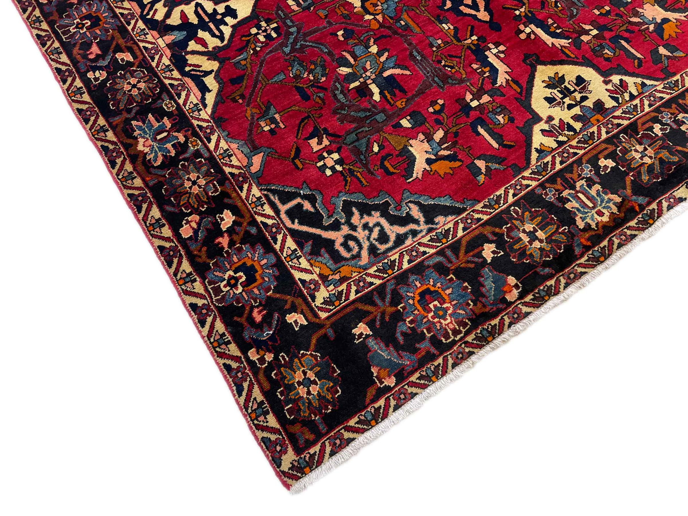 Denna persiska Bakhtiar var handknuten av nomader från Bakhtiari-stammen. Denna persiska matta spelar med färgerna på Orienten i vackra mönster. Utformningen av dess ornament är inspirerad av persiska trädgårdar. Den så kallade traditionella trädgårdsdesignen har blivit mycket populär i den västra världen genom åren. Dess höga knutdensitet i kombination med det starka garnet lovar långvarig glädje av persisk mattekonst.