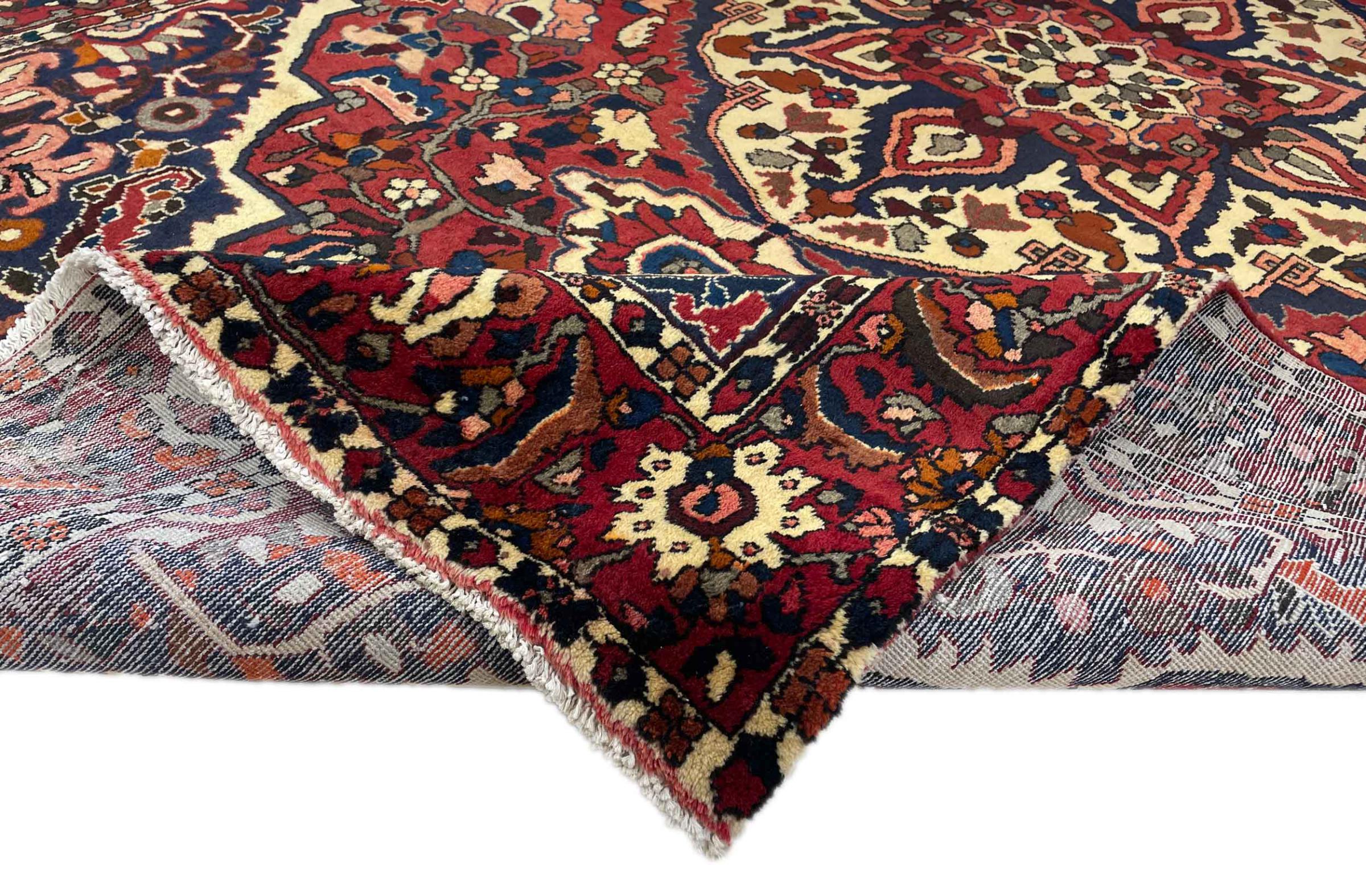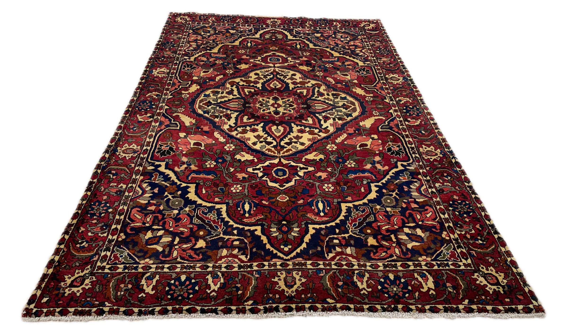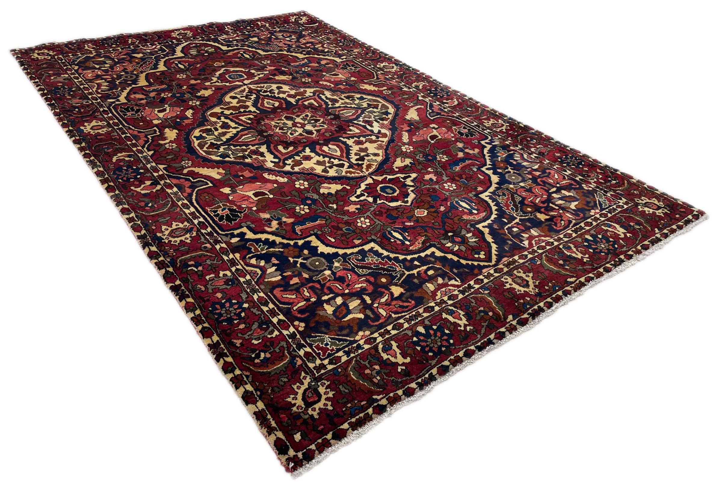 Denna persiska Bakhtiar var handknuten av nomader från Bakhtiari-stammen. Denna persiska matta spelar med färgerna på Orienten i vackra mönster. Utformningen av dess ornament är inspirerad av persiska trädgårdar. Den så kallade traditionella trädgårdsdesignen har blivit mycket populär i den västra världen genom åren. Dess höga knutdensitet i kombination med det starka garnet lovar långvarig glädje av persisk mattekonst.