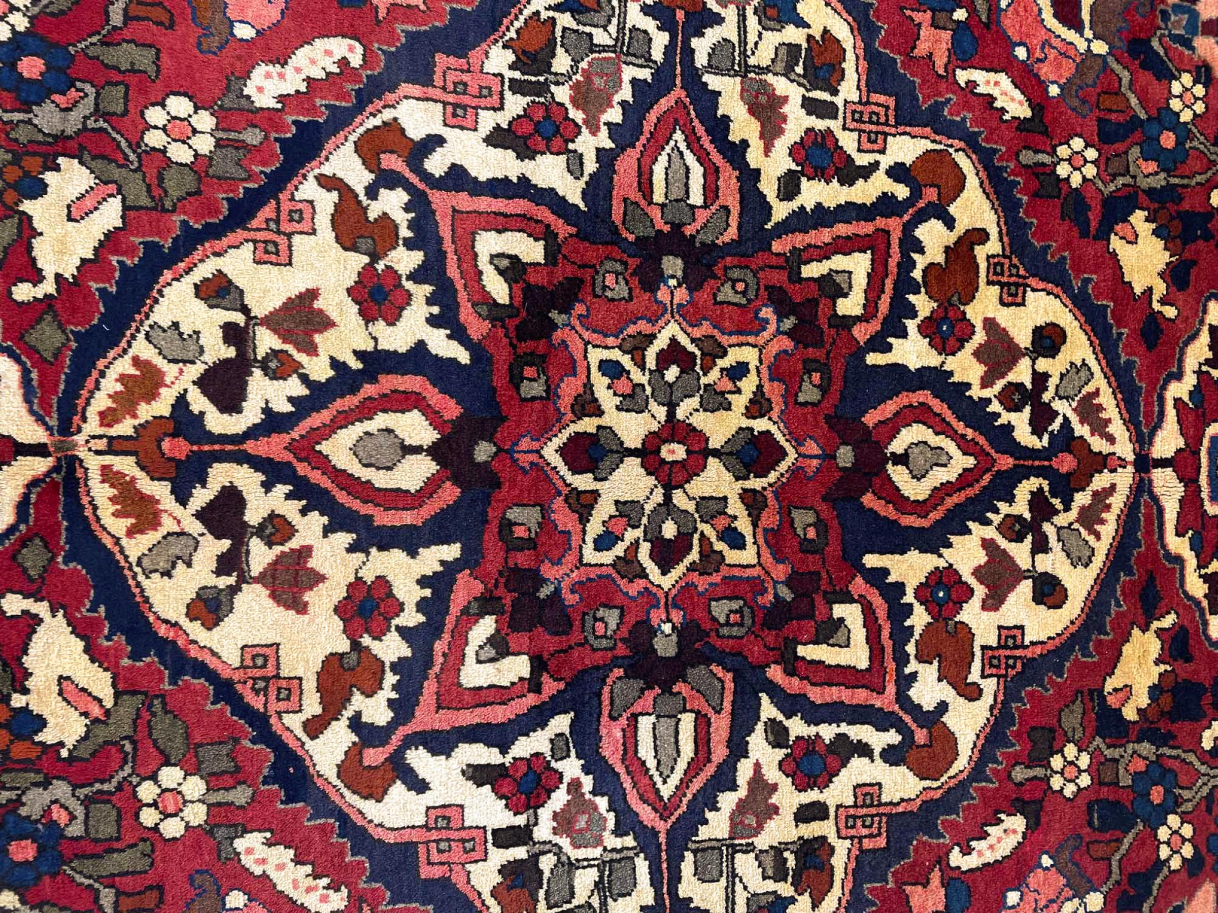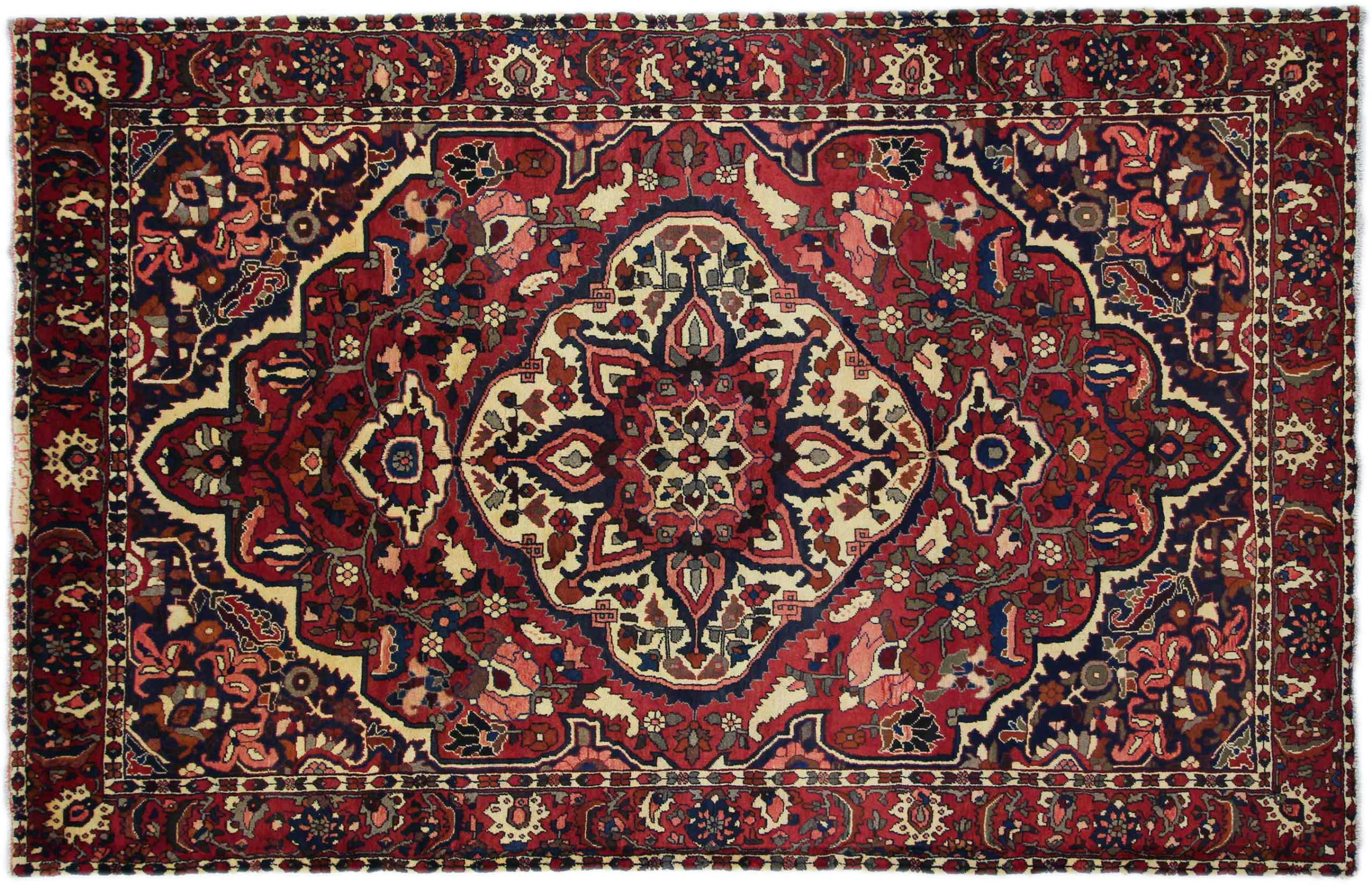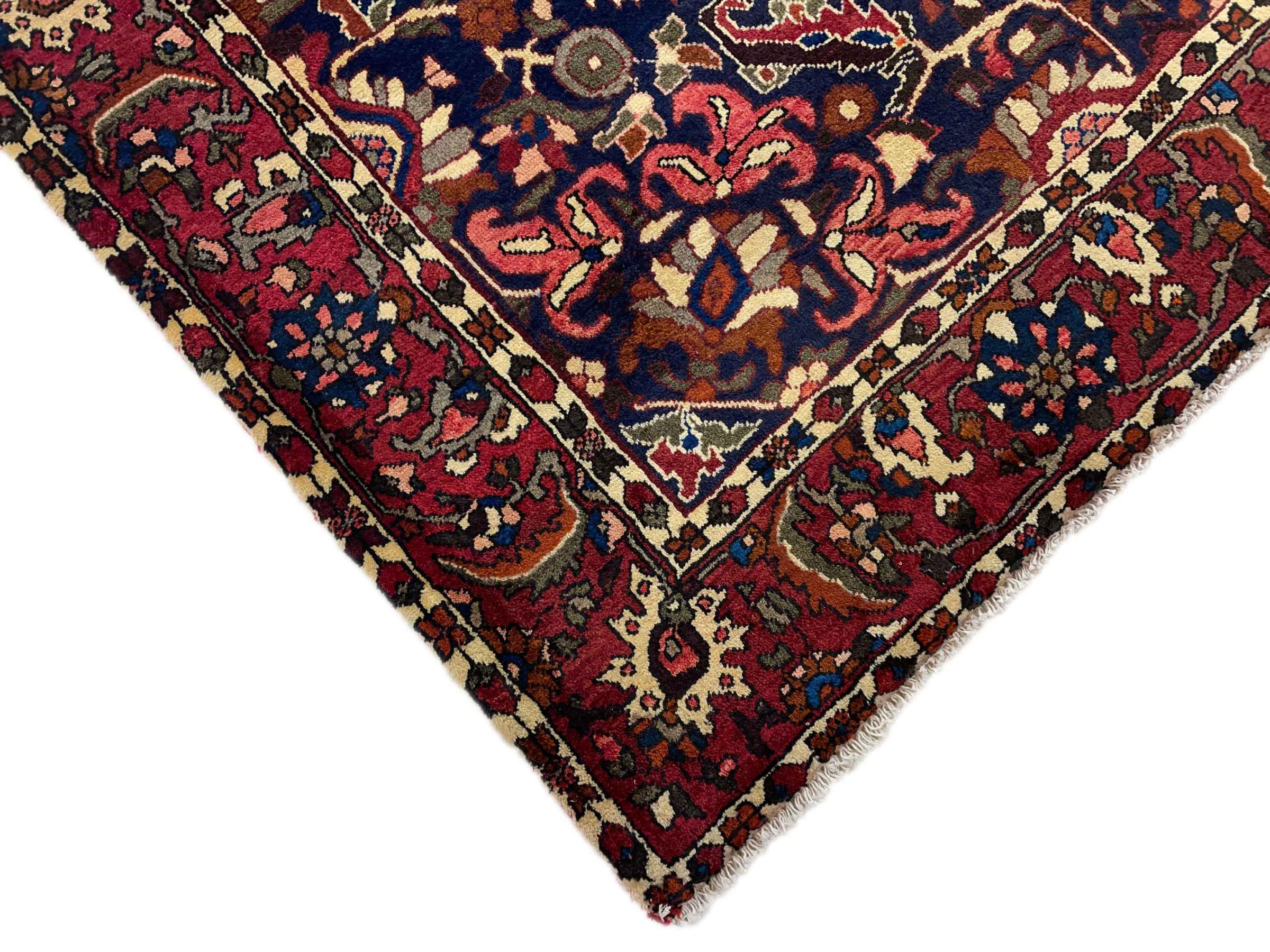 Denna persiska Bakhtiar var handknuten av nomader från Bakhtiari-stammen. Denna persiska matta spelar med färgerna på Orienten i vackra mönster. Utformningen av dess ornament är inspirerad av persiska trädgårdar. Den så kallade traditionella trädgårdsdesignen har blivit mycket populär i den västra världen genom åren. Dess höga knutdensitet i kombination med det starka garnet lovar långvarig glädje av persisk mattekonst.