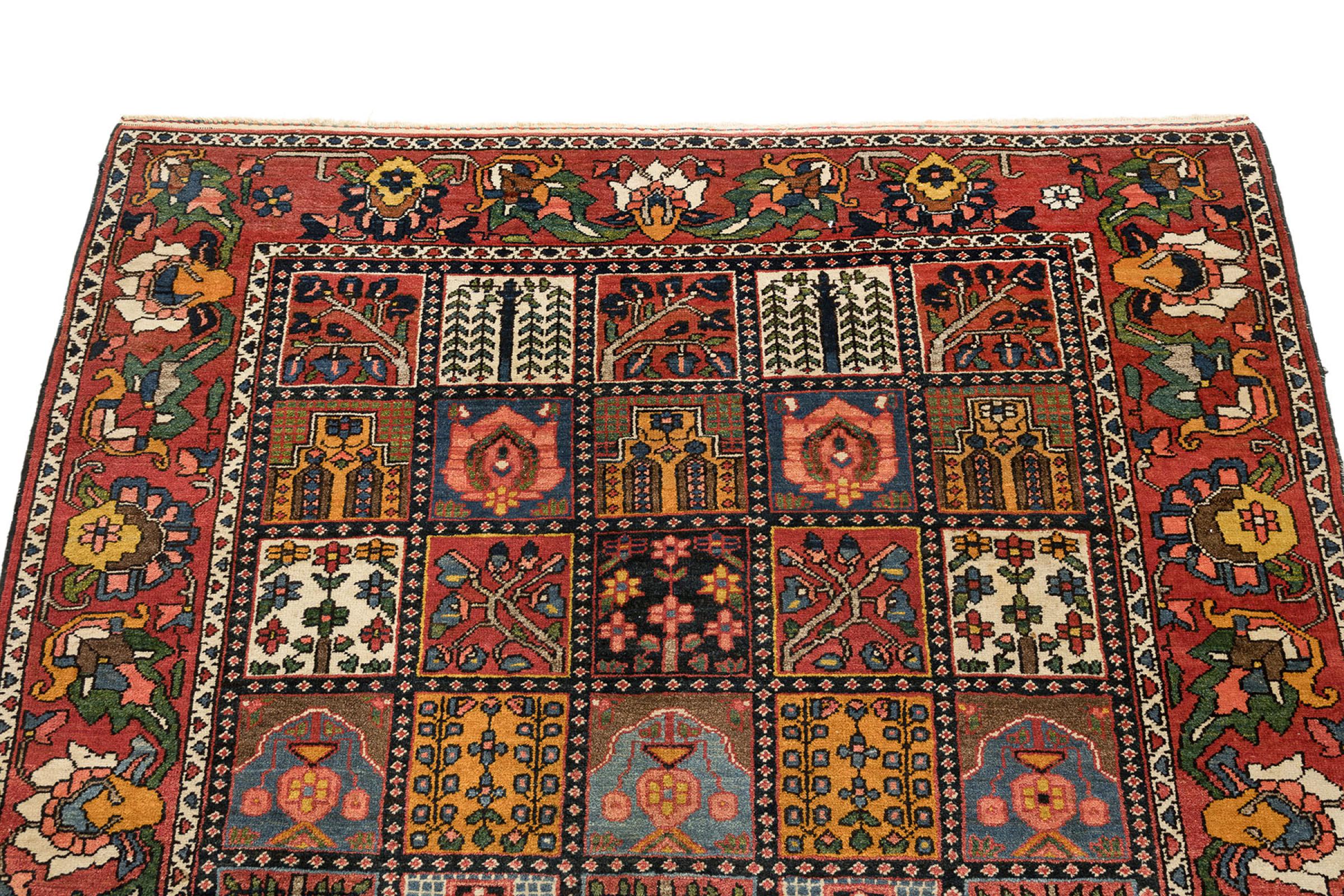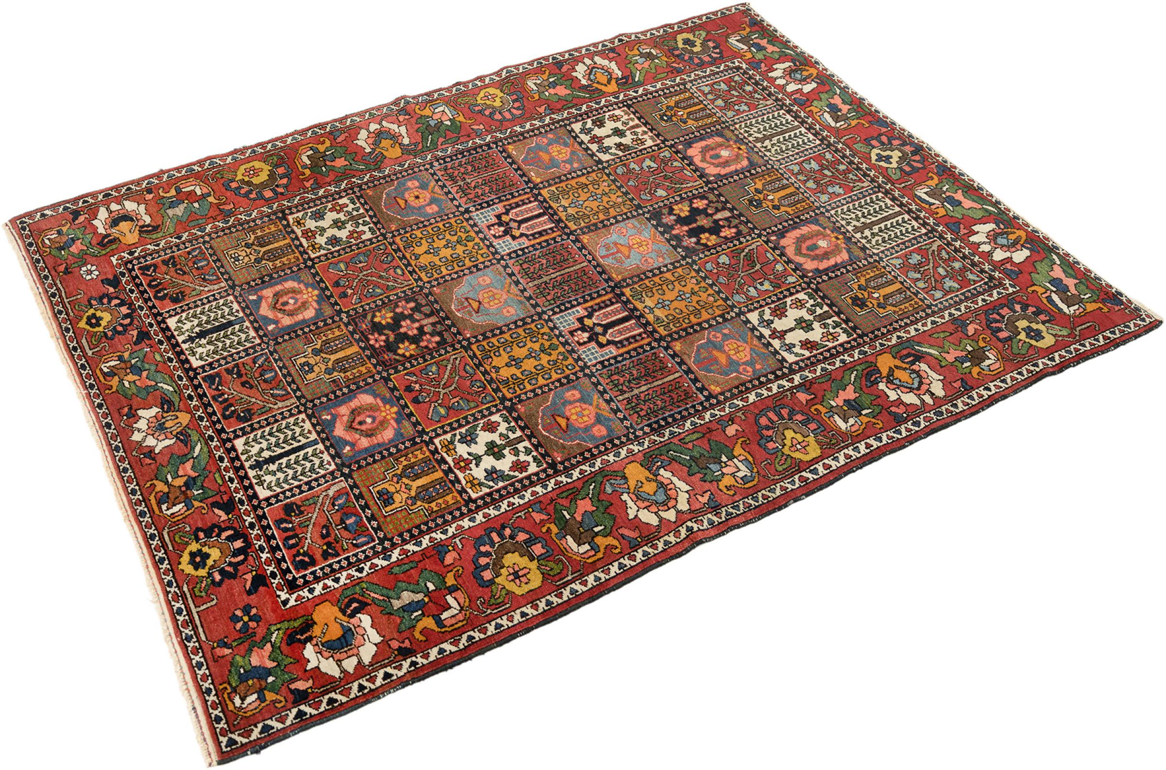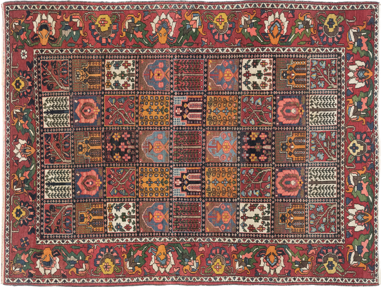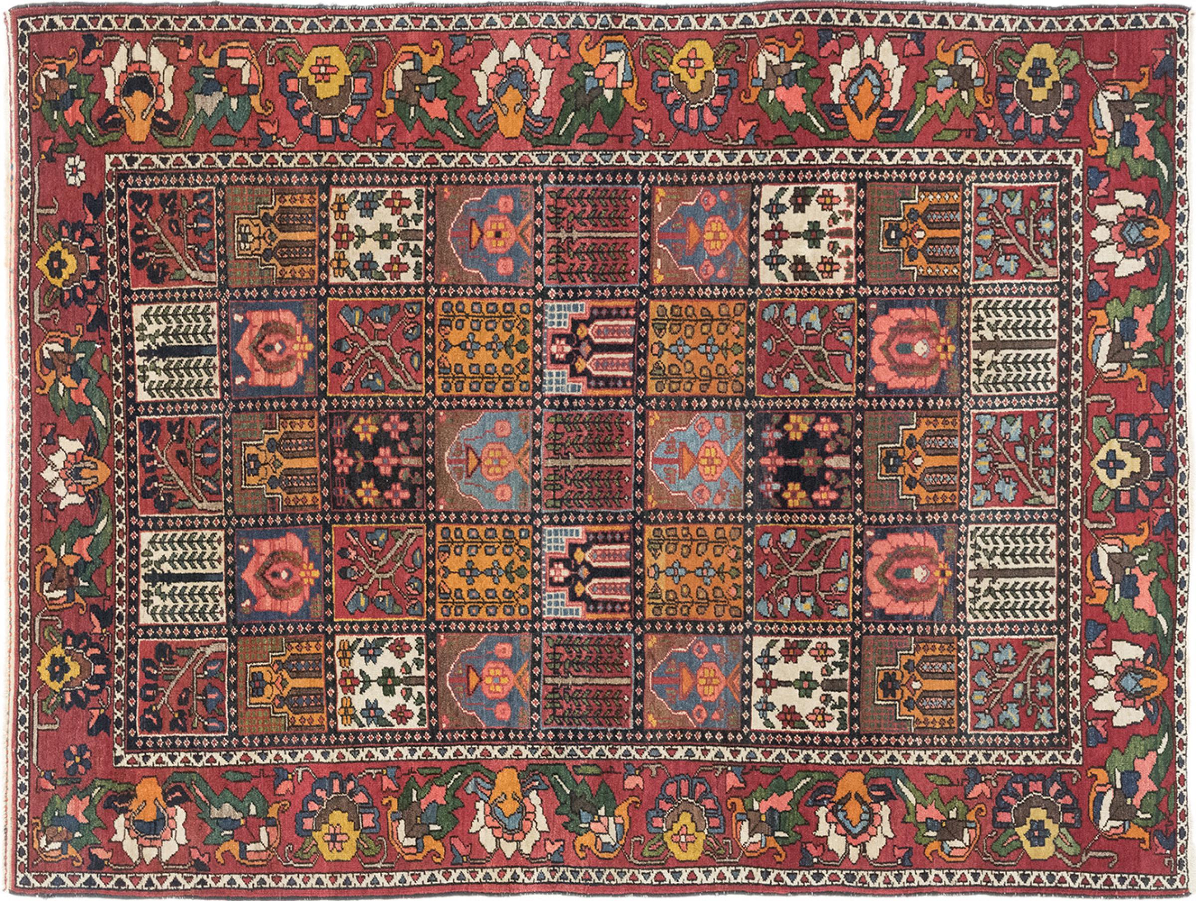 Denna persiska Bakhtiar var handknuten av nomader från Bakhtiari-stammen. Denna persiska matta spelar med färgerna på Orienten i vackra mönster. Utformningen av dess ornament är inspirerad av persiska trädgårdar. Den så kallade traditionella trädgårdsdesignen har blivit mycket populär i den västra världen genom åren. Dess höga knutdensitet i kombination med det starka garnet lovar långvarig glädje av persisk mattekonst.
