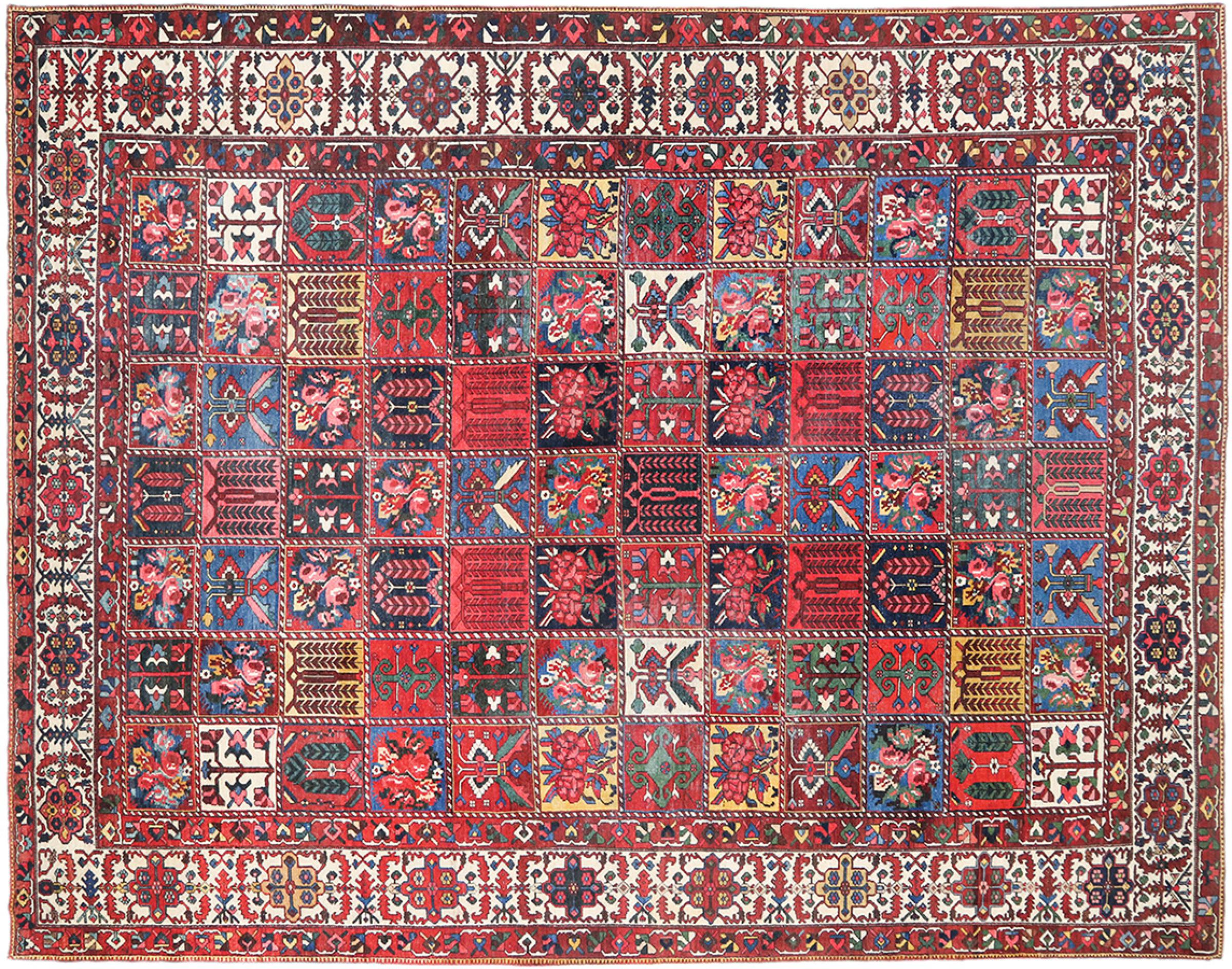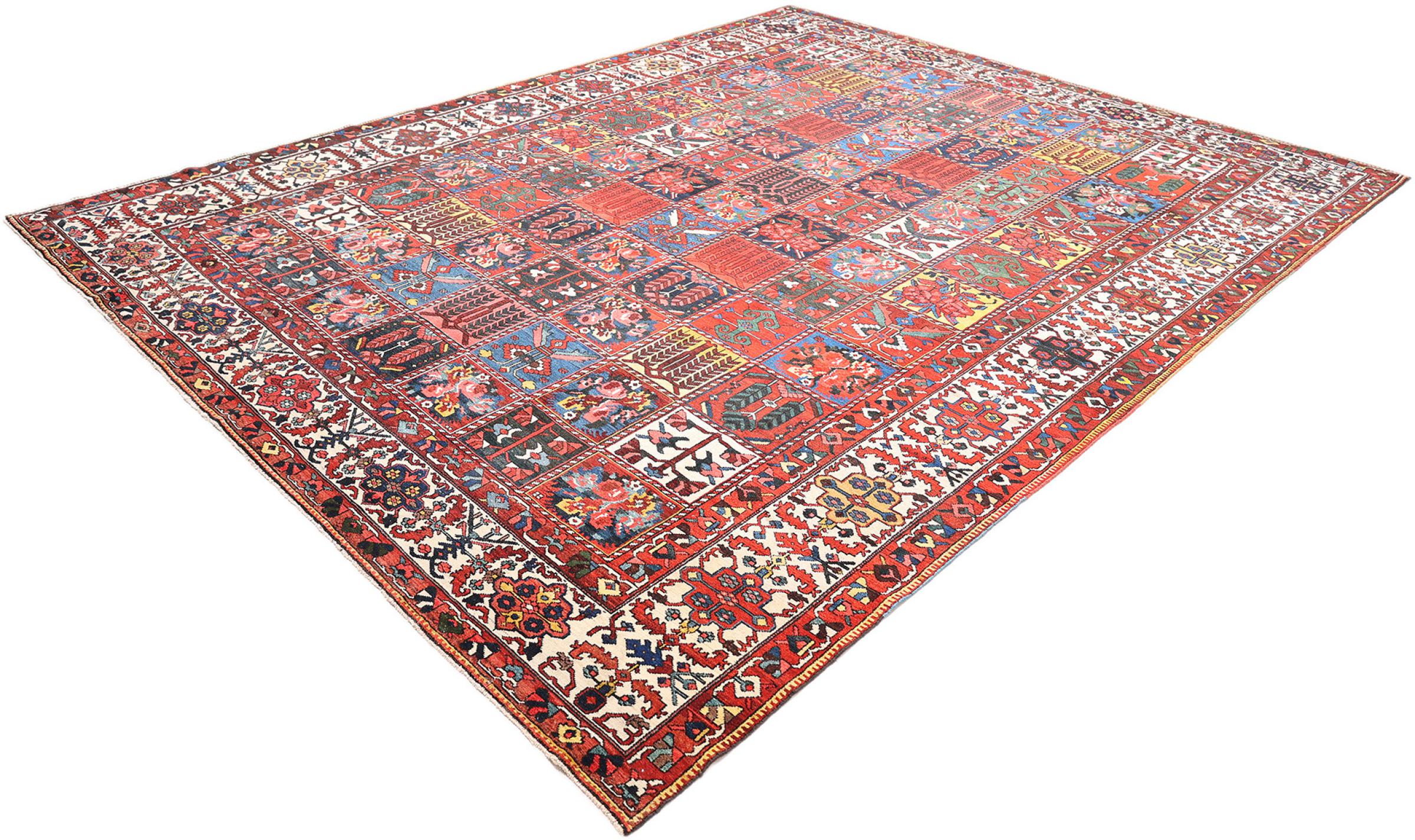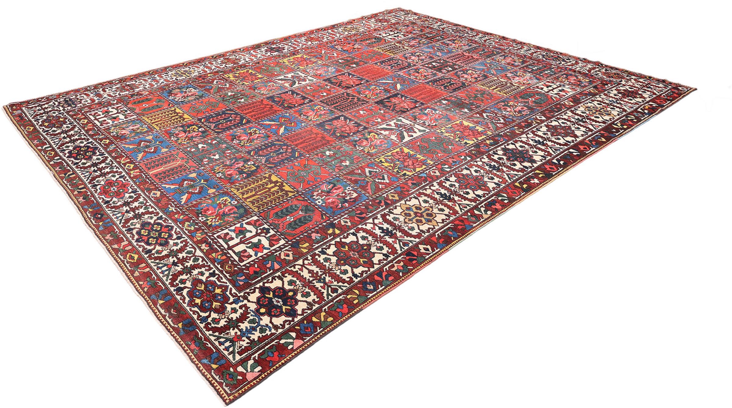 Denna persiska Bakhtiar var handknuten av nomader från Bakhtiari-stammen. Denna persiska matta spelar med färgerna på Orienten i vackra mönster. Utformningen av dess ornament är inspirerad av persiska trädgårdar. Den så kallade traditionella trädgårdsdesignen har blivit mycket populär i den västra världen genom åren. Dess höga knutdensitet i kombination med det starka garnet lovar långvarig glädje av persisk mattekonst.