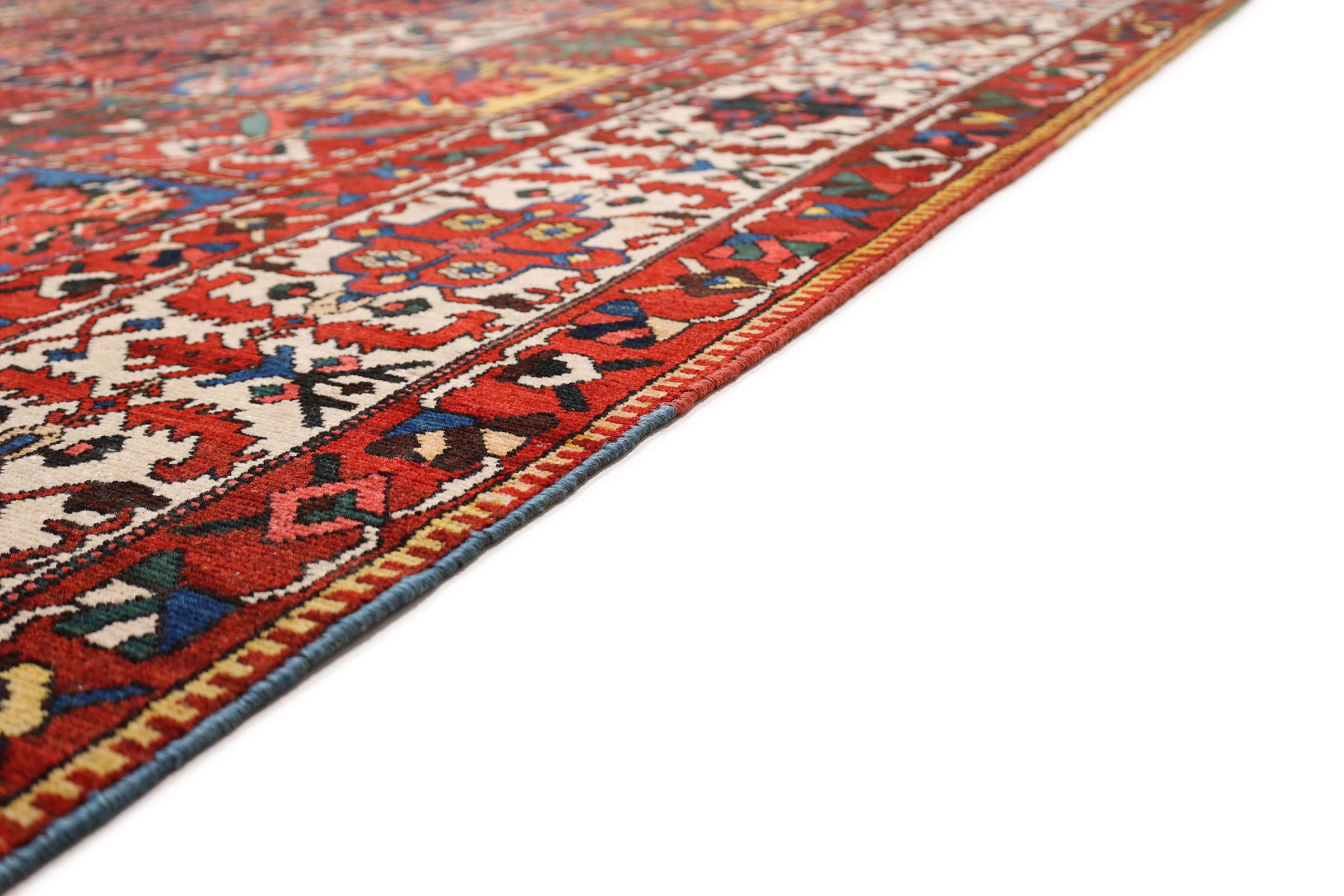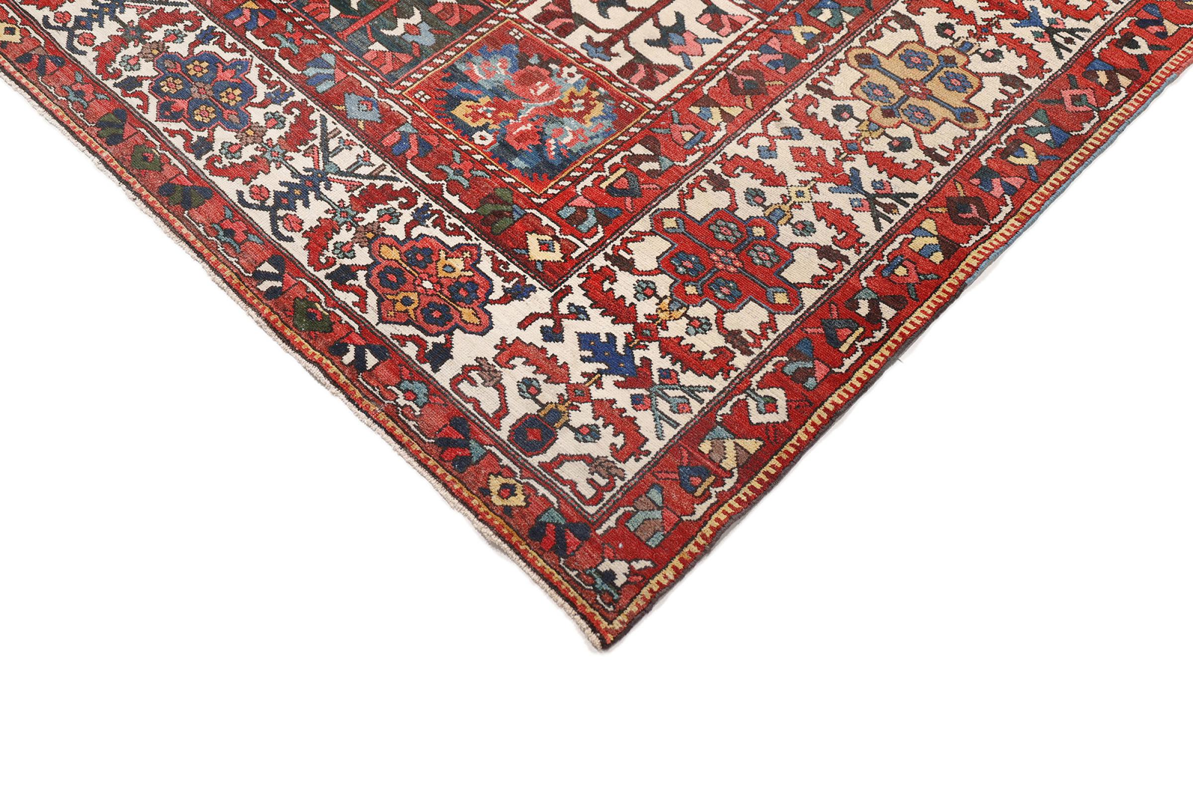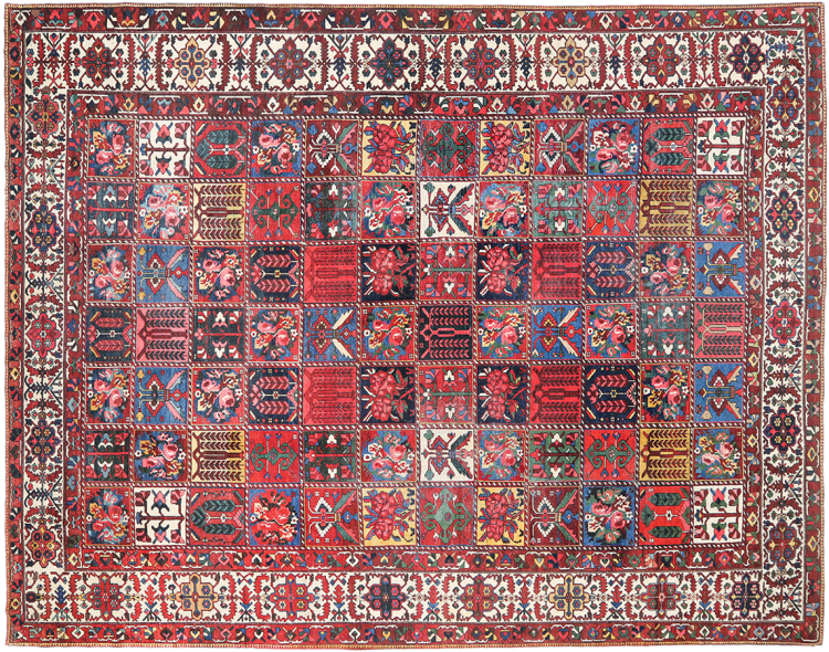 Denna persiska Bakhtiar var handknuten av nomader från Bakhtiari-stammen. Denna persiska matta spelar med färgerna på Orienten i vackra mönster. Utformningen av dess ornament är inspirerad av persiska trädgårdar. Den så kallade traditionella trädgårdsdesignen har blivit mycket populär i den västra världen genom åren. Dess höga knutdensitet i kombination med det starka garnet lovar långvarig glädje av persisk mattekonst.