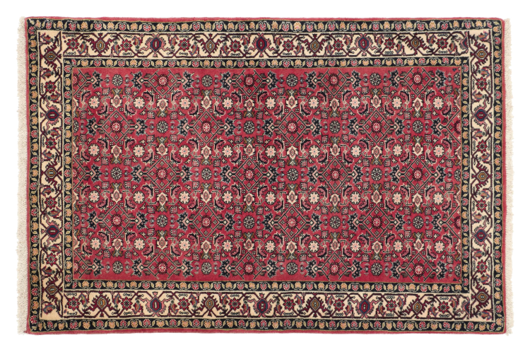 Mattans ID: 309501003643952 Storlek: 139x89 cm Tjocklek: ap. 15 mm Knuttäthet: 200 000 - 250 000 / m² Tillverkning: Knuten för hand Lugg: Handspunnen ull Varp: Bomull Ursprung: Persien / Iran Ålder: Ny Vikt: ap. 6 kg I lager: Unik - Endast 1 i lager