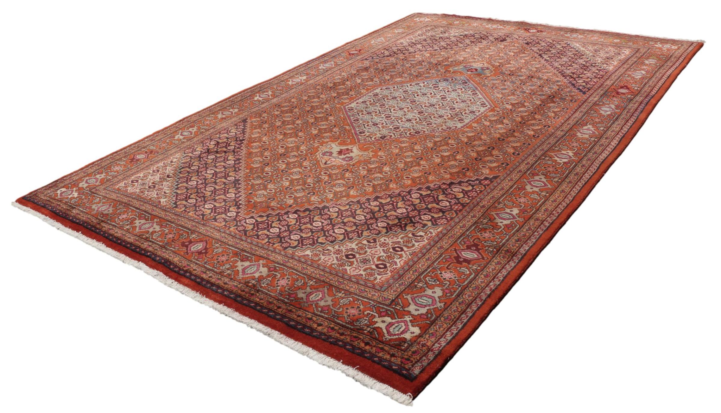 Mattans ID: 309579005537286 Storlek: 299x197 cm Tjocklek: ap. 15 mm Knuttäthet: 200 000 - 250 000 / m² Tillverkning: Knuten för hand Lugg: Handspunnen ull Varp: Bomull Ursprung: Persien / Iran Ålder: Gammal/Halvantik, äldre än 50 år Vikt: ap. 29 kg I lager: Unik - Endast 1 i lager