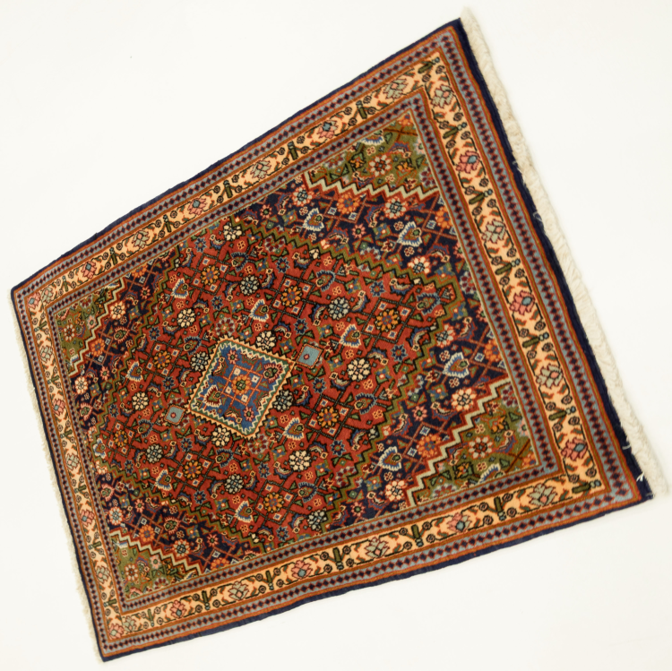 Mattans ID: 313337001965836 Storlek: 99x69 cm Tjocklek: ap. 15 mm Knuttäthet: 120 000 - 150 000 / m² Tillverkning: Knuten för hand Lugg: Handspunnen ull Varp: Bomull Ursprung: Persien / Iran Ålder: Ny Vikt: ap. 3 kg I lager: Unik - Endast 1 i lager
