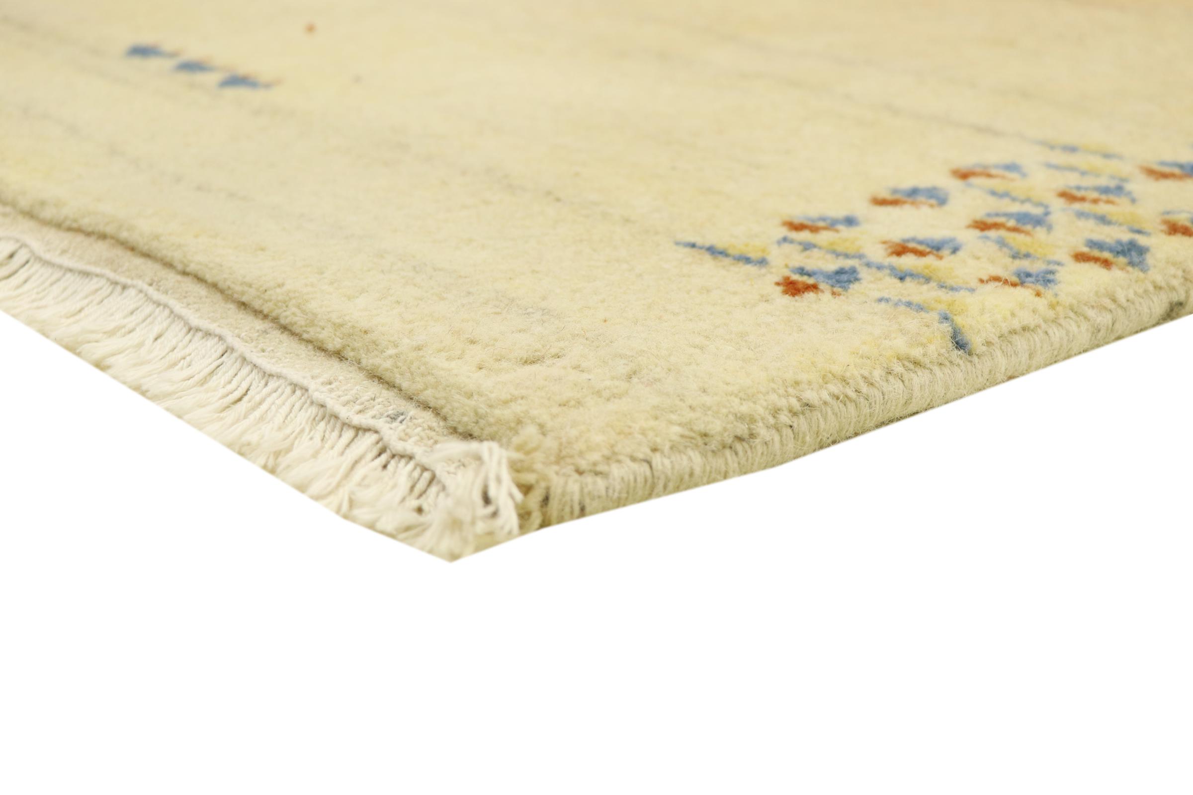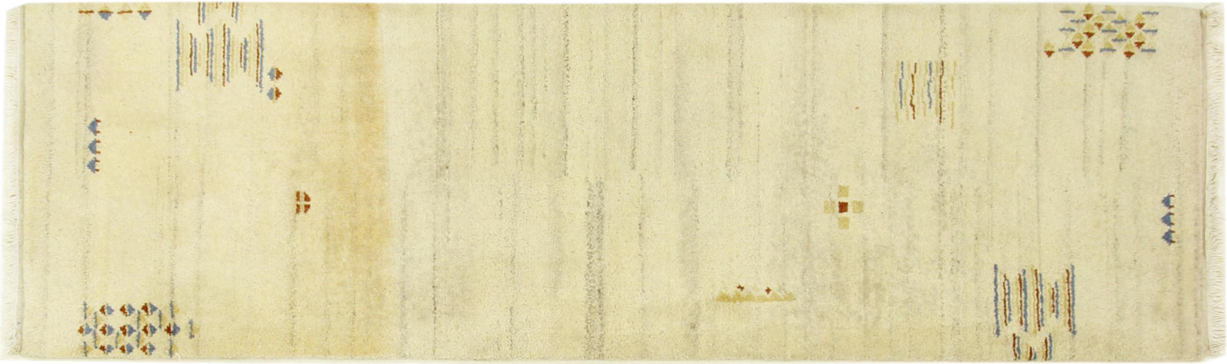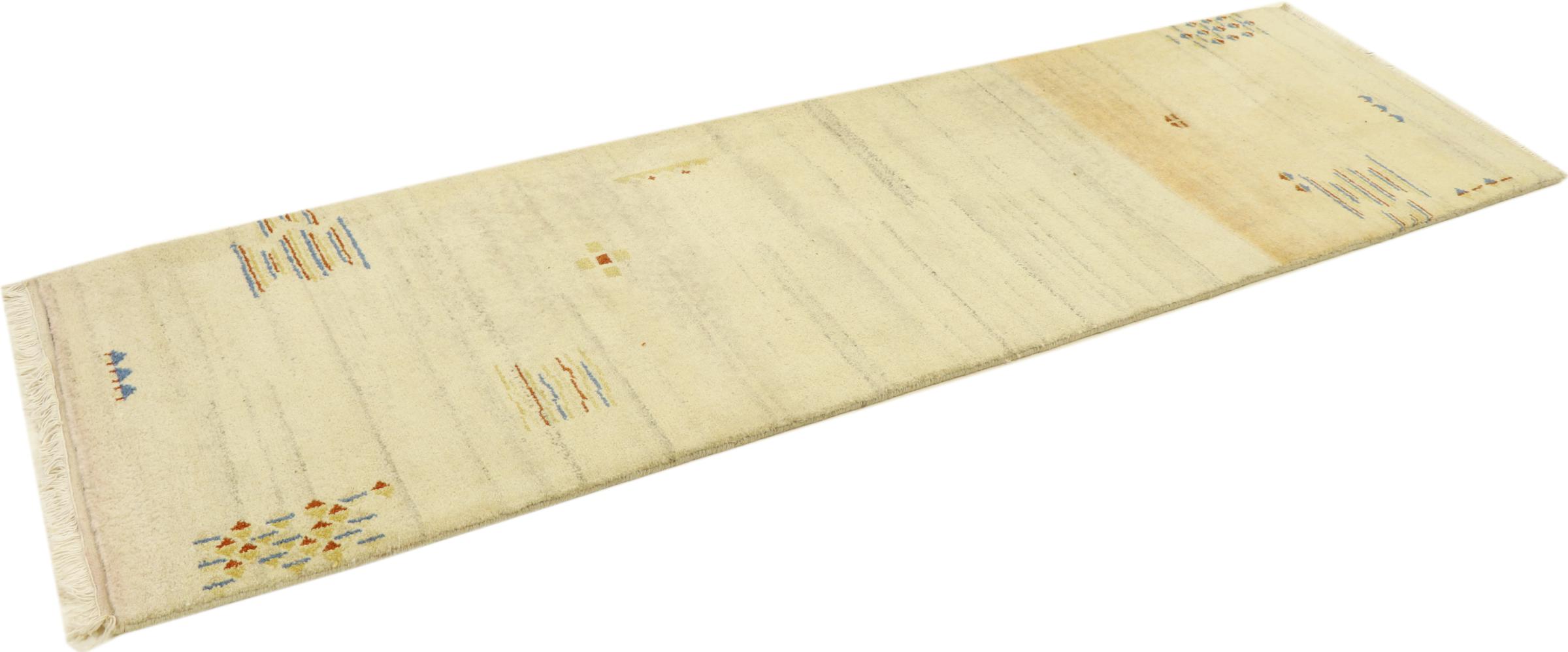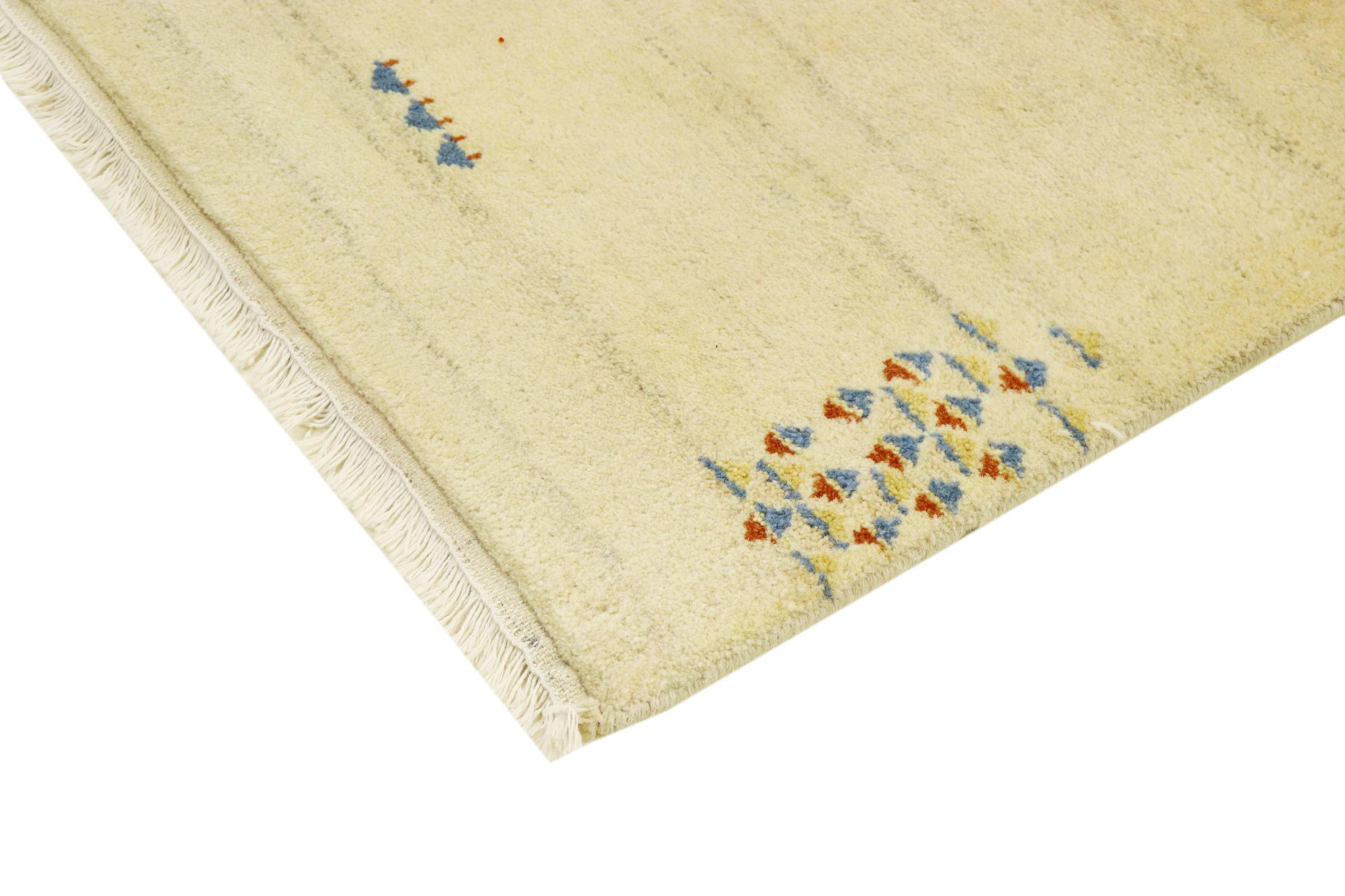 Denna vackra Gabbeh-matta var handknuten i Indien. Indiska Gabbeh-mattor är gjorda av mjuk fårull, är trevliga på fötterna och har värmeisolerande egenskaper. De flesta av deras mönster är enkla och tidlösa moderna. De inspirerades av nomadiska folk som låter mycket enkla motiv från omgivningen passera in i mattorna. Indiska Gabbeh-mattor matchar inte riktigt kvaliteten på en persisk Gabbeh, men de har ett mycket bra pris-prestanda-förhållande. Detta gör dem idealiska som en handknuten matta på entréplan.