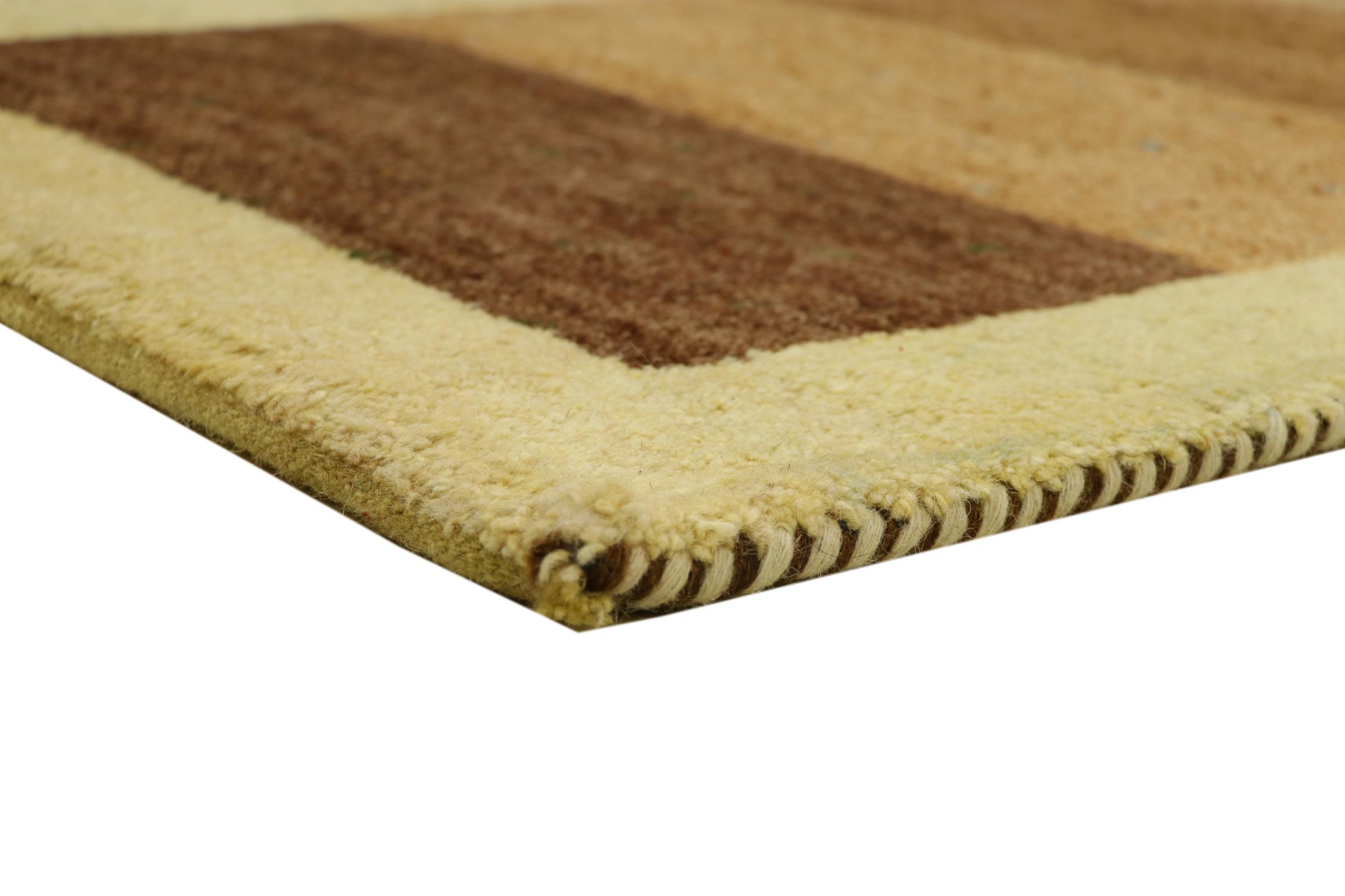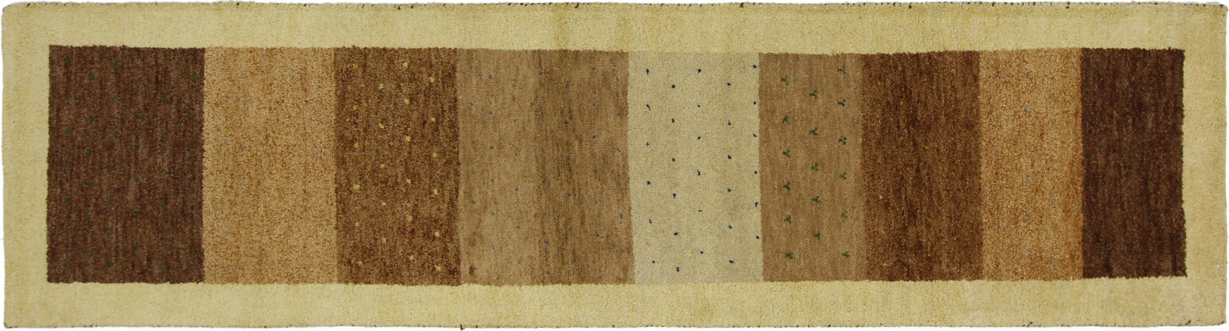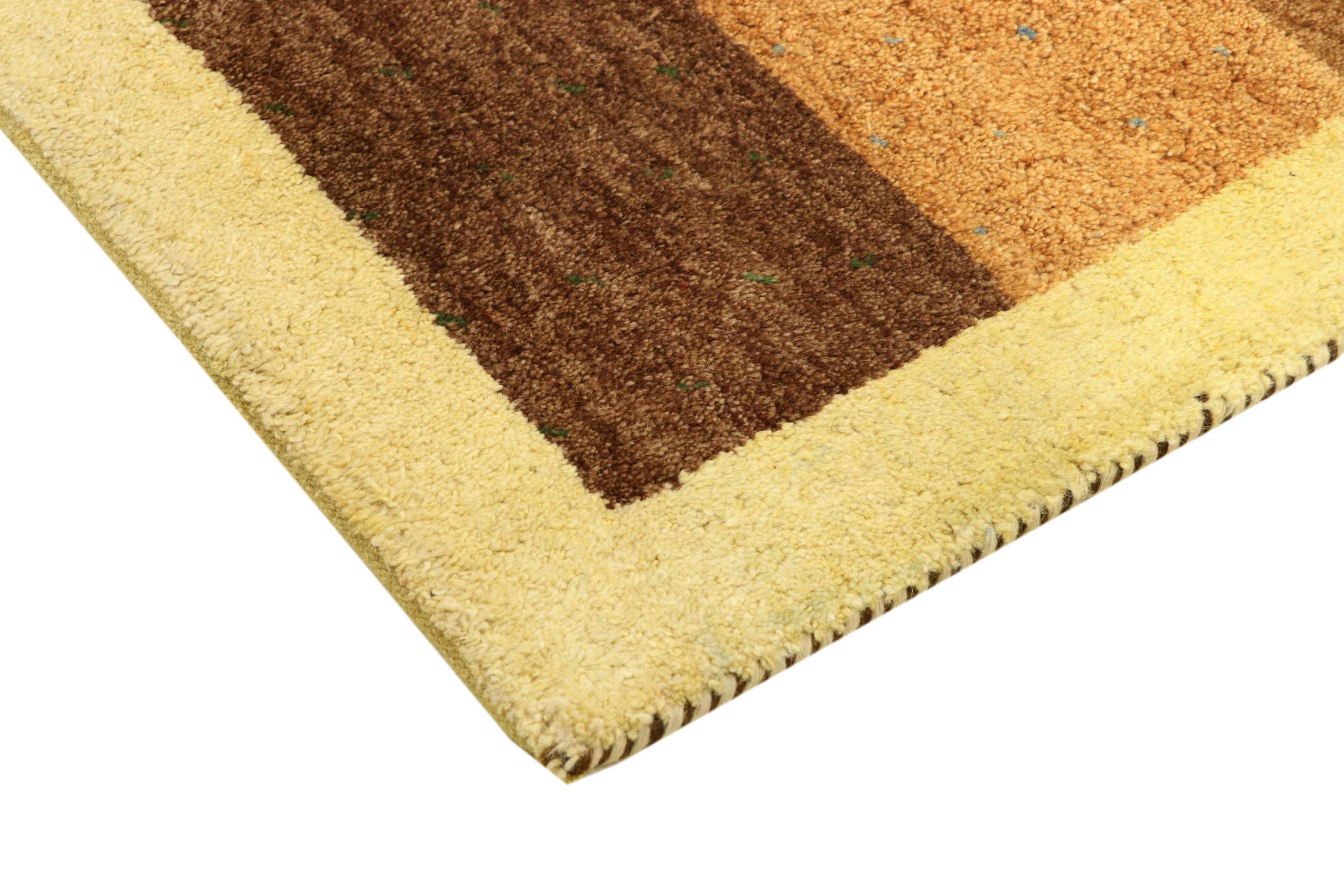 Denna vackra Gabbeh-matta var handknuten i Indien. Indiska Gabbeh-mattor är gjorda av mjuk fårull, är trevliga på fötterna och har värmeisolerande egenskaper. De flesta av deras mönster är enkla och tidlösa moderna. De inspirerades av nomadiska folk som låter mycket enkla motiv från omgivningen passera in i mattorna. Indiska Gabbeh-mattor matchar inte riktigt kvaliteten på en persisk Gabbeh, men de har ett mycket bra pris-prestanda-förhållande. Detta gör dem idealiska som en handknuten matta på entréplan.