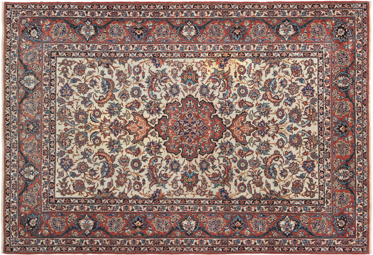 Mattans ID: 310027001506041 Storlek: 211x146 cm Tjocklek: ap. 6 mm Knuttäthet: 1 000 000 / m² Tillverkning: Knuten för hand Lugg: Ull med silke Varp: Bomull Skick / Bevarande: Perfekt Ursprung: Persien / Iran Ålder: Antik, äldre än 80 år Vikt: ap. 9 kg I lager: Unik - Endast 1 i lager