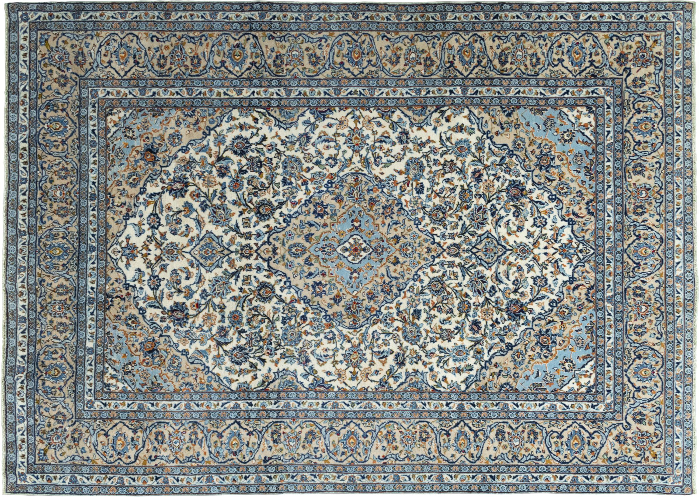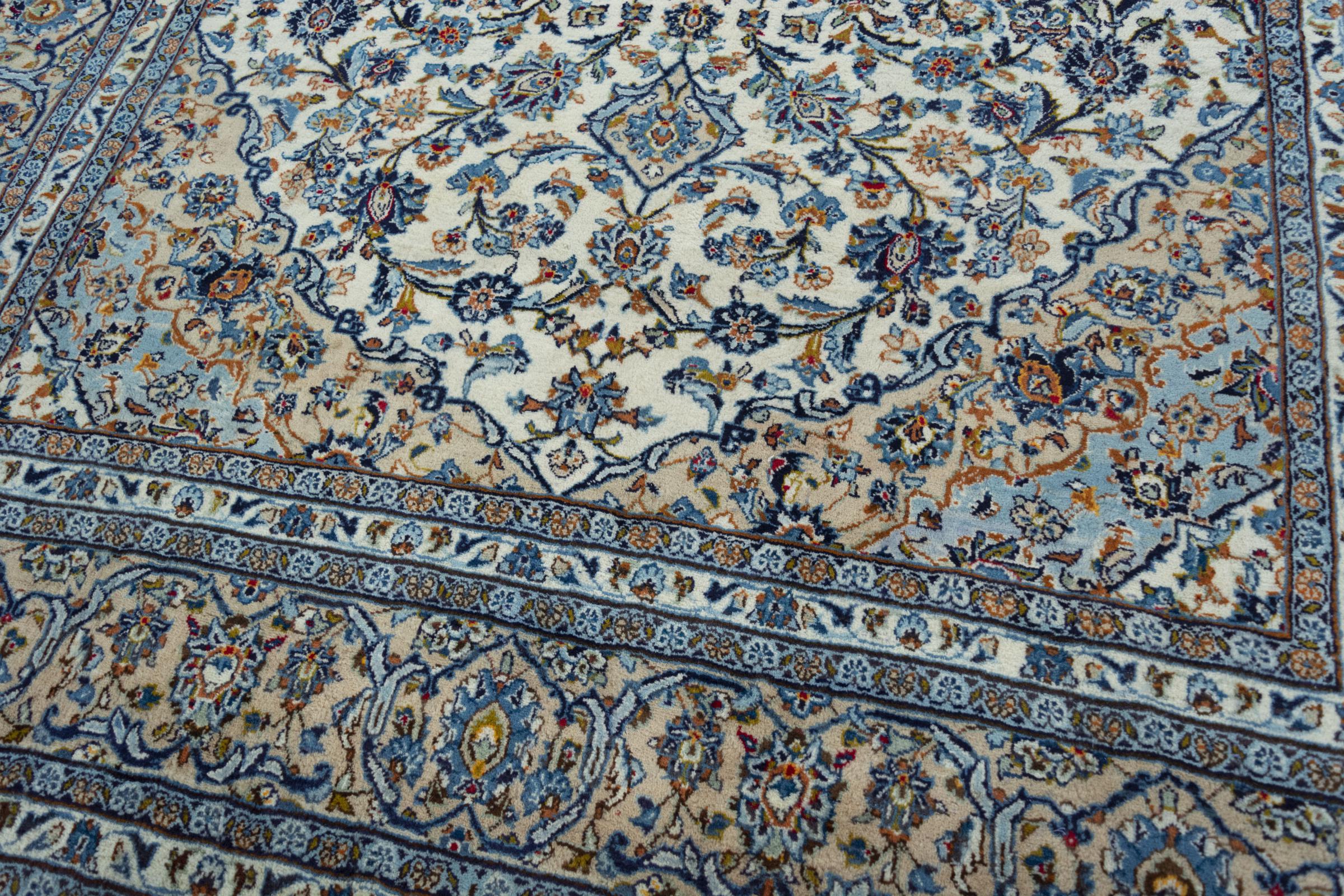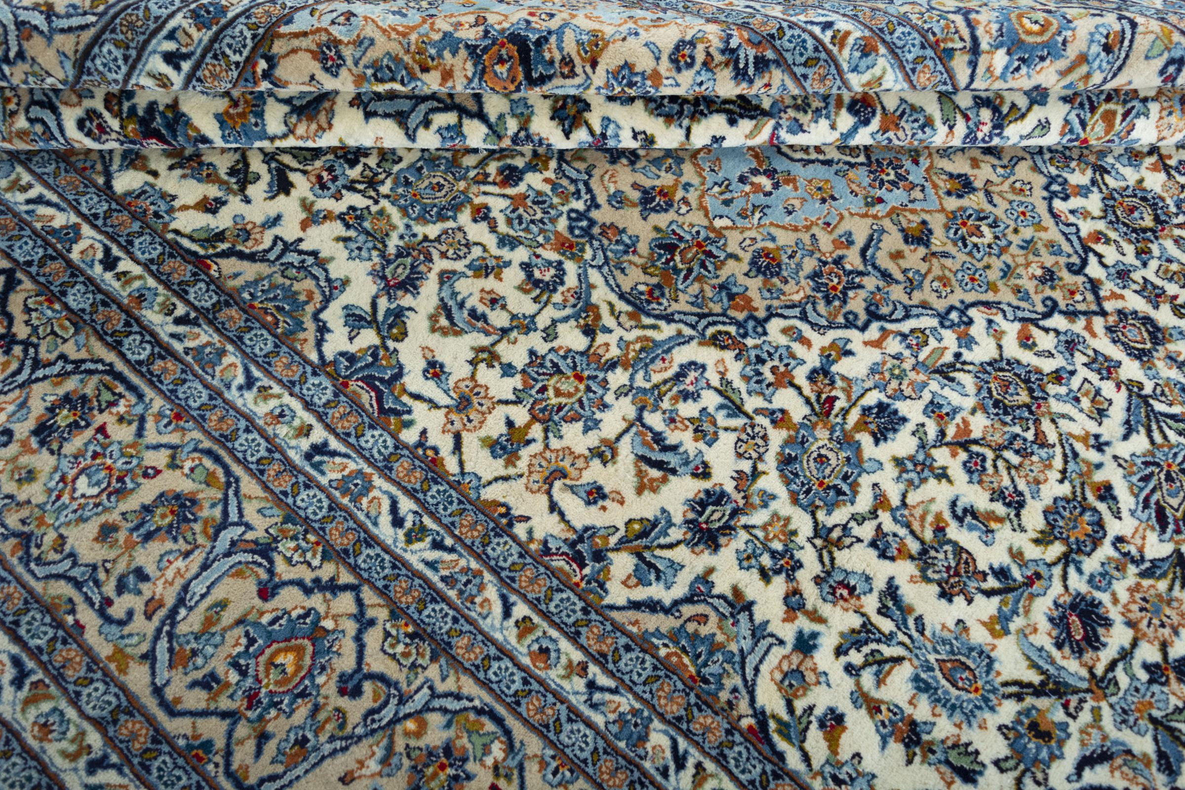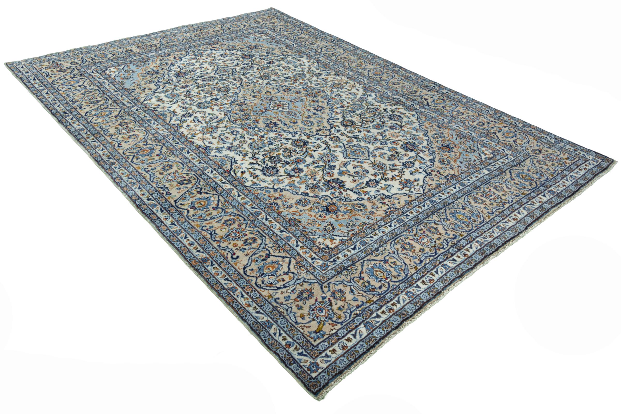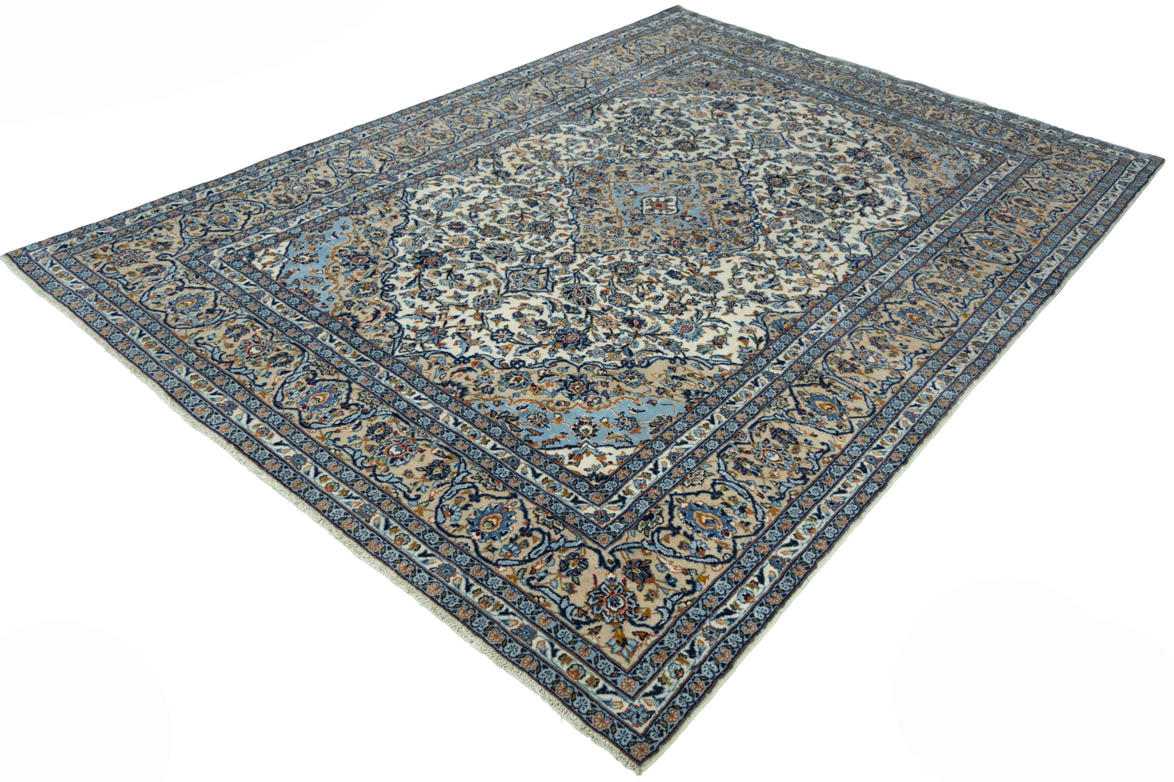 Denna matta från Kashan (Keshan) hålls i sin mycket traditionella och typiska persiska design med vackra ornament. Kashan-mattor är mycket populära på grund av sin exceptionellt eleganta design. Dessa mattor kommer från Kashan, en stad på den antika sidenvägen. Denna matta har knutens för hand av högkvalitativ fårull och kommer att bli en unik höjdpunkt i ditt hem.