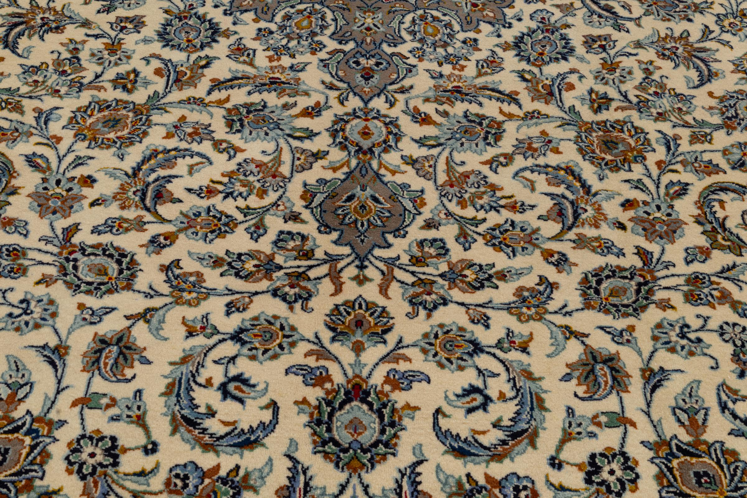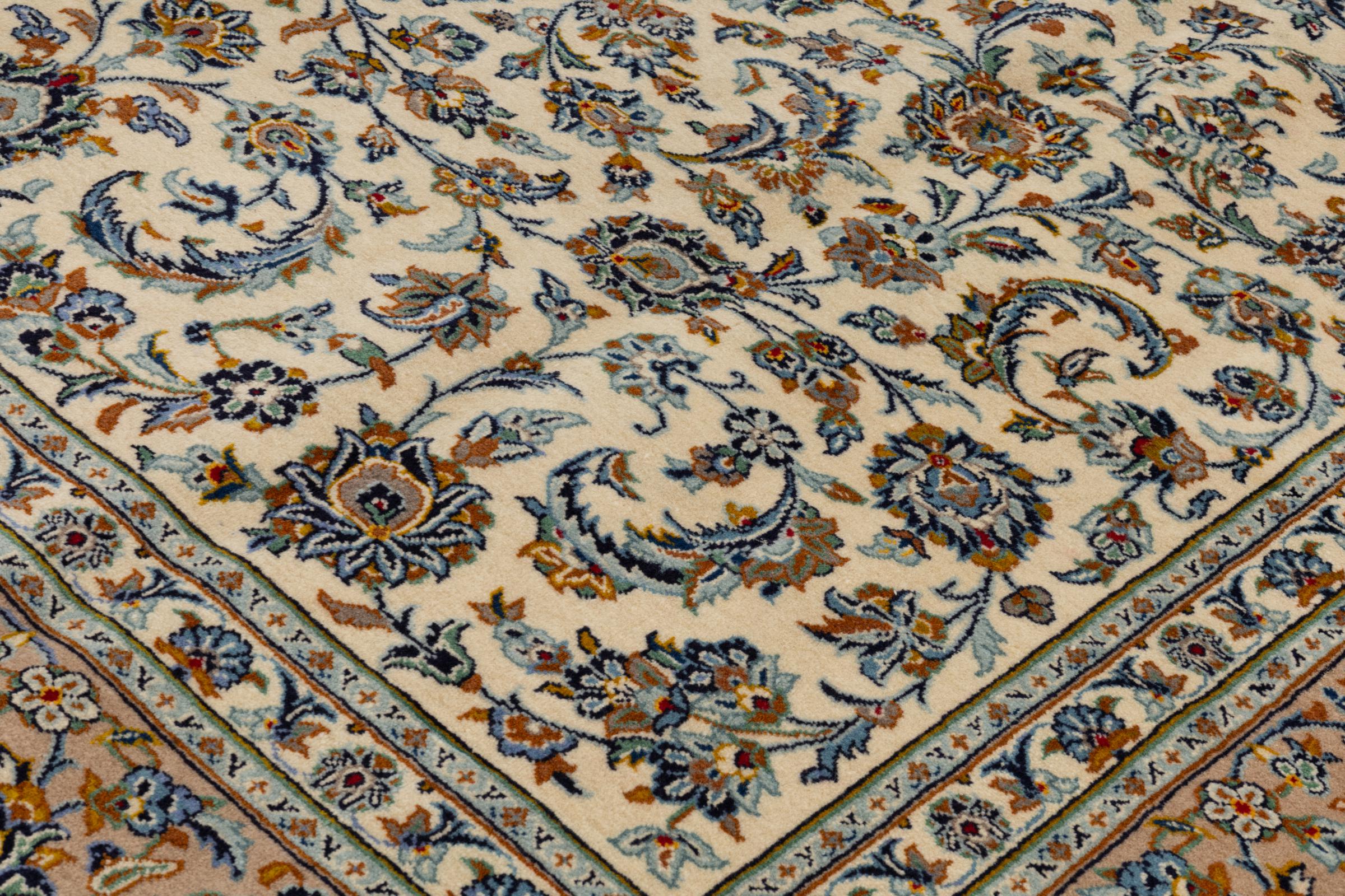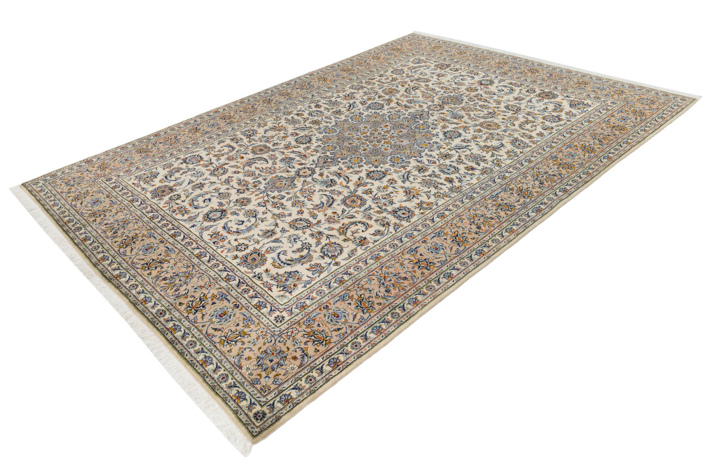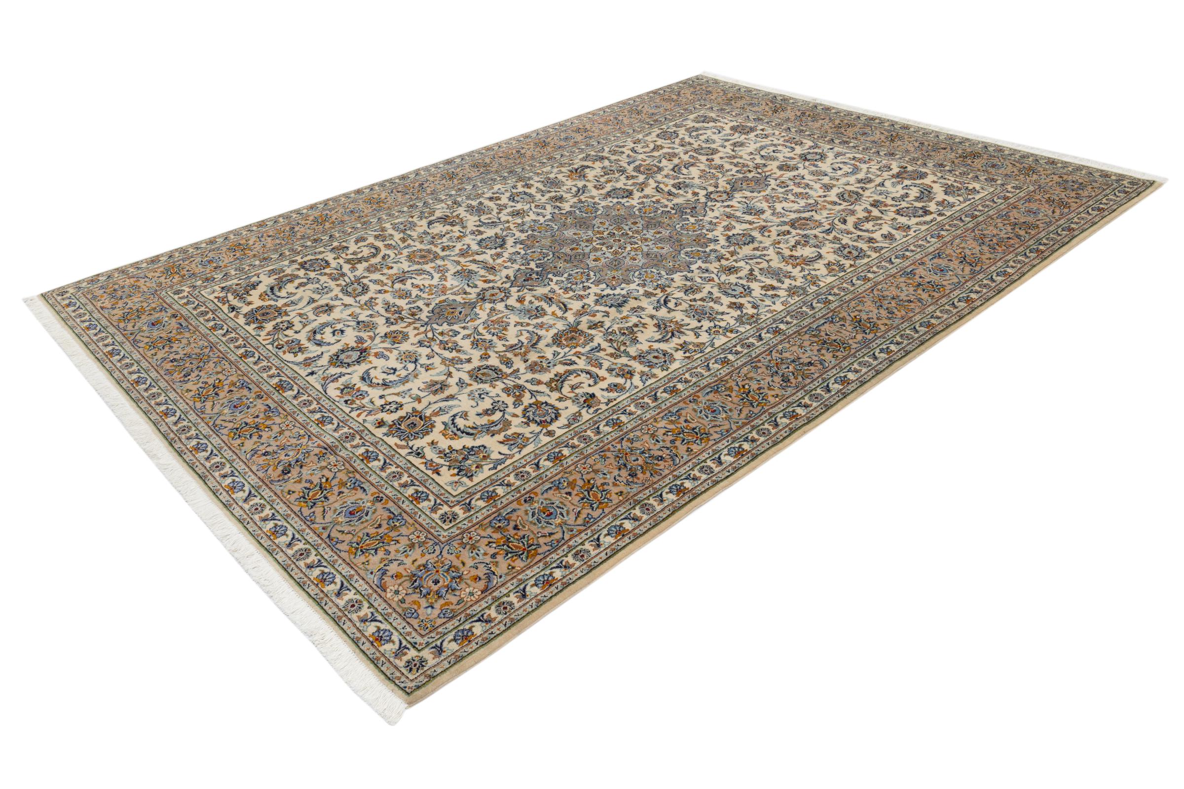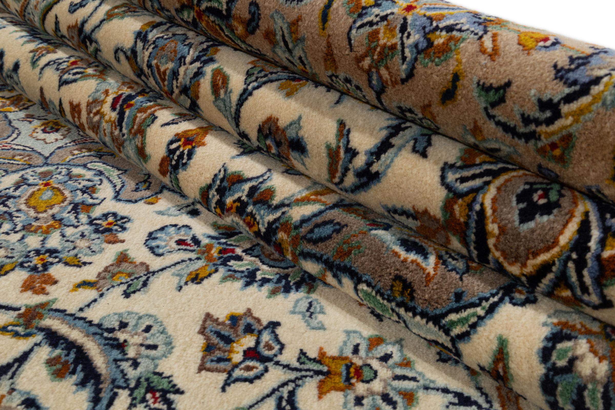 Denna matta från Kashan (Keshan) hålls i sin mycket traditionella och typiska persiska design med vackra ornament. Kashan-mattor är mycket populära på grund av sin exceptionellt eleganta design. Dessa mattor kommer från Kashan, en stad på den antika sidenvägen. Denna matta har knutens för hand av högkvalitativ fårull och kommer att bli en unik höjdpunkt i ditt hem.