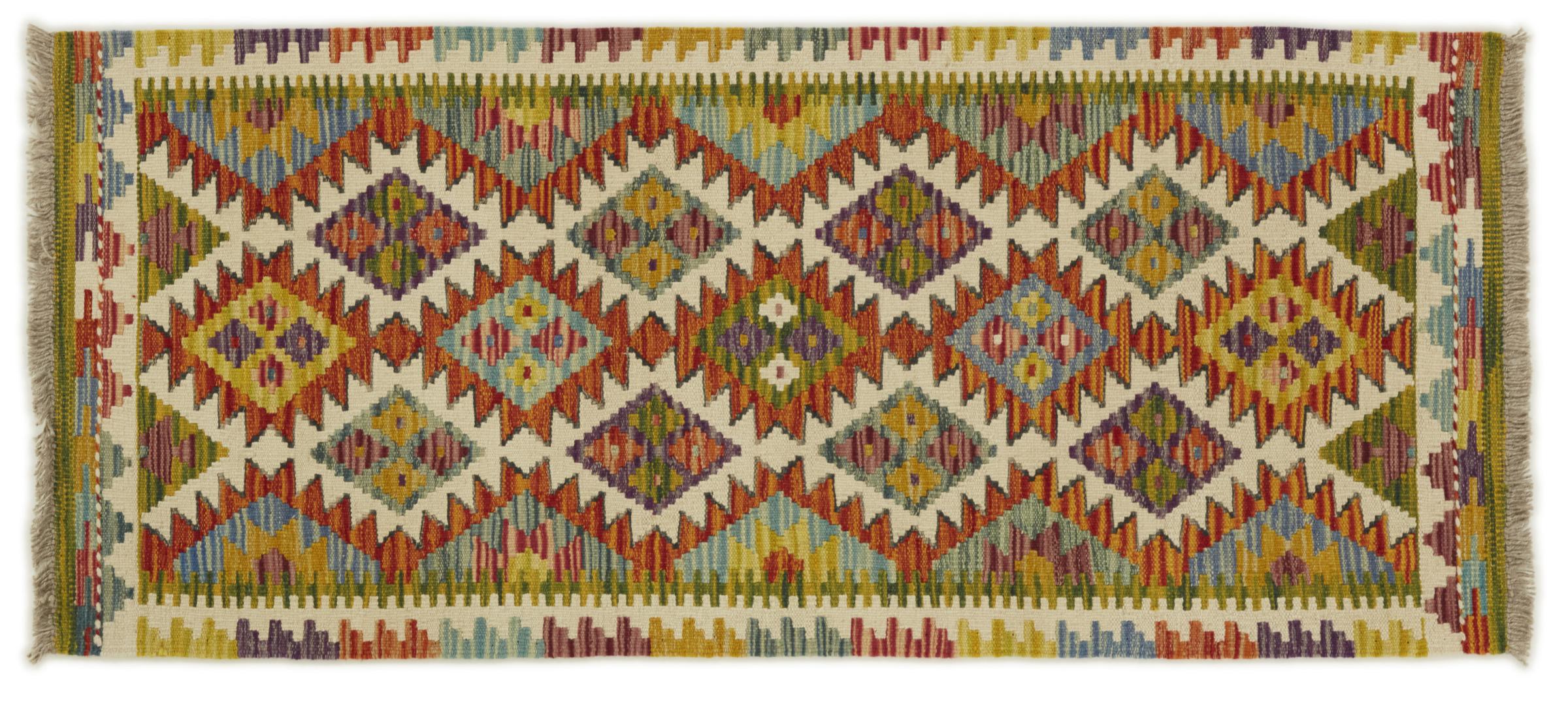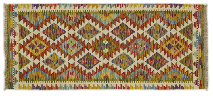 Denna handvävda kelim afghan är vacker tack vare de mångfacetterade färgerna och det typiska mönstret. Den var handvävd i Afghanistan av 100 % fårull. Den är utan tvekan mer robust och hållbar än maskintillverkade mattor. Dessutom har denna kelim en alldeles egen karaktär. En unik pjäs för dig och ditt hem som du aldrig kommer att hitta igen.