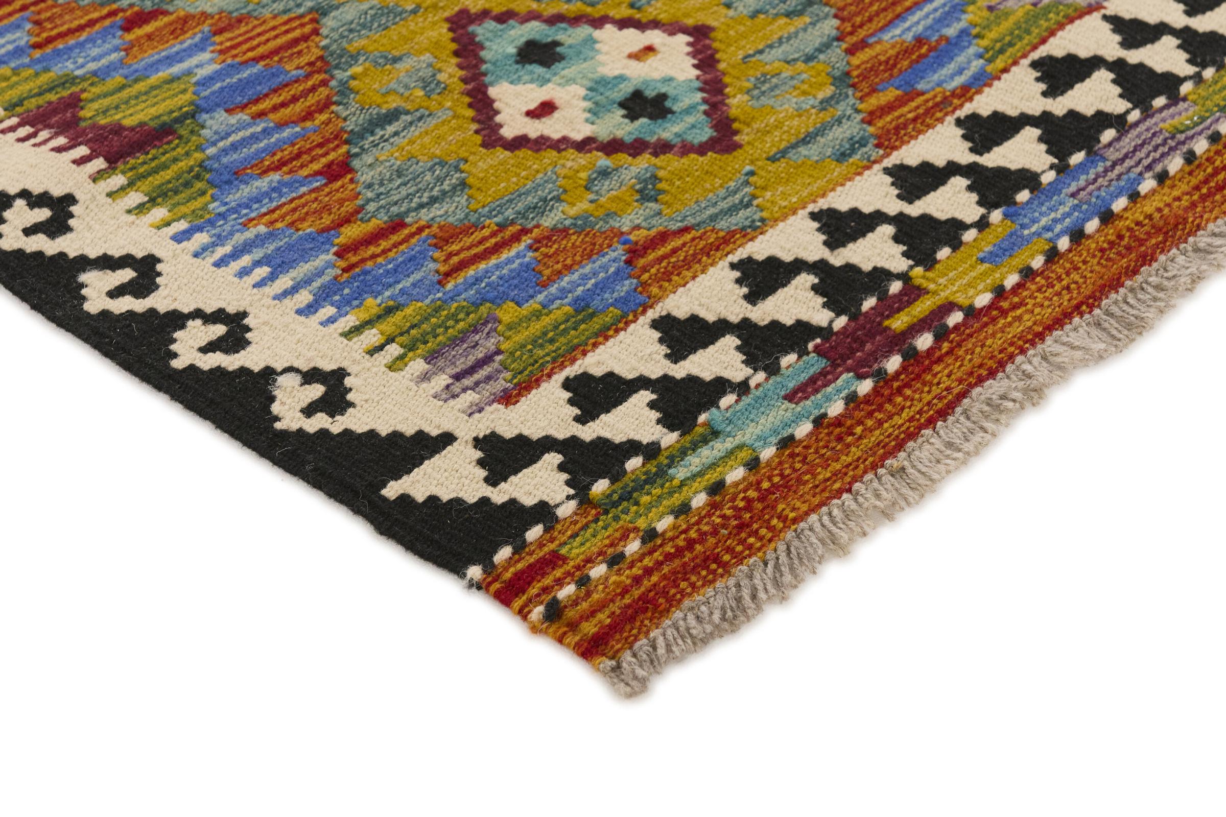 Denna handvävda kelim afghan är vacker tack vare de mångfacetterade färgerna och det typiska mönstret. Den var handvävd i Afghanistan av 100 % fårull. Den är utan tvekan mer robust och hållbar än maskintillverkade mattor. Dessutom har denna kelim en alldeles egen karaktär. En unik pjäs för dig och ditt hem som du aldrig kommer att hitta igen.
