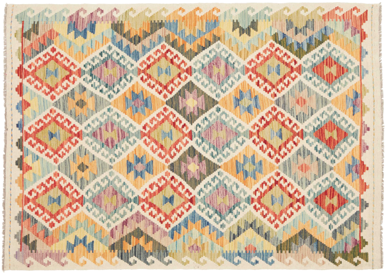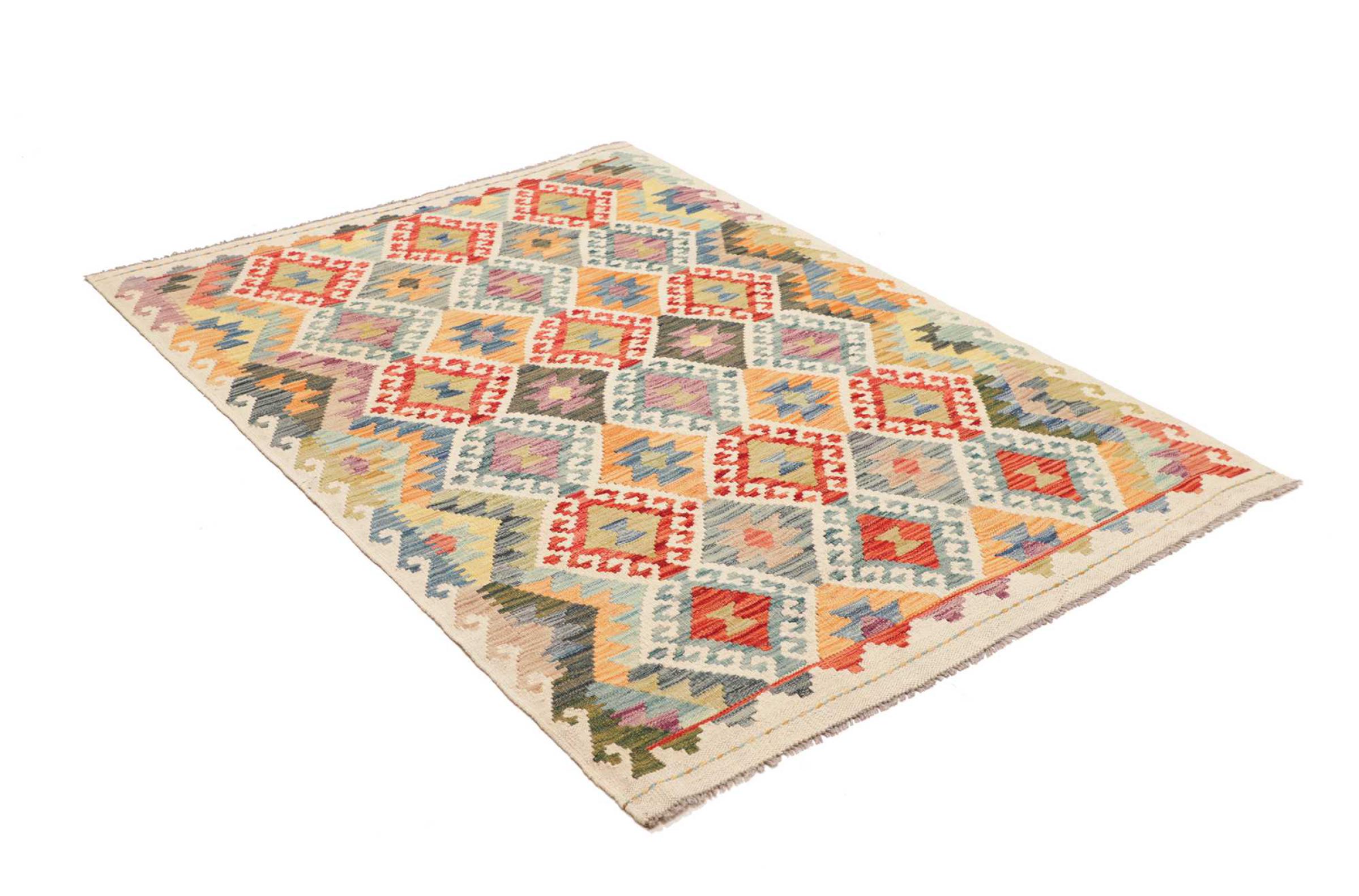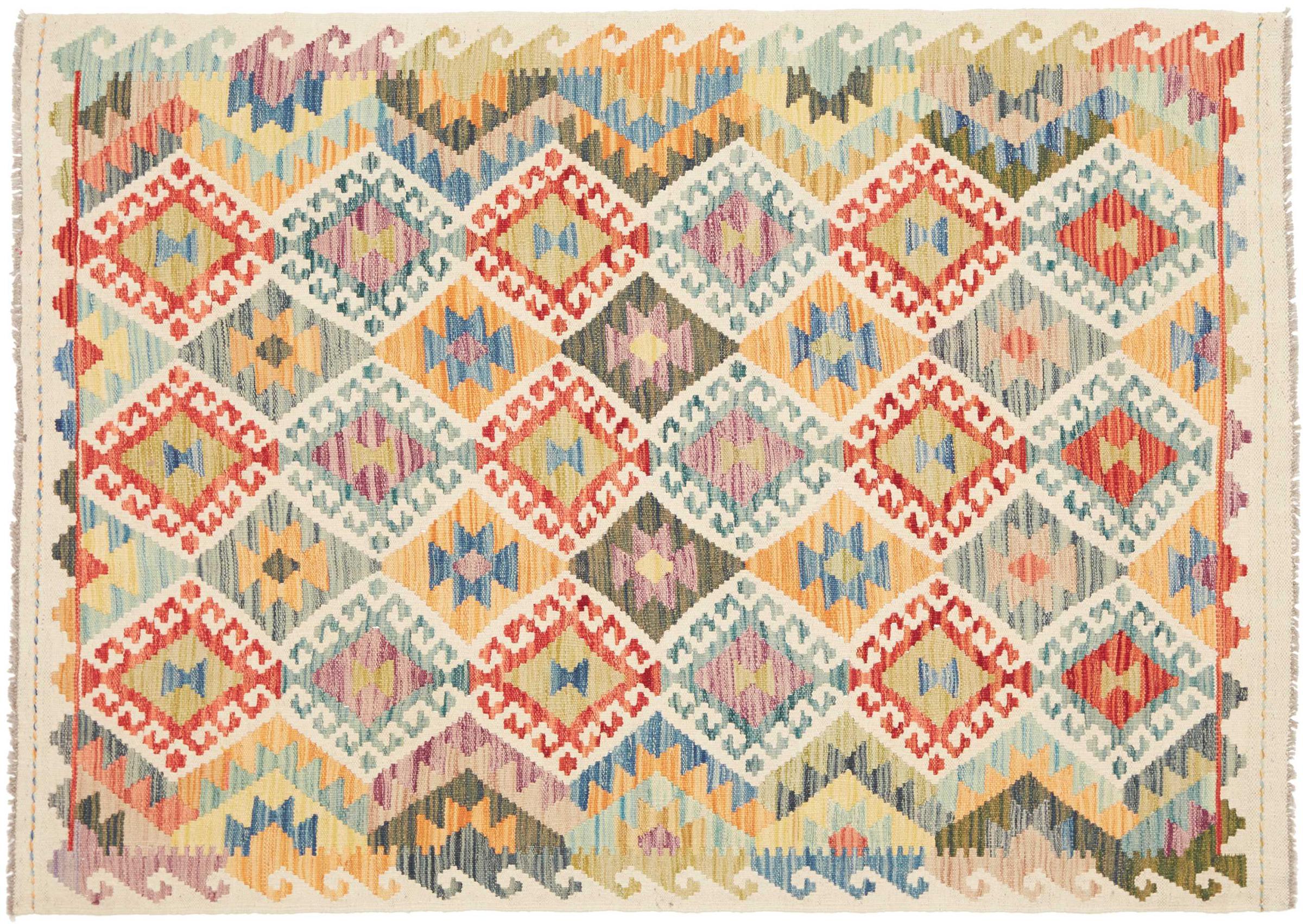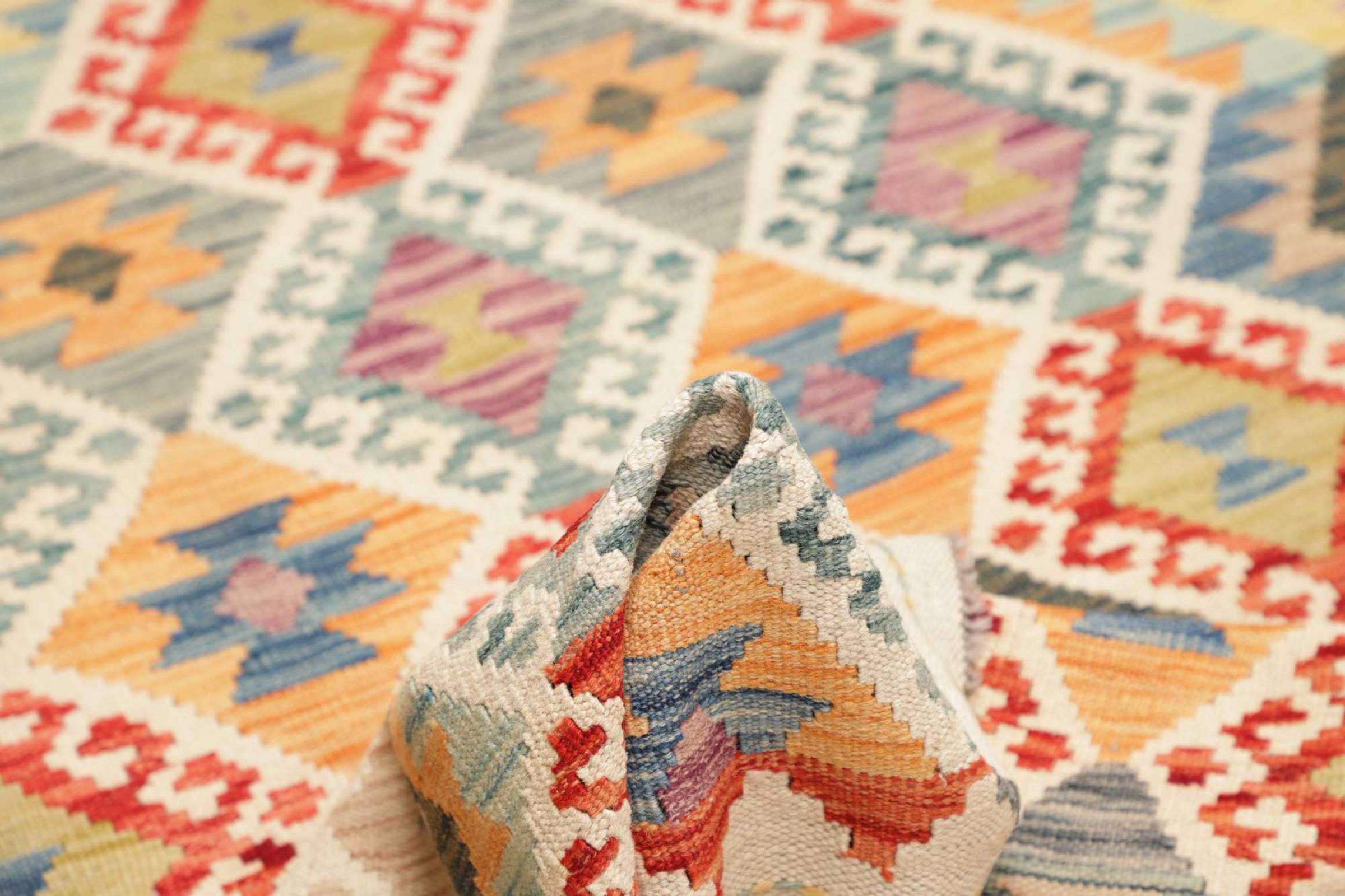 Denna handvävda kelim afghan är vacker tack vare de mångfacetterade färgerna och det typiska mönstret. Den var handvävd i Afghanistan av 100 % fårull. Den är utan tvekan mer robust och hållbar än maskintillverkade mattor. Dessutom har denna kelim en alldeles egen karaktär. En unik pjäs för dig och ditt hem som du aldrig kommer att hitta igen.