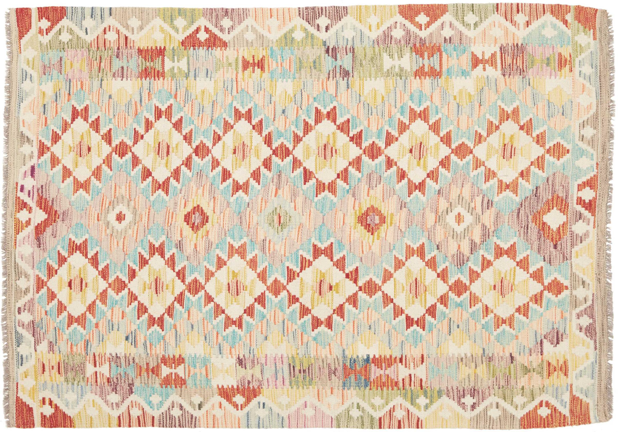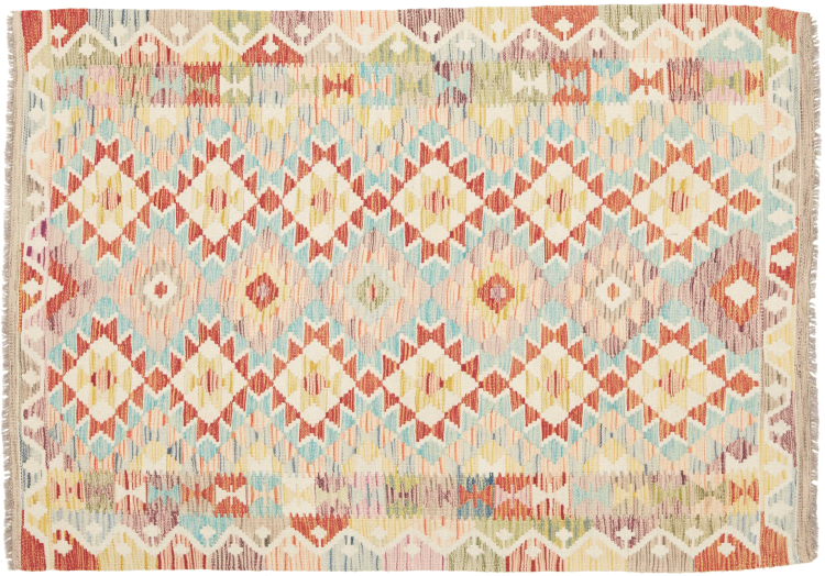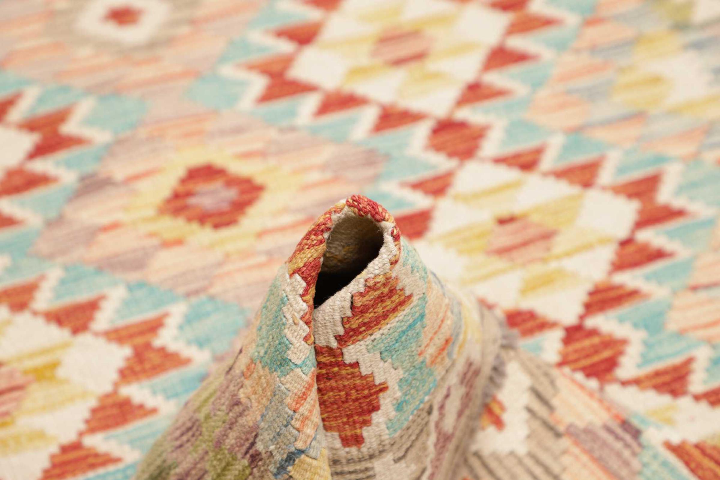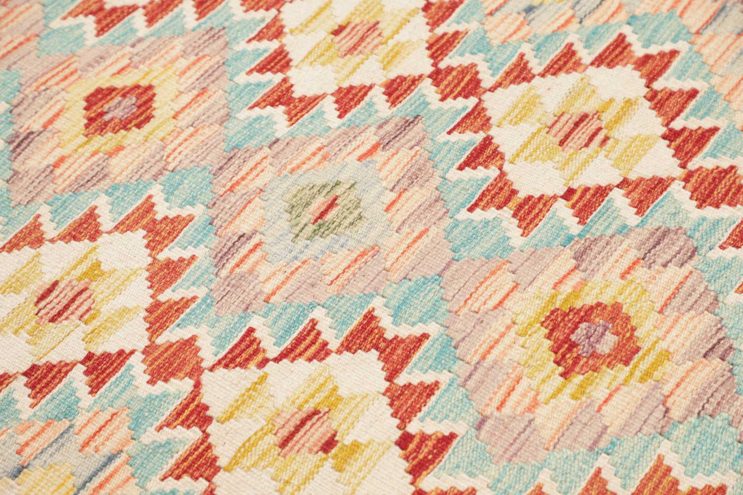 Denna handvävda kelim afghan är vacker tack vare de mångfacetterade färgerna och det typiska mönstret. Den var handvävd i Afghanistan av 100 % fårull. Den är utan tvekan mer robust och hållbar än maskintillverkade mattor. Dessutom har denna kelim en alldeles egen karaktär. En unik pjäs för dig och ditt hem som du aldrig kommer att hitta igen.