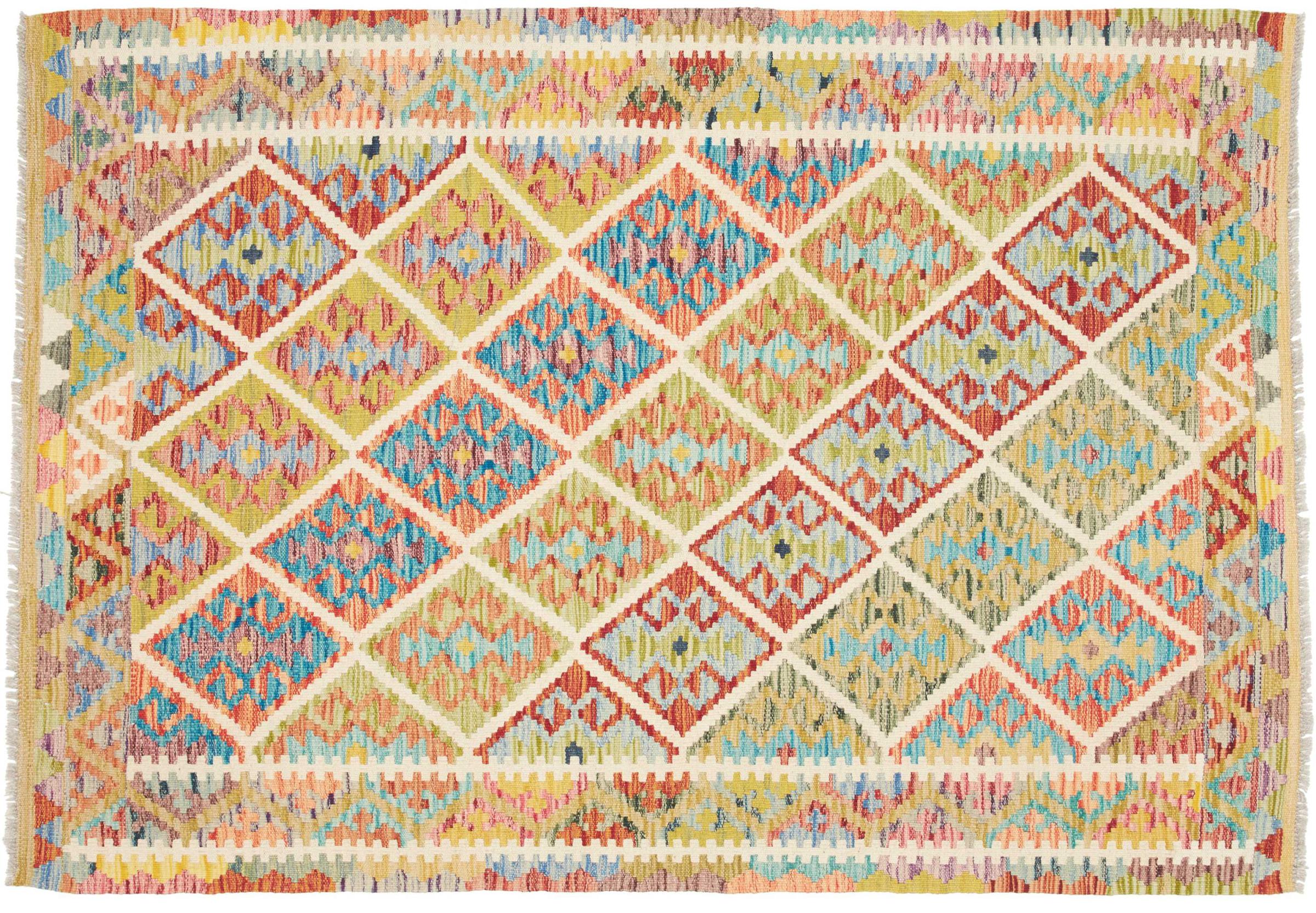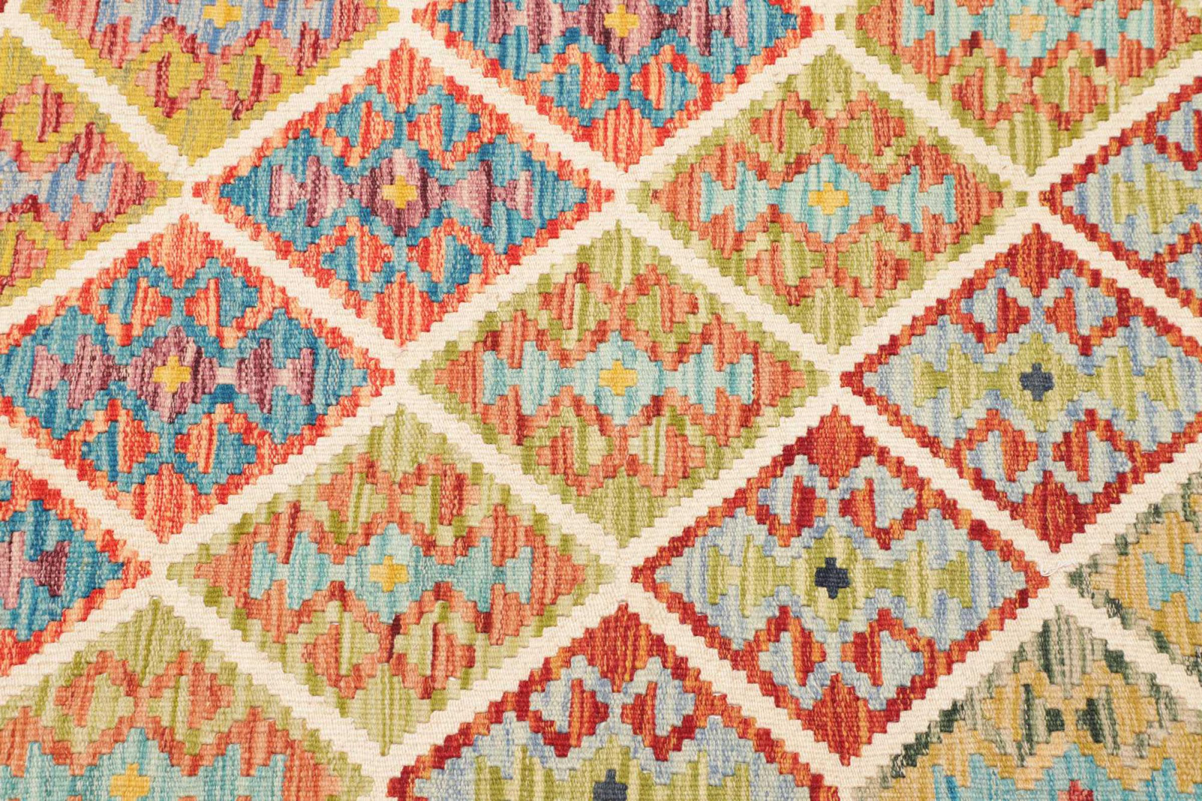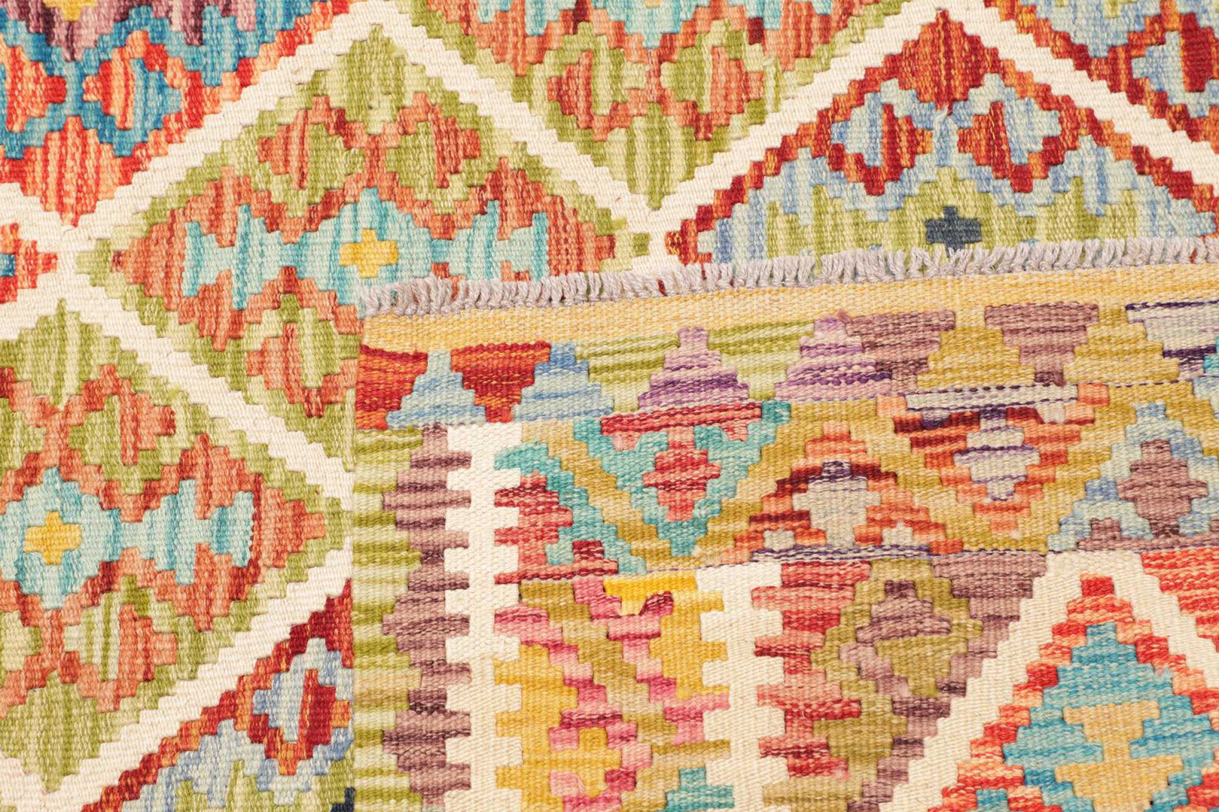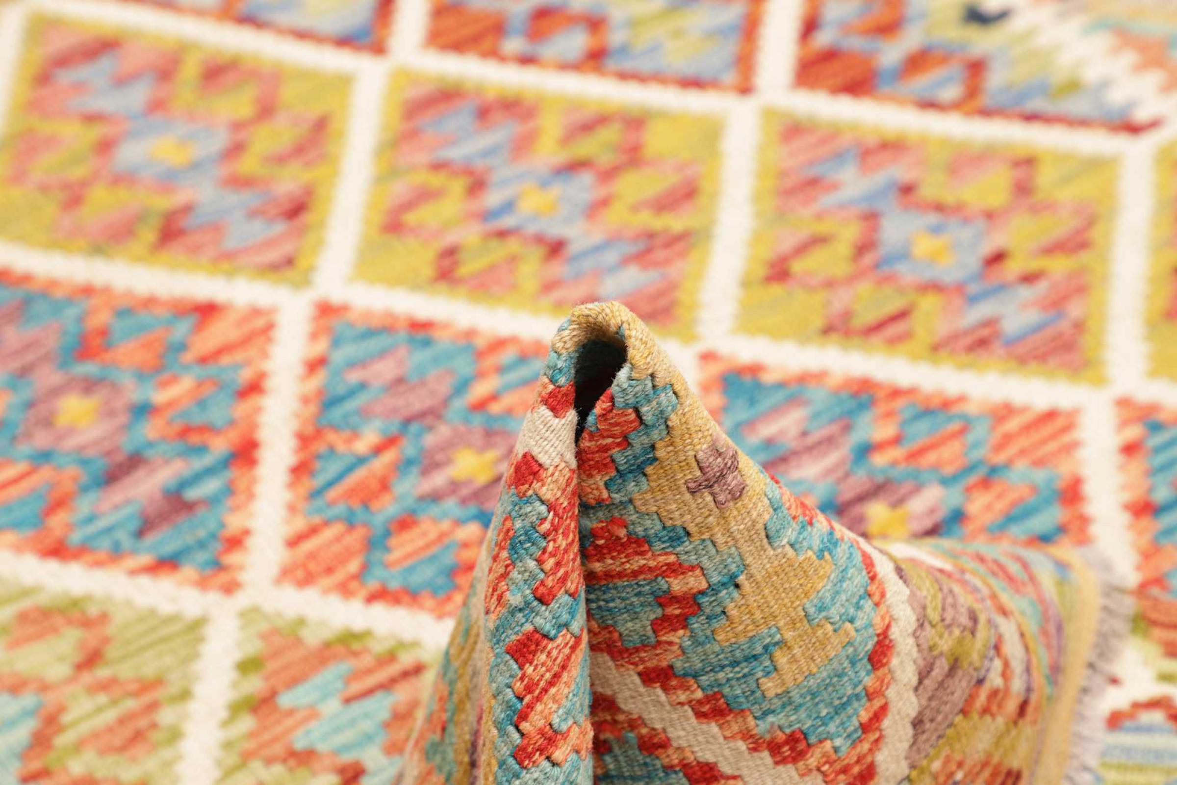 Denna handvävda kelim afghan är vacker tack vare de mångfacetterade färgerna och det typiska mönstret. Den var handvävd i Afghanistan av 100 % fårull. Den är utan tvekan mer robust och hållbar än maskintillverkade mattor. Dessutom har denna kelim en alldeles egen karaktär. En unik pjäs för dig och ditt hem som du aldrig kommer att hitta igen.