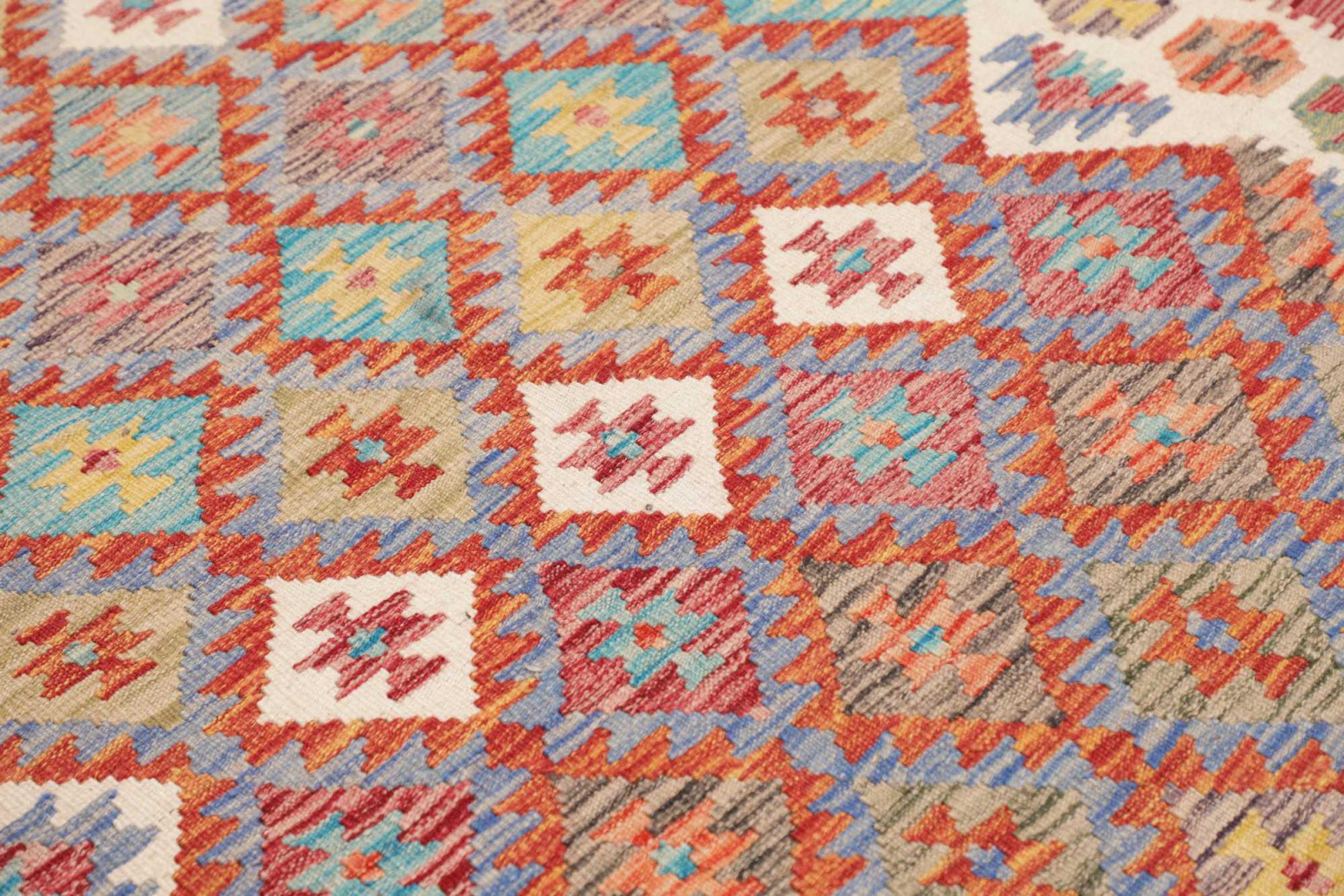 Denna handvävda kelim afghan är vacker tack vare de mångfacetterade färgerna och det typiska mönstret. Den var handvävd i Afghanistan av 100 % fårull. Den är utan tvekan mer robust och hållbar än maskintillverkade mattor. Dessutom har denna kelim en alldeles egen karaktär. En unik pjäs för dig och ditt hem som du aldrig kommer att hitta igen.