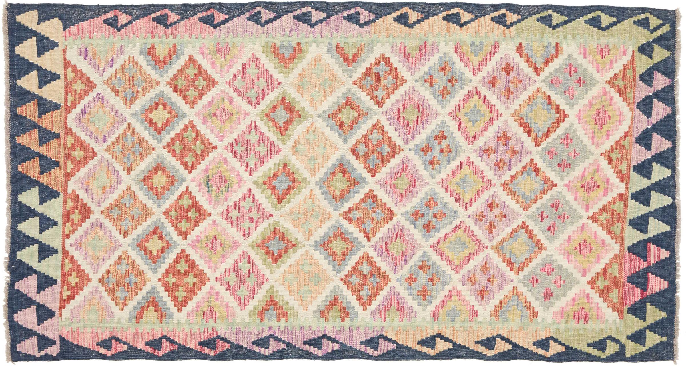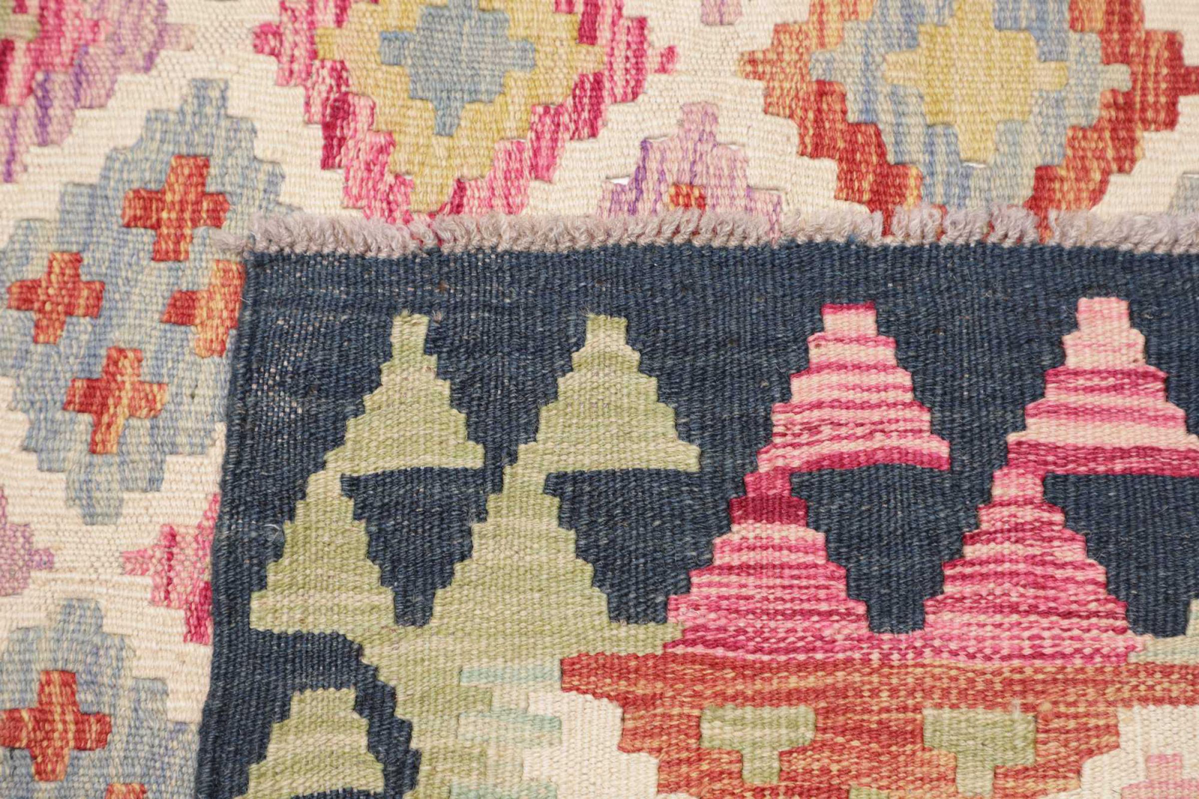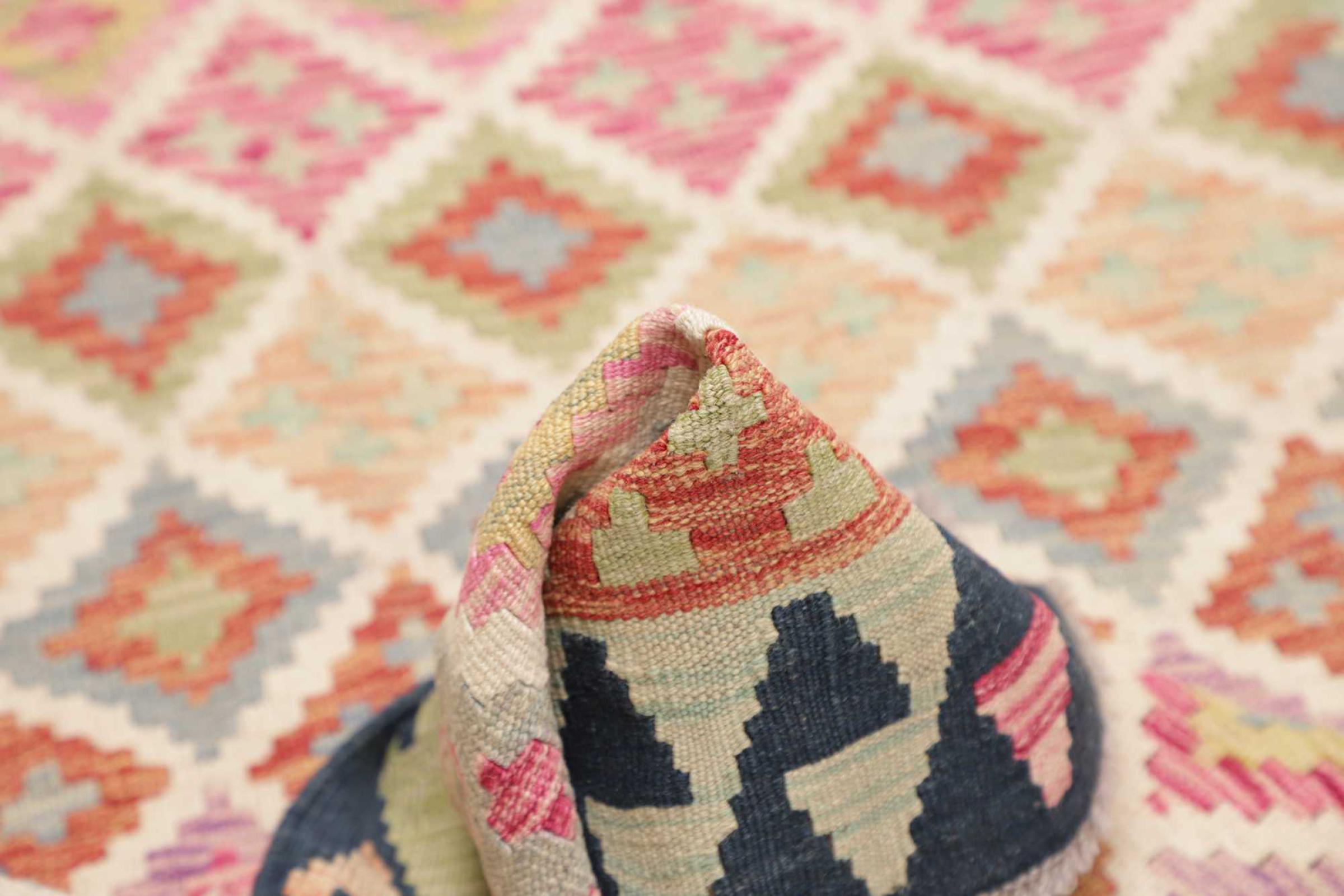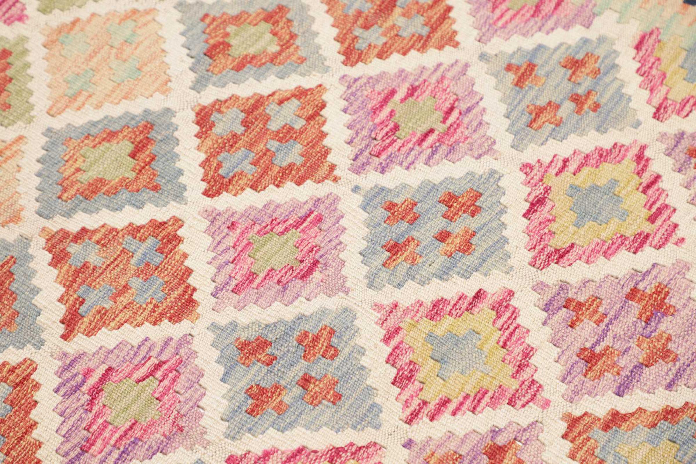 Denna handvävda kelim afghan är vacker tack vare de mångfacetterade färgerna och det typiska mönstret. Den var handvävd i Afghanistan av 100 % fårull. Den är utan tvekan mer robust och hållbar än maskintillverkade mattor. Dessutom har denna kelim en alldeles egen karaktär. En unik pjäs för dig och ditt hem som du aldrig kommer att hitta igen.