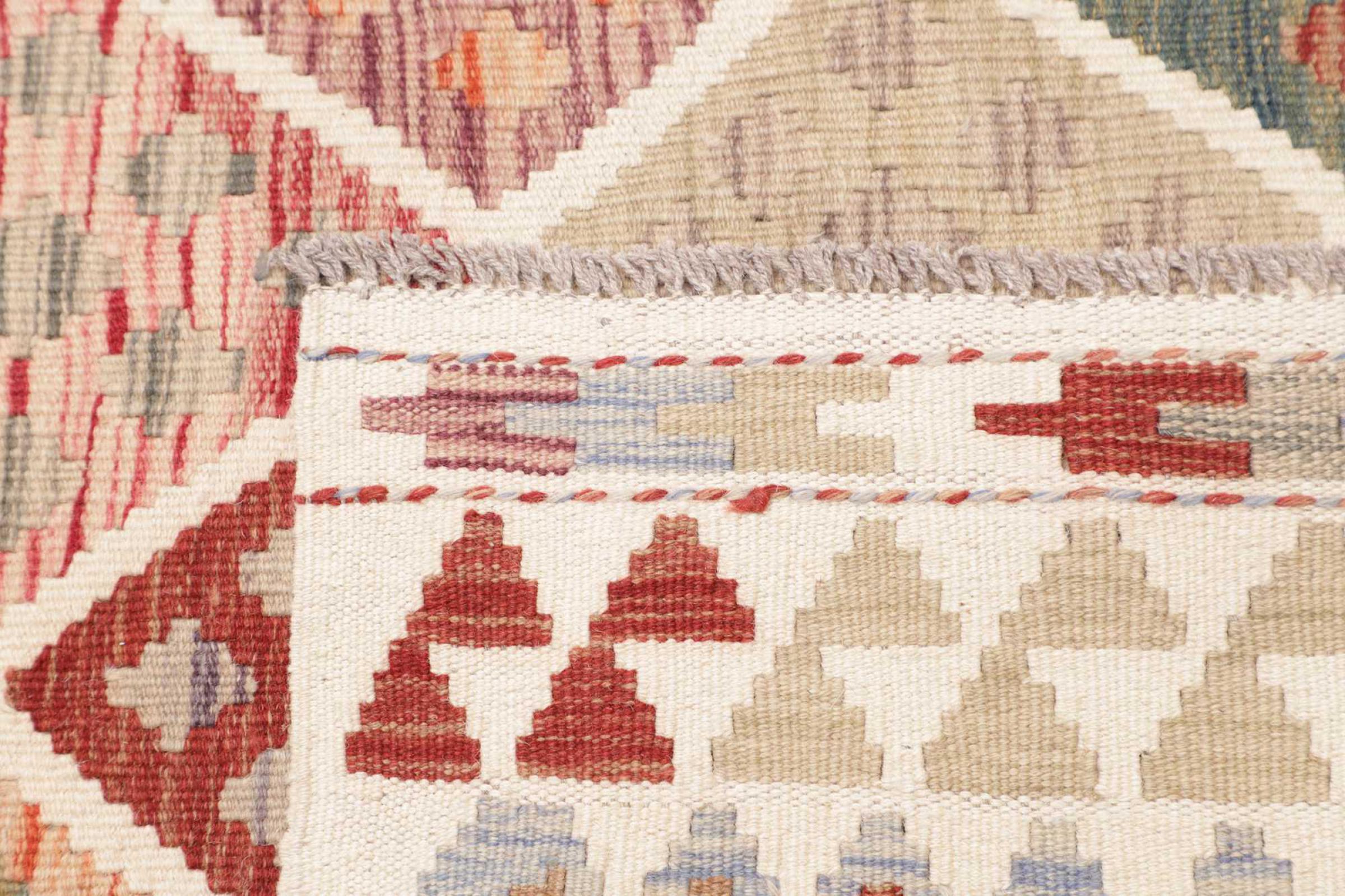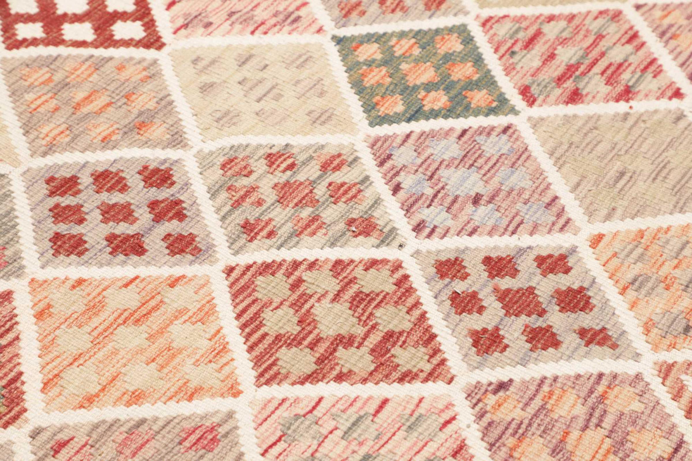 Denna handvävda kelim afghan är vacker tack vare de mångfacetterade färgerna och det typiska mönstret. Den var handvävd i Afghanistan av 100 % fårull. Den är utan tvekan mer robust och hållbar än maskintillverkade mattor. Dessutom har denna kelim en alldeles egen karaktär. En unik pjäs för dig och ditt hem som du aldrig kommer att hitta igen.