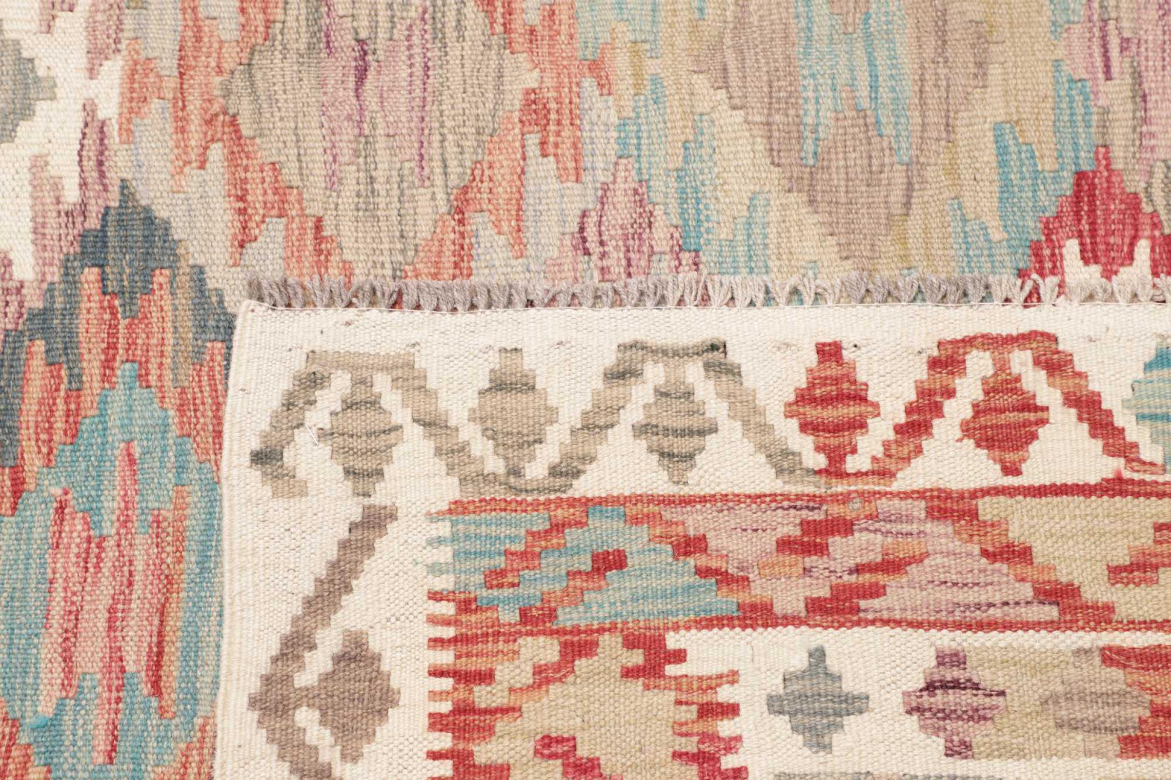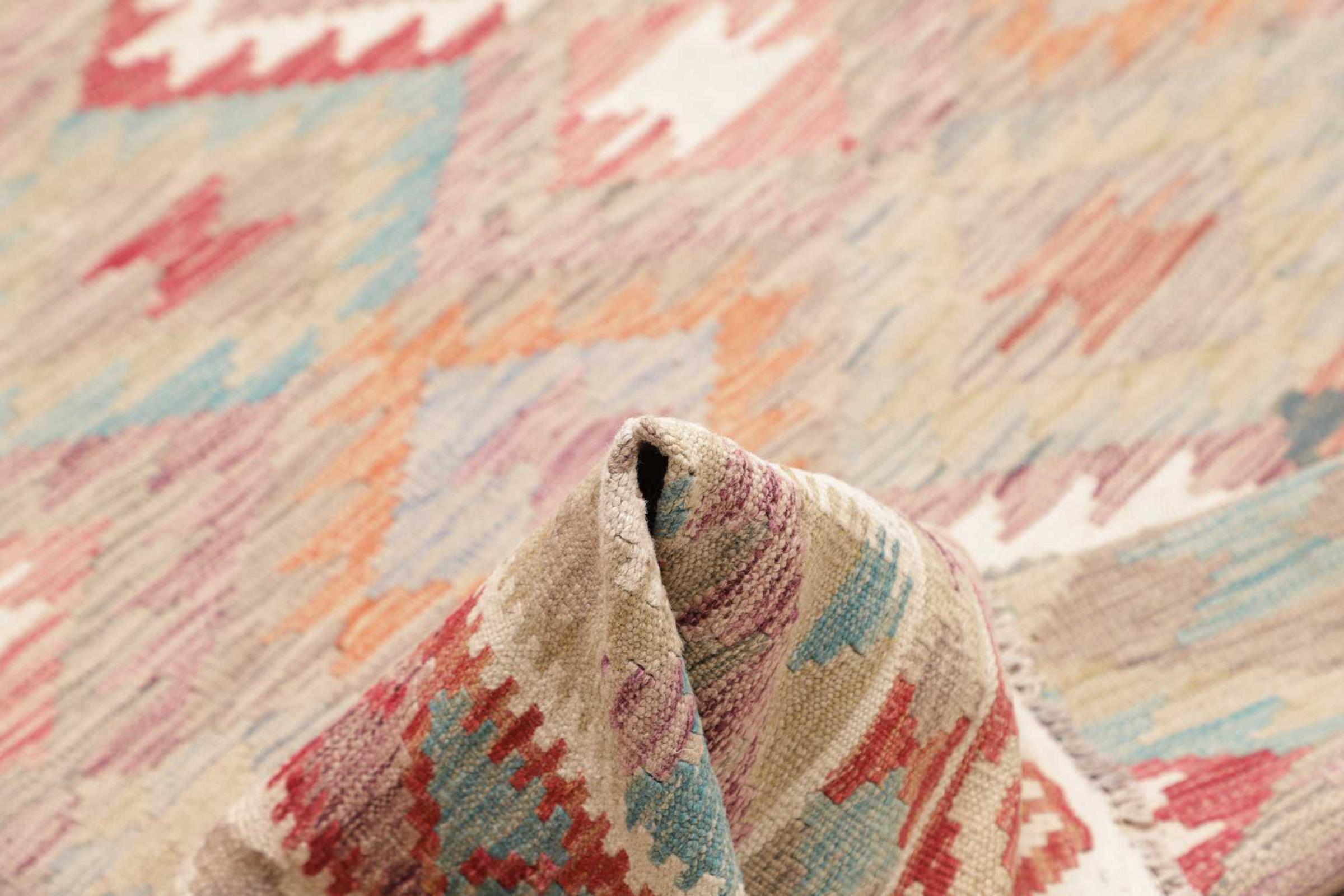 Denna handvävda kelim afghan är vacker tack vare de mångfacetterade färgerna och det typiska mönstret. Den var handvävd i Afghanistan av 100 % fårull. Den är utan tvekan mer robust och hållbar än maskintillverkade mattor. Dessutom har denna kelim en alldeles egen karaktär. En unik pjäs för dig och ditt hem som du aldrig kommer att hitta igen.