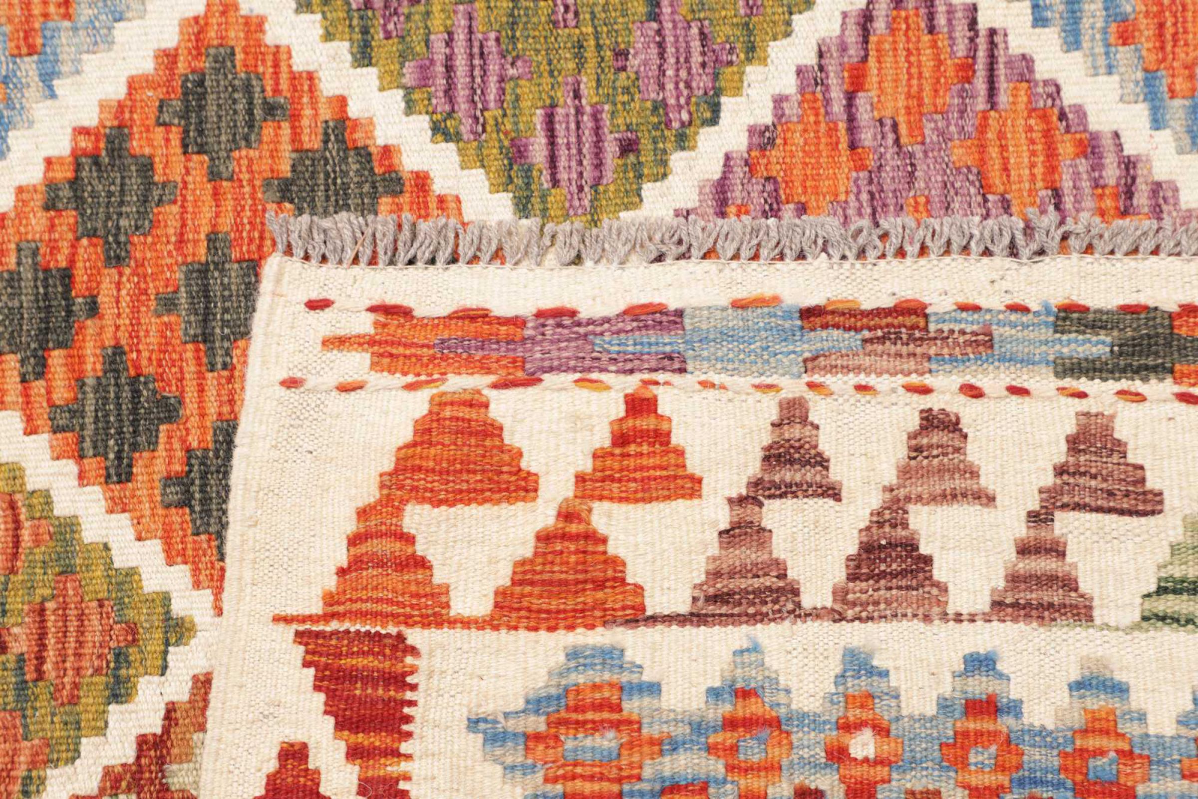 Denna handvävda kelim afghan är vacker tack vare de mångfacetterade färgerna och det typiska mönstret. Den var handvävd i Afghanistan av 100 % fårull. Den är utan tvekan mer robust och hållbar än maskintillverkade mattor. Dessutom har denna kelim en alldeles egen karaktär. En unik pjäs för dig och ditt hem som du aldrig kommer att hitta igen.