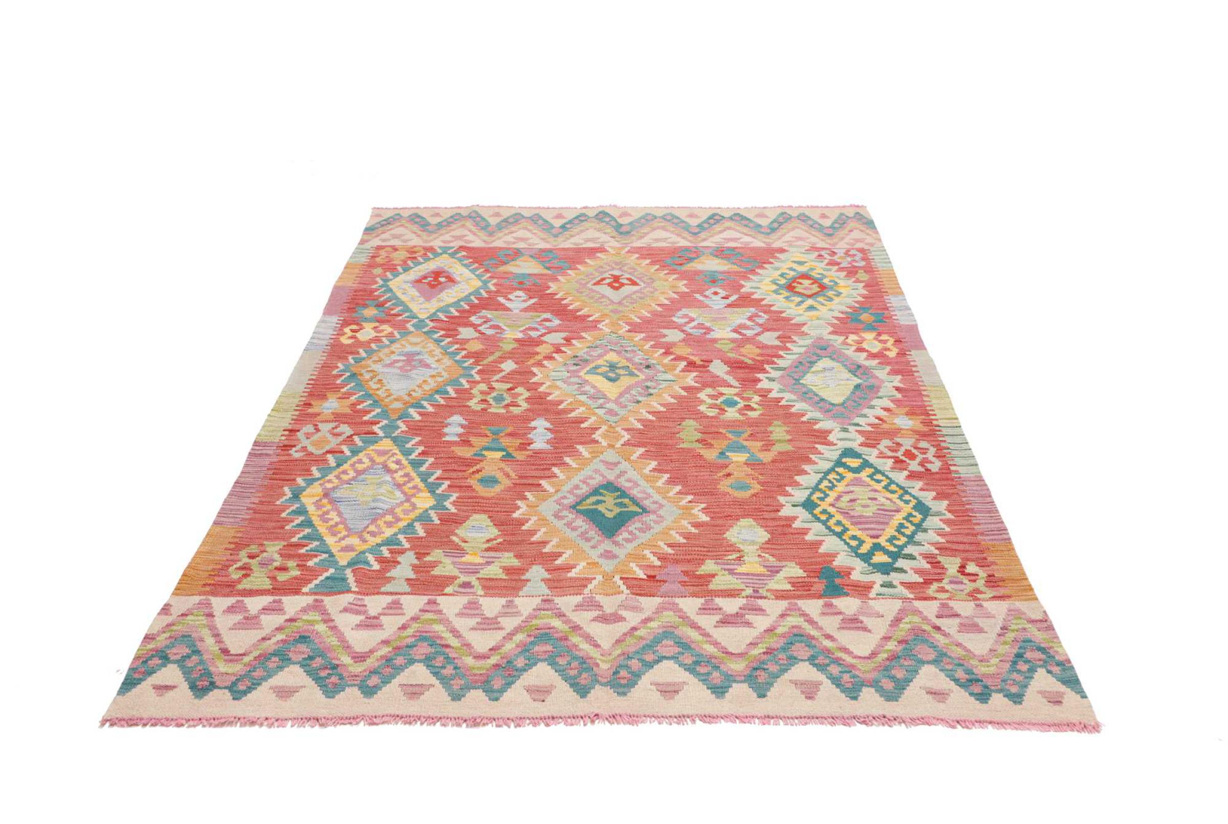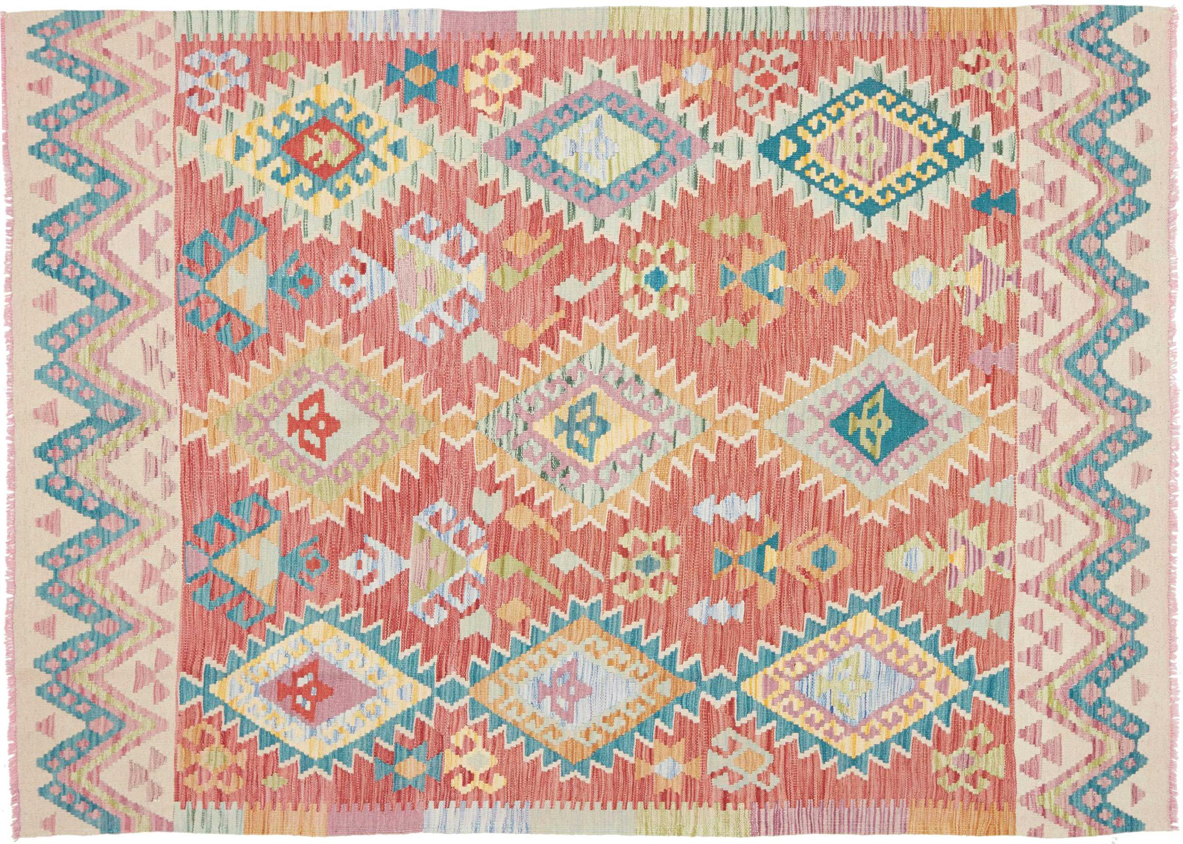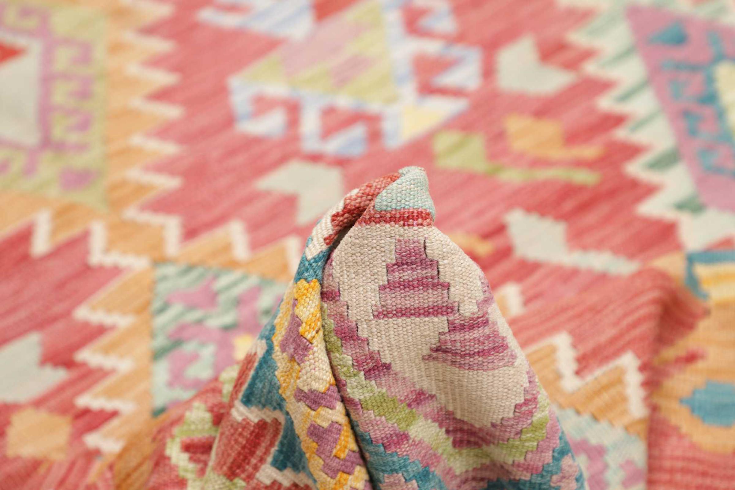Denna handvävda kelim afghan är vacker tack vare de mångfacetterade färgerna och det typiska mönstret. Den var handvävd i Afghanistan av 100 % fårull. Den är utan tvekan mer robust och hållbar än maskintillverkade mattor. Dessutom har denna kelim en alldeles egen karaktär. En unik pjäs för dig och ditt hem som du aldrig kommer att hitta igen.
