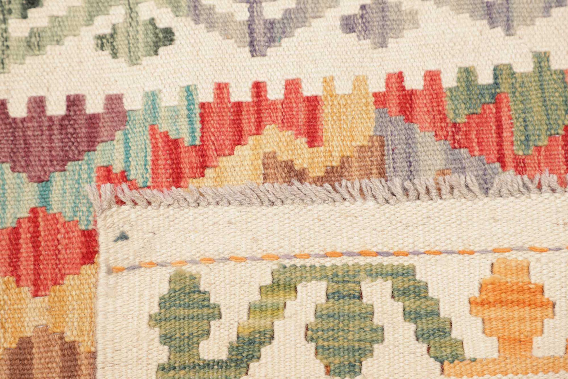 Denna handvävda kelim afghan är vacker tack vare de mångfacetterade färgerna och det typiska mönstret. Den var handvävd i Afghanistan av 100 % fårull. Den är utan tvekan mer robust och hållbar än maskintillverkade mattor. Dessutom har denna kelim en alldeles egen karaktär. En unik pjäs för dig och ditt hem som du aldrig kommer att hitta igen.