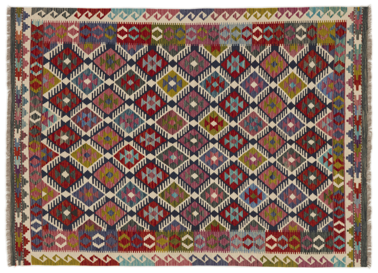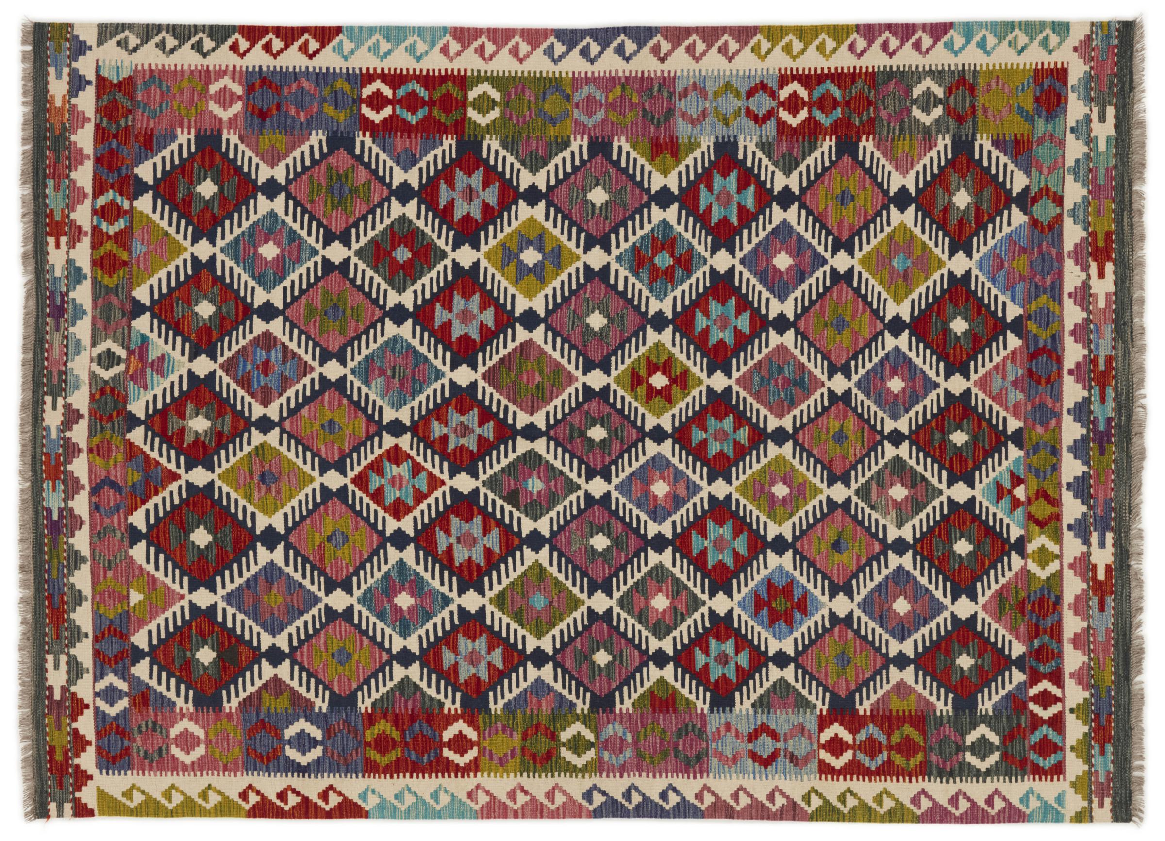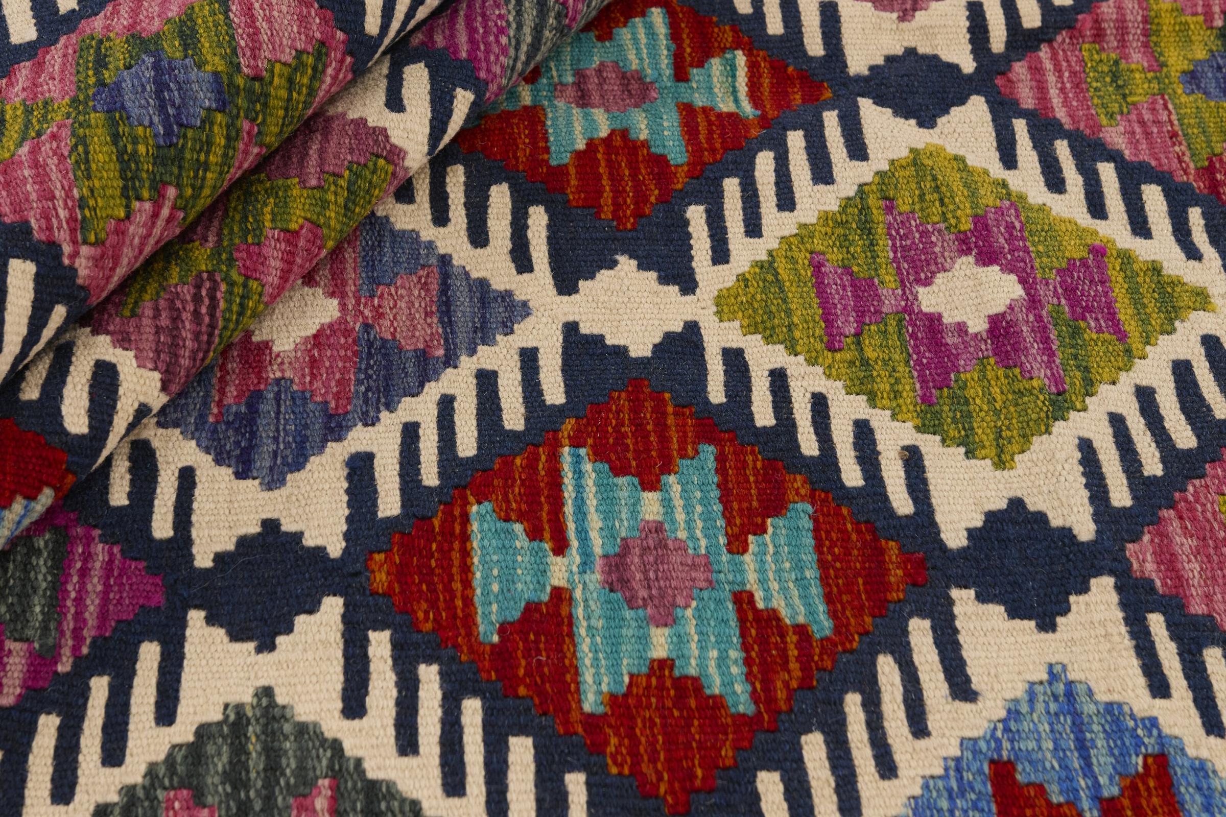 Denna handvävda kelim afghan är vacker tack vare de mångfacetterade färgerna och det typiska mönstret. Den var handvävd i Afghanistan av 100 % fårull. Den är utan tvekan mer robust och hållbar än maskintillverkade mattor. Dessutom har denna kelim en alldeles egen karaktär. En unik pjäs för dig och ditt hem som du aldrig kommer att hitta igen.