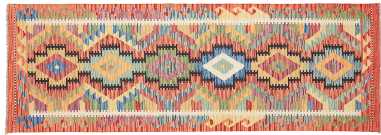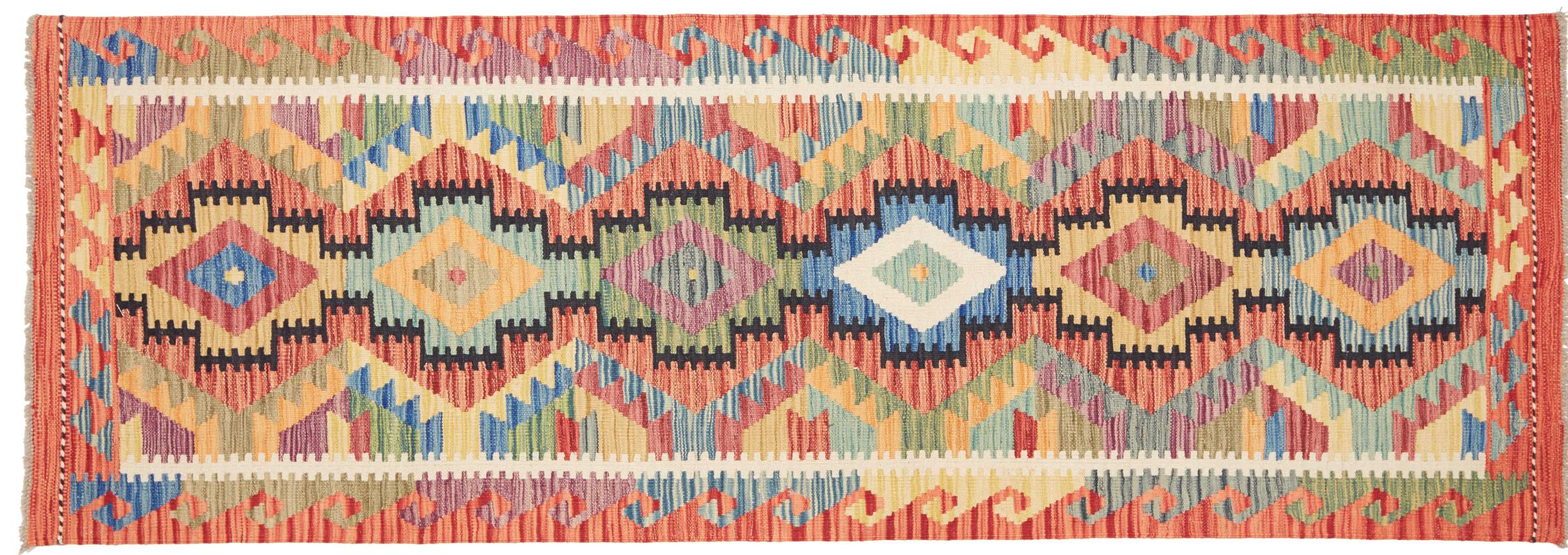 Denna handvävda kelim afghan är vacker tack vare de mångfacetterade färgerna och det typiska mönstret. Den var handvävd i Afghanistan av 100 % fårull. Den är utan tvekan mer robust och hållbar än maskintillverkade mattor. Dessutom har denna kelim en alldeles egen karaktär. En unik pjäs för dig och ditt hem som du aldrig kommer att hitta igen.