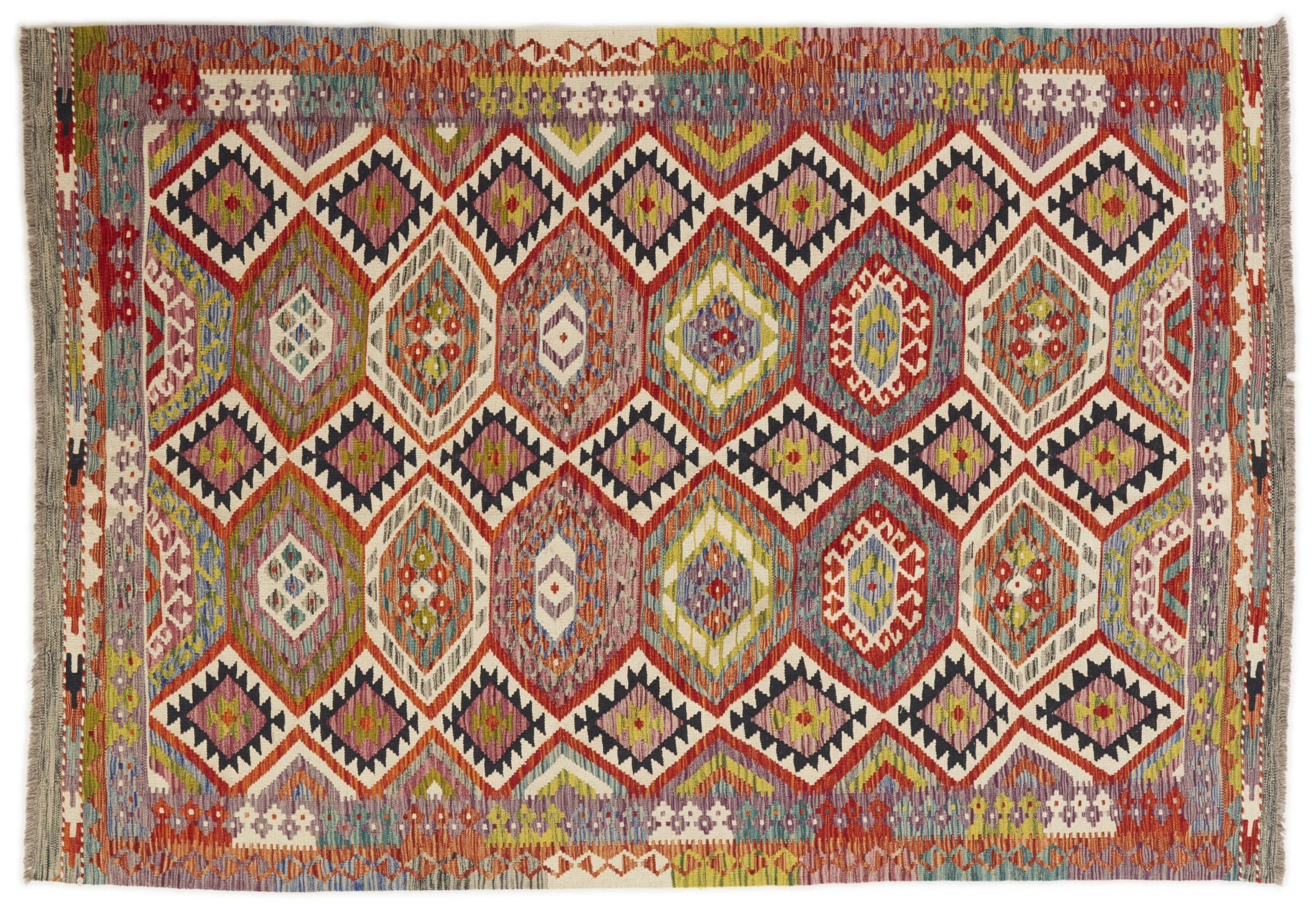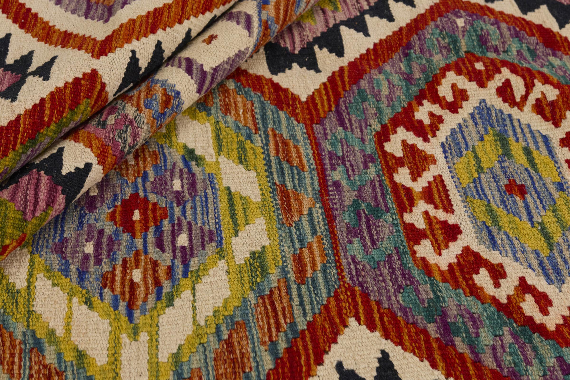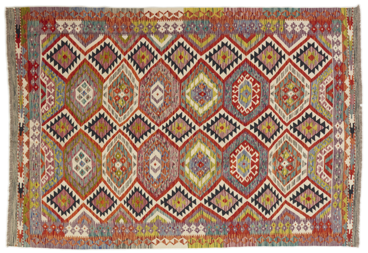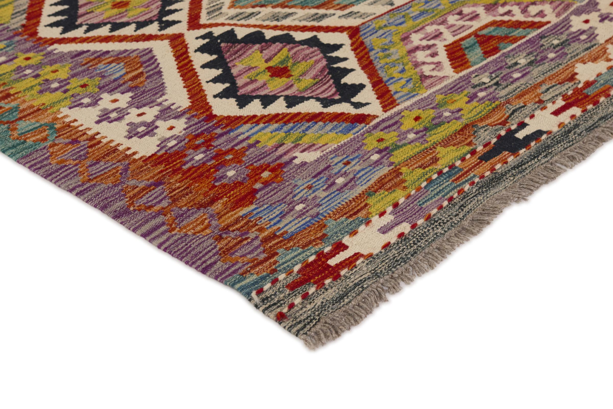 Denna handvävda kelim afghan är vacker tack vare de mångfacetterade färgerna och det typiska mönstret. Den var handvävd i Afghanistan av 100 % fårull. Den är utan tvekan mer robust och hållbar än maskintillverkade mattor. Dessutom har denna kelim en alldeles egen karaktär. En unik pjäs för dig och ditt hem som du aldrig kommer att hitta igen.