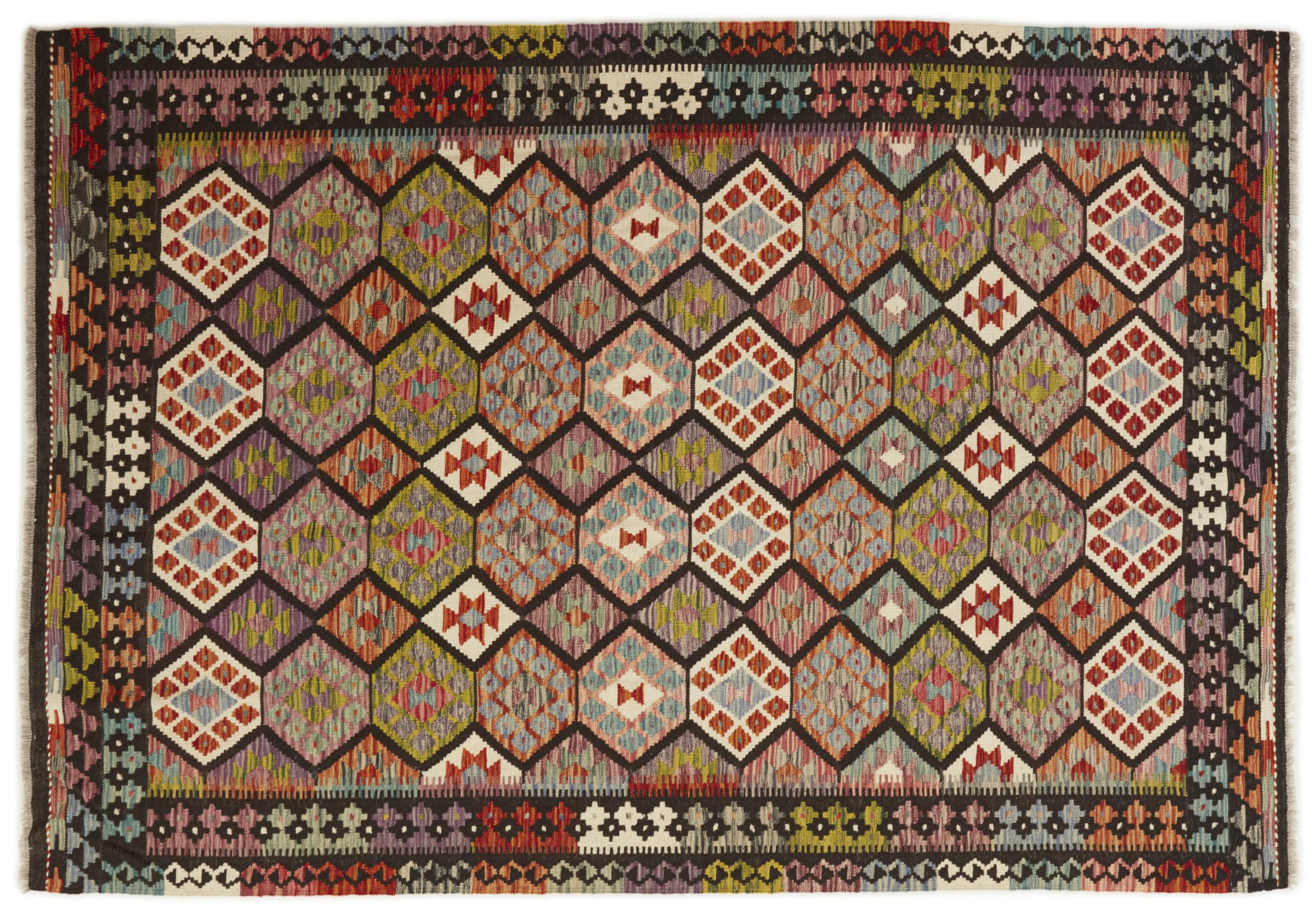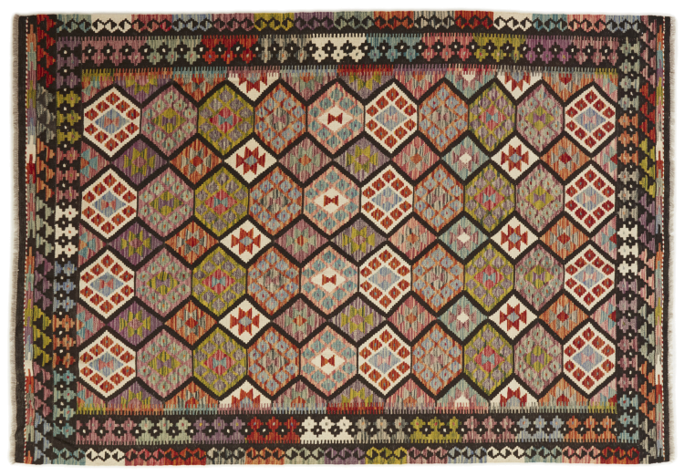 Denna handvävda kelim afghan är vacker tack vare de mångfacetterade färgerna och det typiska mönstret. Den var handvävd i Afghanistan av 100 % fårull. Den är utan tvekan mer robust och hållbar än maskintillverkade mattor. Dessutom har denna kelim en alldeles egen karaktär. En unik pjäs för dig och ditt hem som du aldrig kommer att hitta igen.