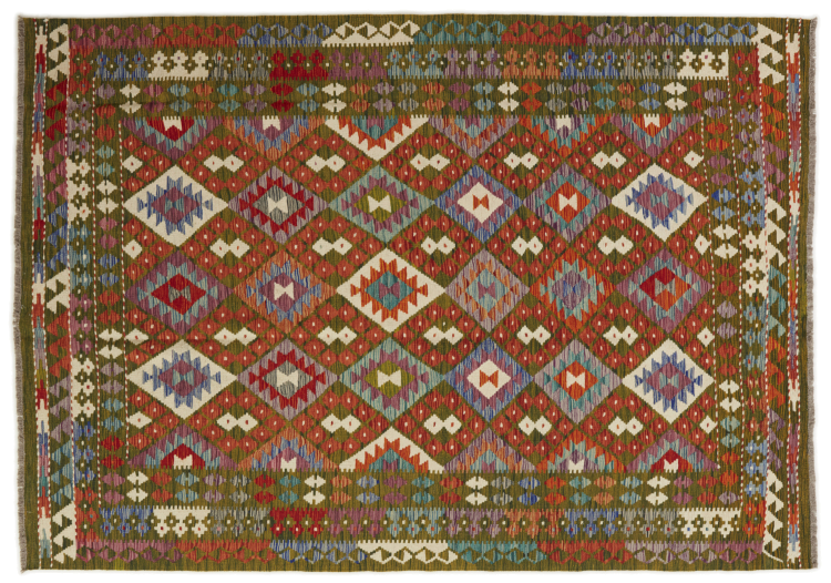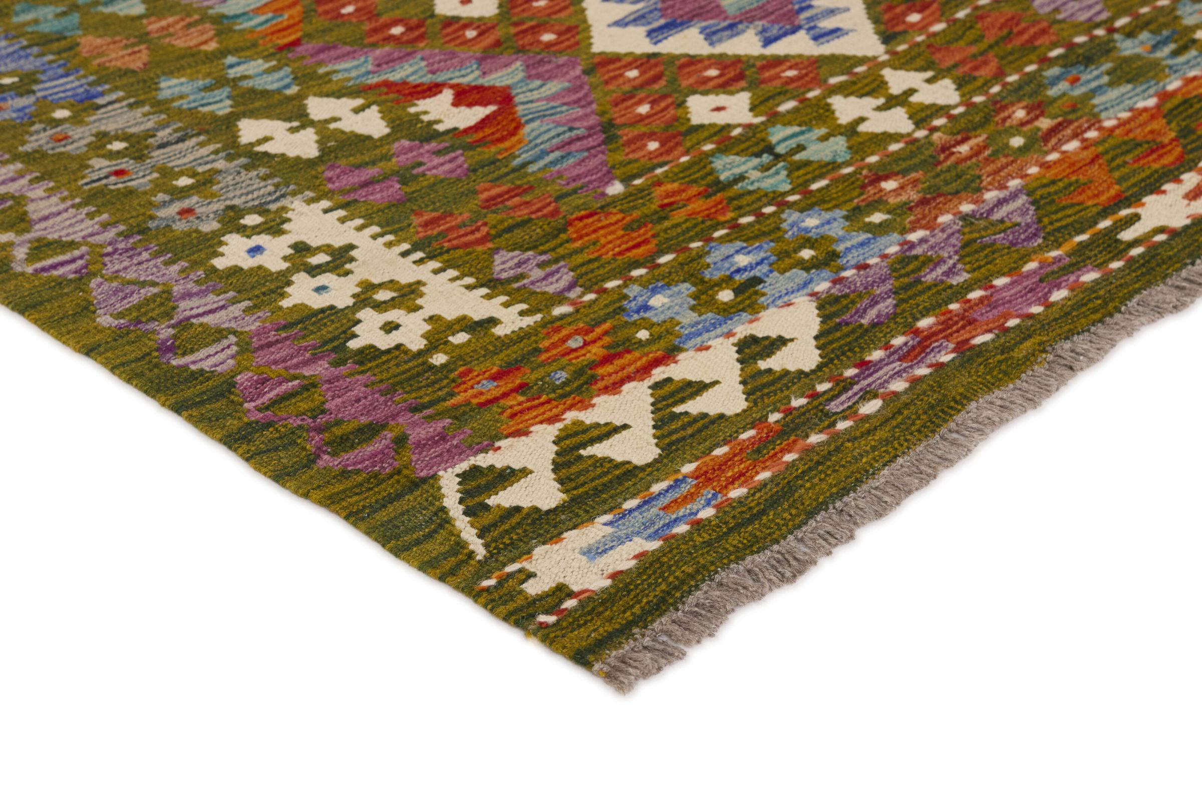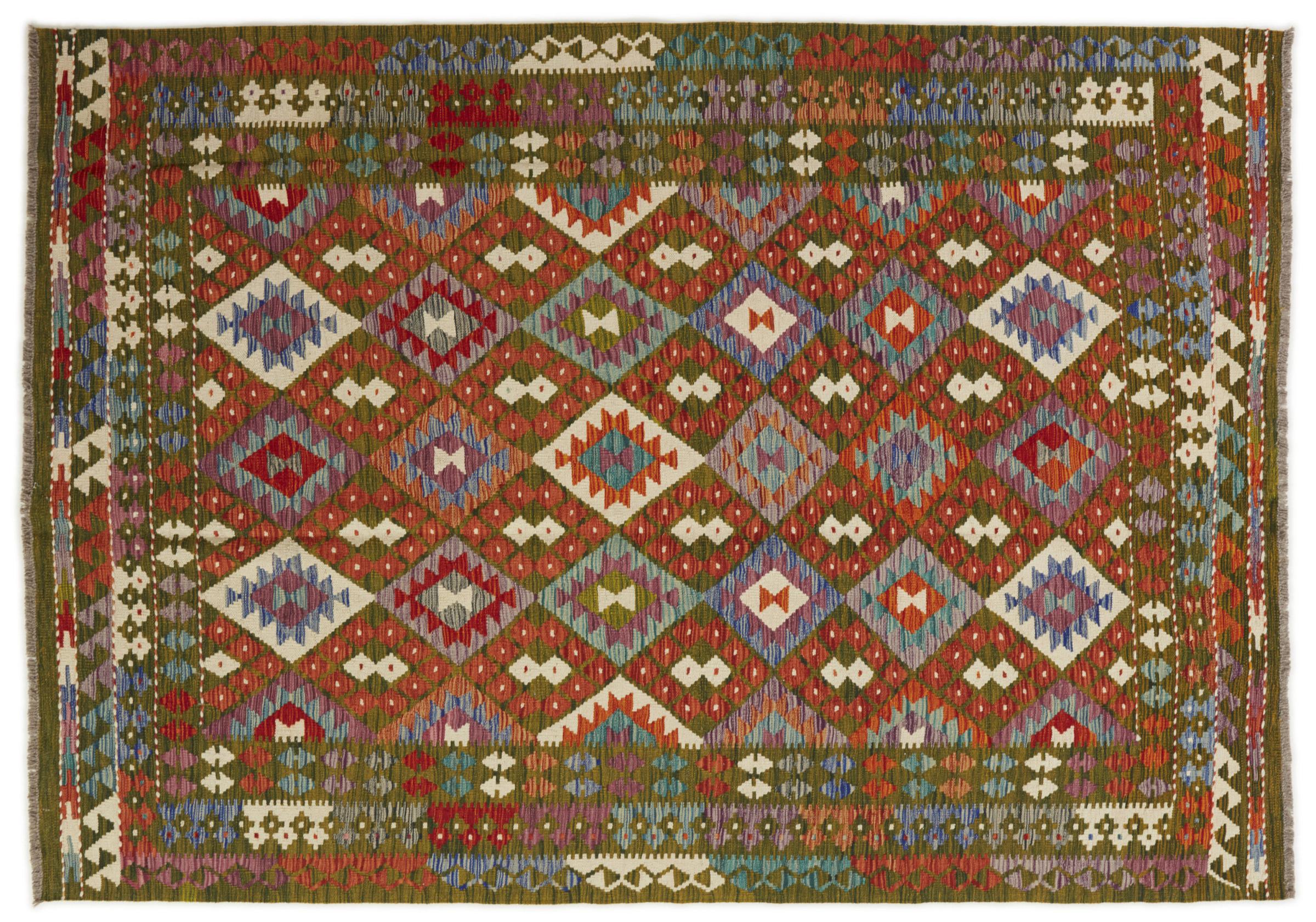Denna handvävda kelim afghan är vacker tack vare de mångfacetterade färgerna och det typiska mönstret. Den var handvävd i Afghanistan av 100 % fårull. Den är utan tvekan mer robust och hållbar än maskintillverkade mattor. Dessutom har denna kelim en alldeles egen karaktär. En unik pjäs för dig och ditt hem som du aldrig kommer att hitta igen.