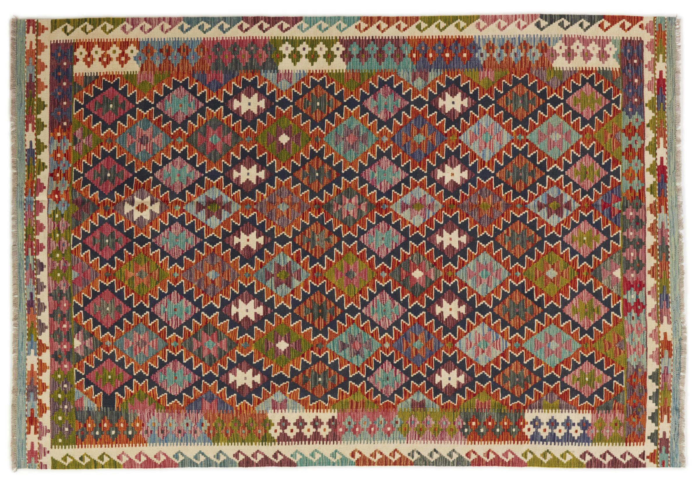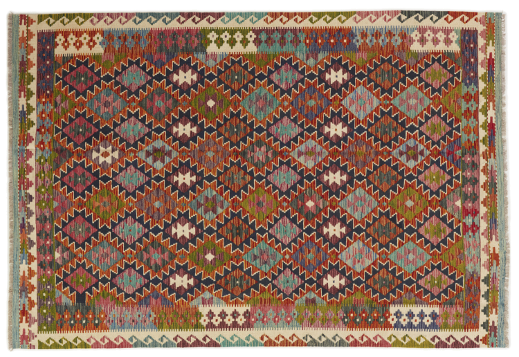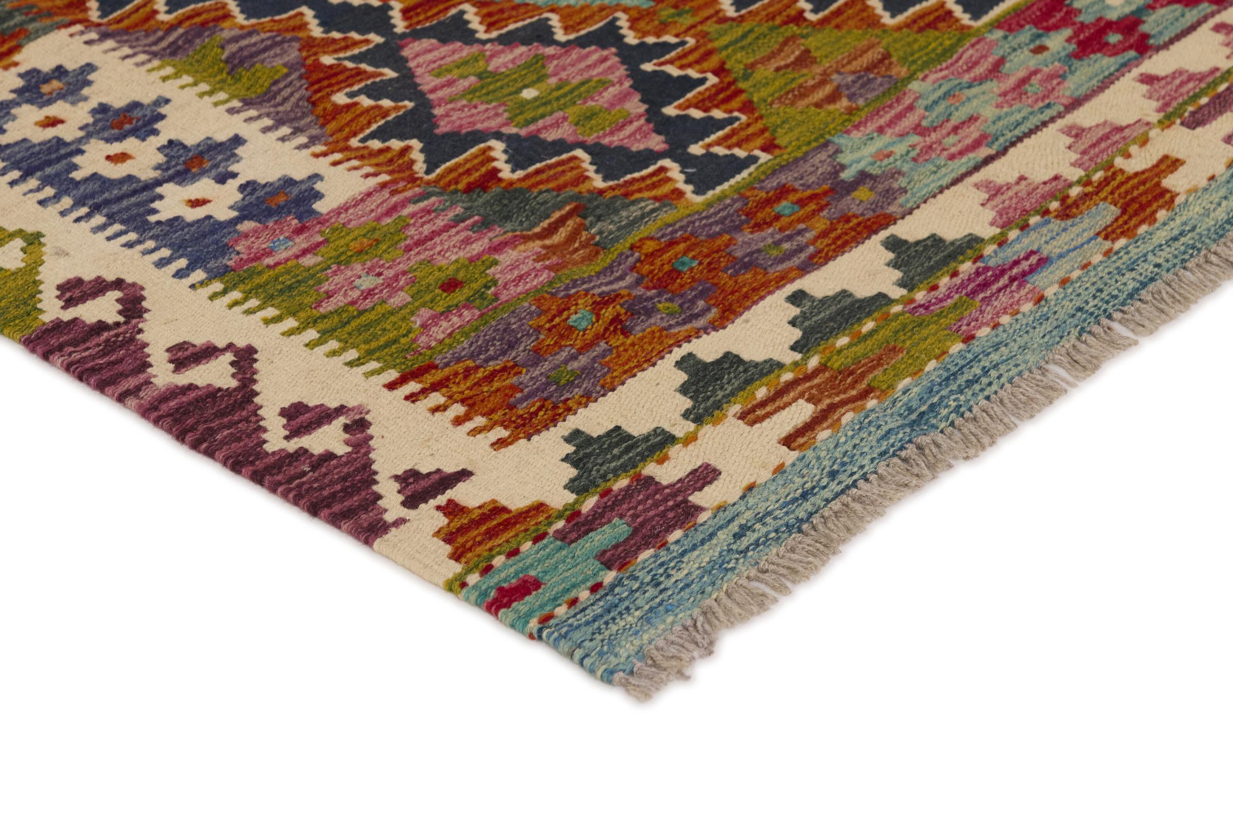 Denna handvävda kelim afghan är vacker tack vare de mångfacetterade färgerna och det typiska mönstret. Den var handvävd i Afghanistan av 100 % fårull. Den är utan tvekan mer robust och hållbar än maskintillverkade mattor. Dessutom har denna kelim en alldeles egen karaktär. En unik pjäs för dig och ditt hem som du aldrig kommer att hitta igen.
