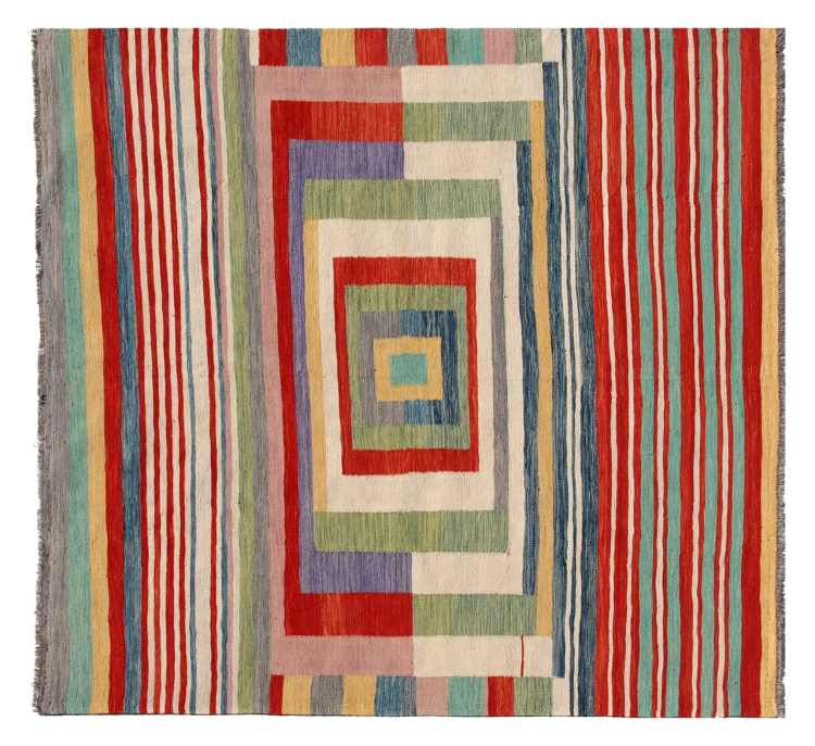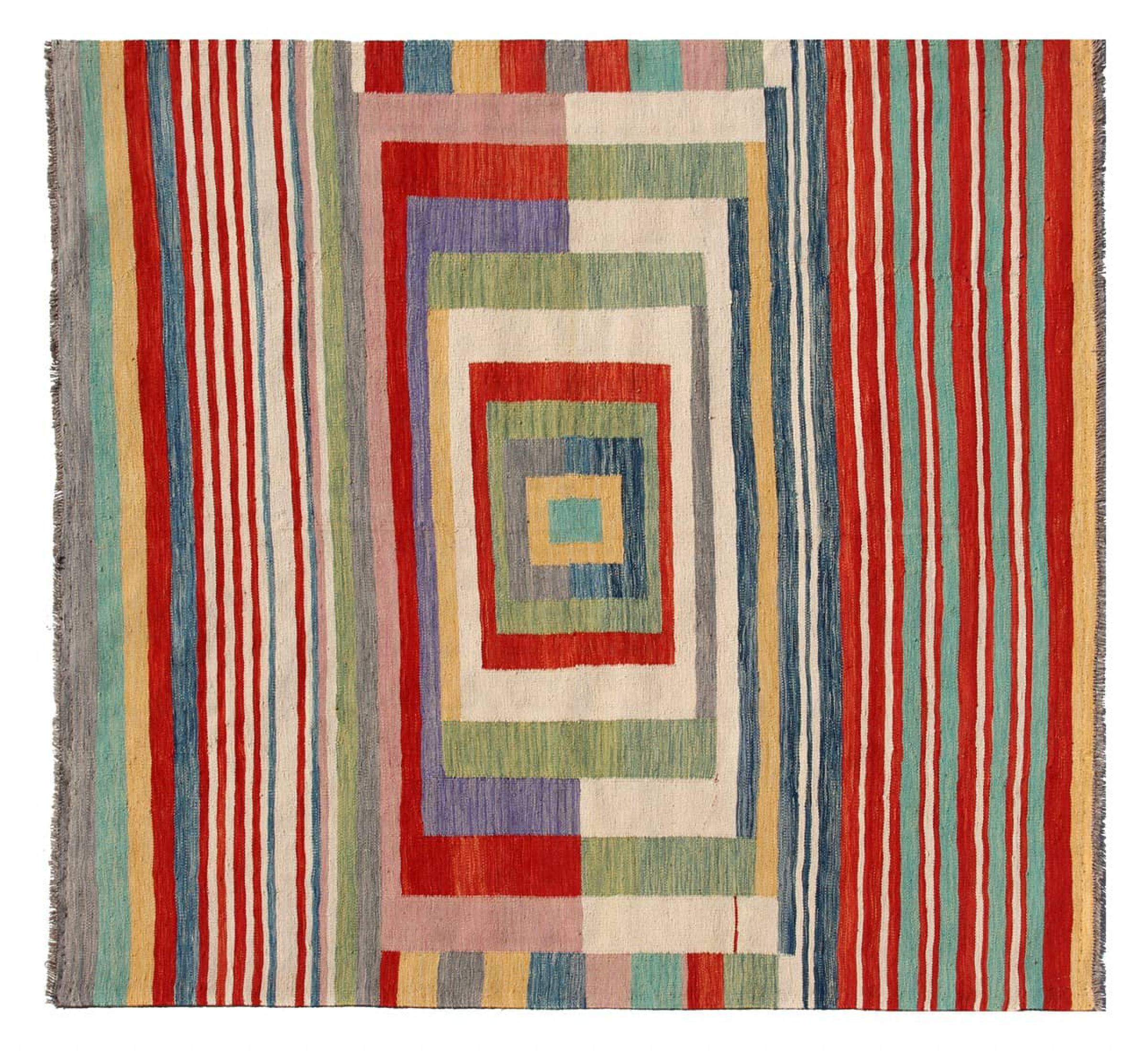 Mattans ID: 31540900883933 Storlek: 196x187 cm Tjocklek: ap. 5 mm Tillverkning: handvävd Lugg: Handspunnen ull Varp: Ull Ursprung: Afghanistan Ålder: Ny Vikt: ap. 7 kg Också känd som Kilim, Qilim, Chilim, Afgan, Afghán I lager: Unik - Endast 1 i lager