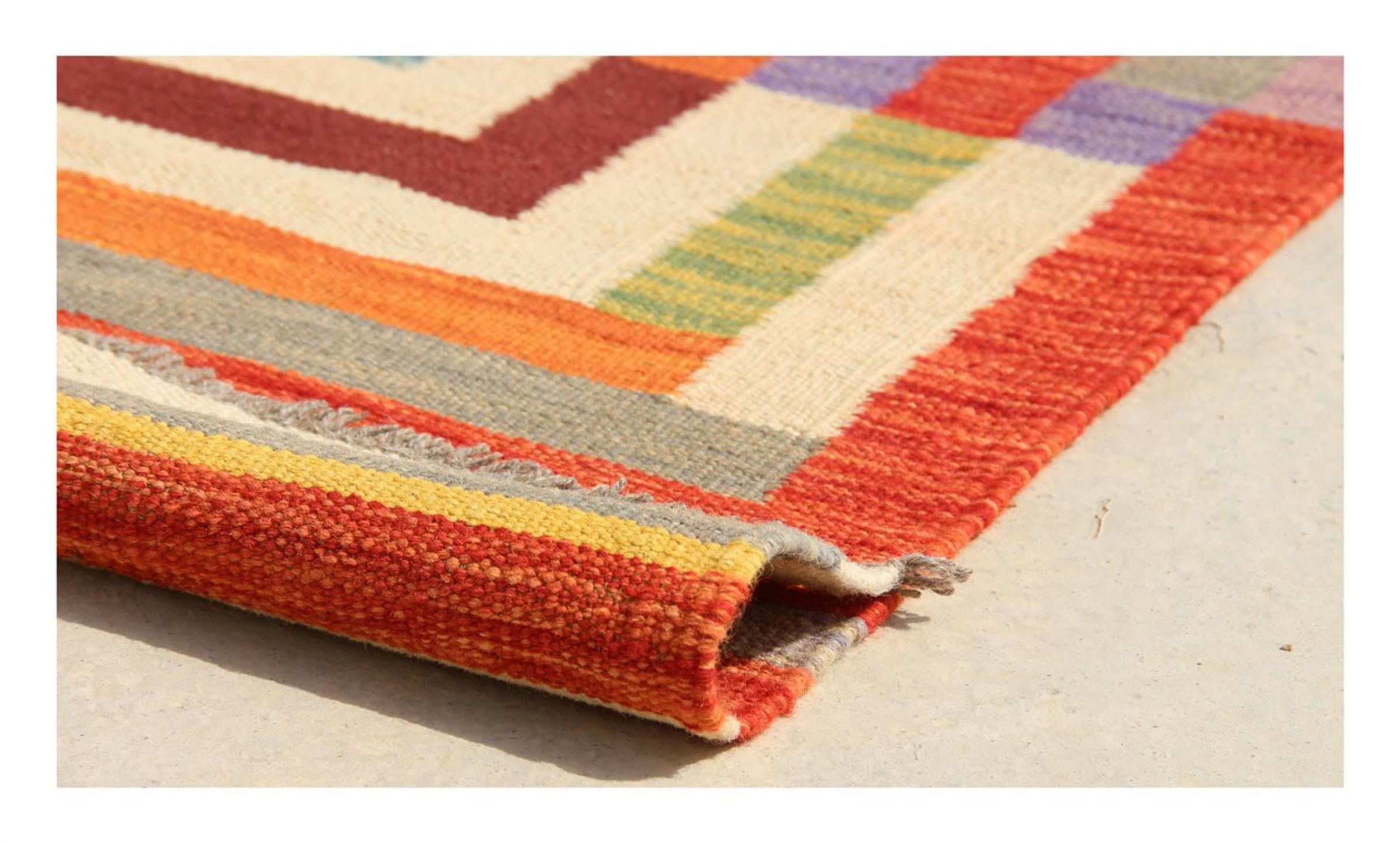 Denna matta tillverkas för hand på vävstolen som en platt väv. Flatweaves är mattor som inte har någon hög. Som namnet antyder är dessa mattor vävda och inte knutna. Detta resulterar i en platt matta med en strukturerad yta. Platta väver är inte så mjuka och mest tunnare än knutna mattor. Samtidigt är de betydligt mindre komplexa att tillverka och kan vanligtvis utformas från båda sidor (fram och bak). Deras mönster är vanligtvis geometriska, vilket beror på tyget.