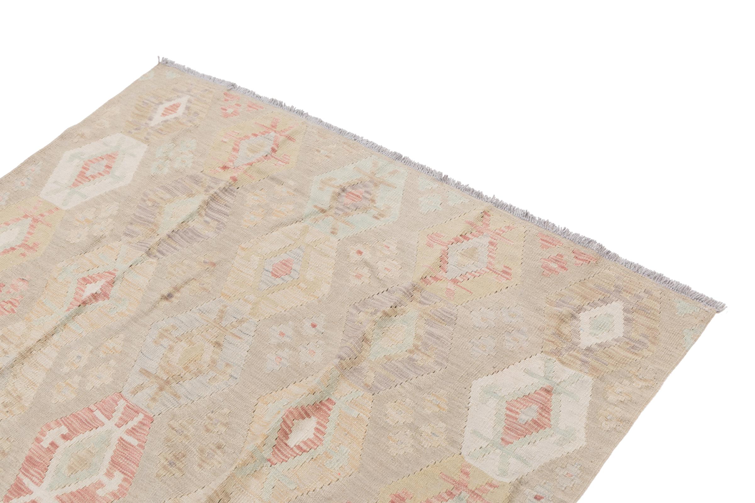 Denna kelimmatta är väldigt speciell eftersom den inte bara är vävd för hand, utan dess ull är också handspunnen. Kilim Heritage-kollektionen erbjuder en högmodern design i pastellfärger och i kombination med det mest traditionella hantverket från Orienten. Stort värde och helt överkomligt. Du kommer inte att hitta ett unikt föremål som detta igen.