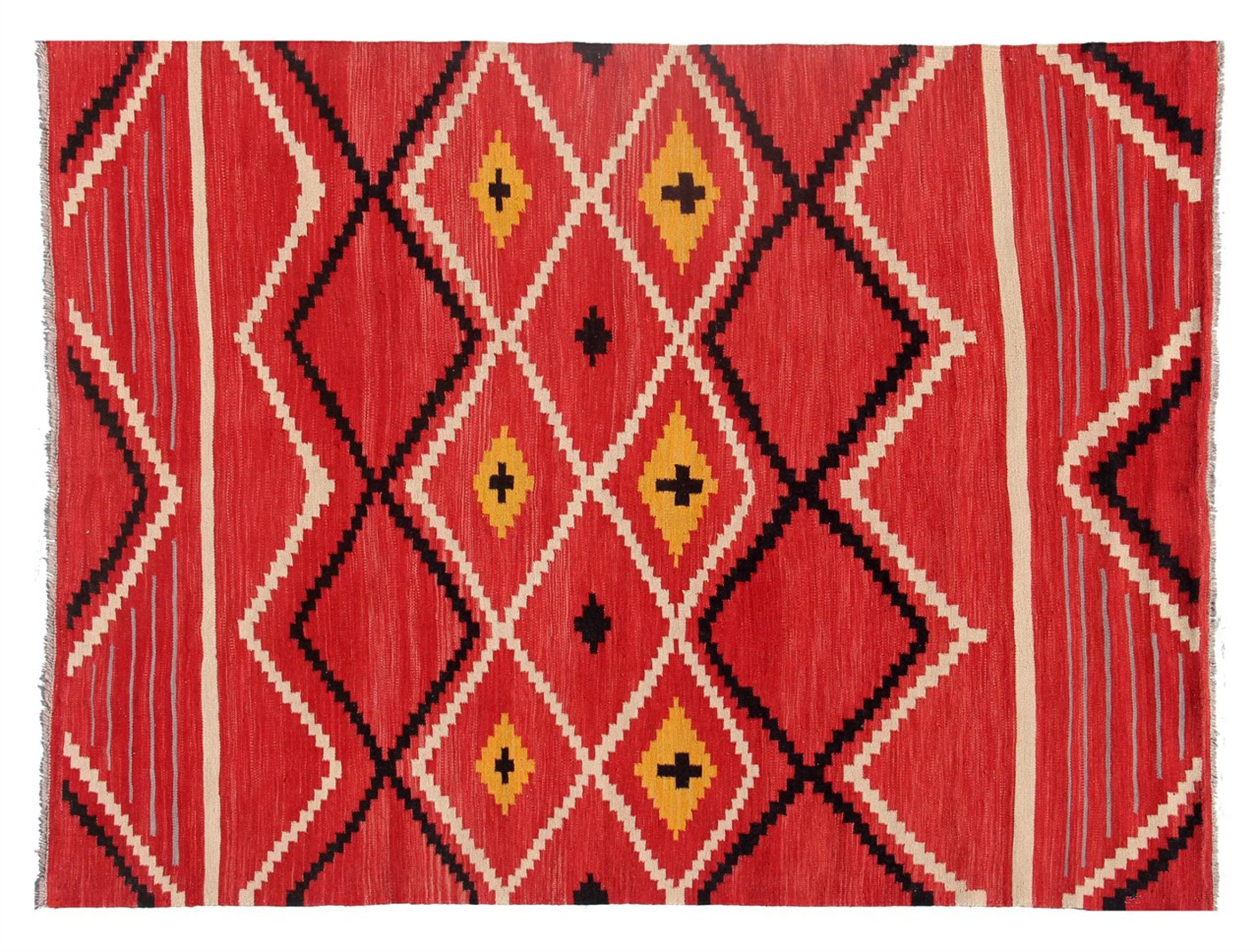 Dessa kilim Mattor har en avgörande skillnad till handknutna mattor - de är vävda för hand. De har inte en högkvalitativ hög med ull och är ofta plattare och grovare än knutade ullsmattor. Deras design är mindre komplex och därför är de vanligtvis mycket billigare. En annan fördel är att kilim mattor är mycket lättare och kan läggas ut framifrån och bakifrån. Handvävda kilims kommer ursprungligen från det tidigare Persien och tillverkas nu också mycket i Afghanistan. De har ganska enkla, okomplicerade mönster som beror på deras vävningsteknik.