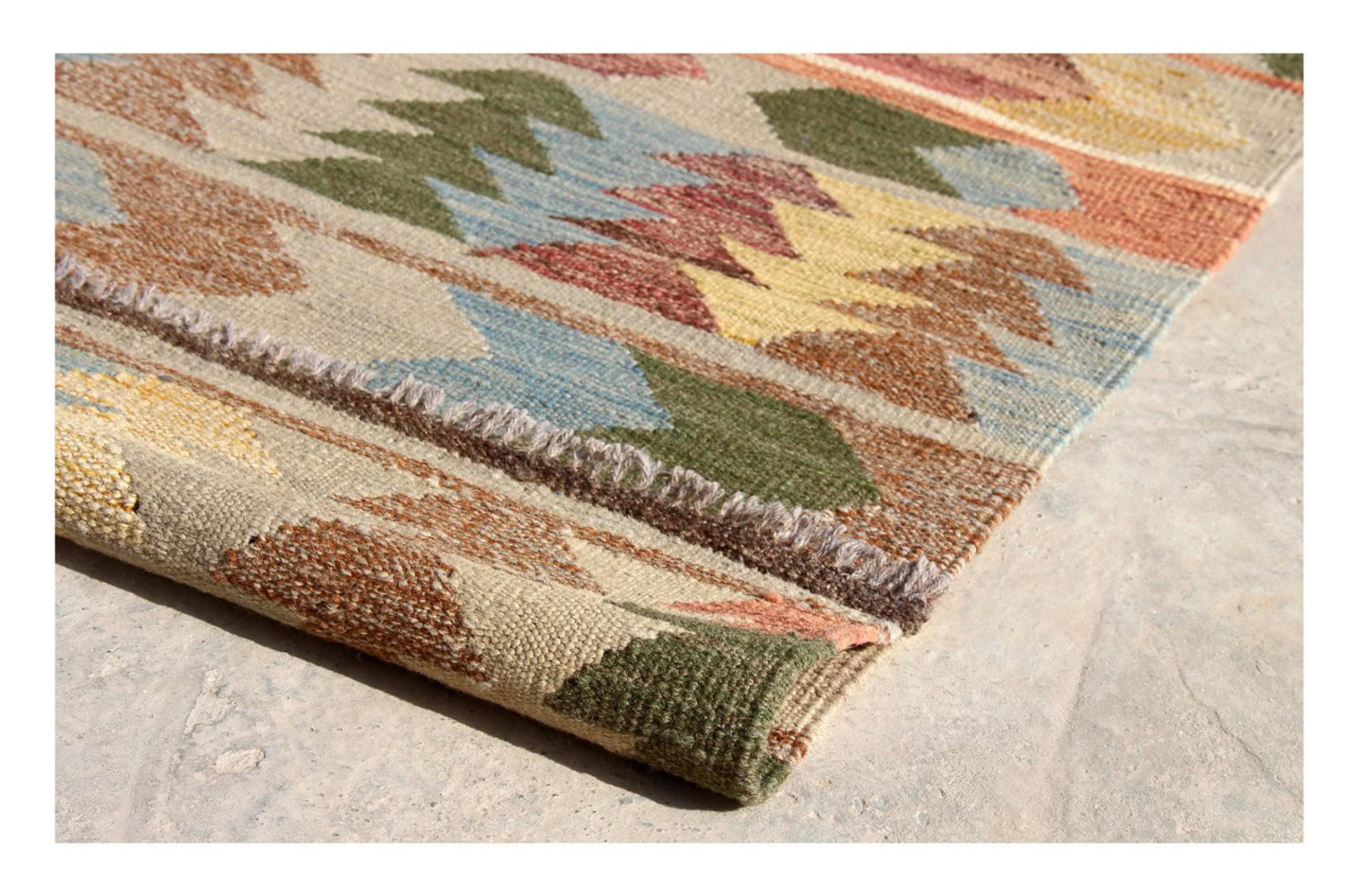 Denna matta tillverkas för hand på vävstolen som en platt väv. Flatweaves är mattor som inte har någon hög. Som namnet antyder är dessa mattor vävda och inte knutna. Detta resulterar i en platt matta med en strukturerad yta. Platta väver är inte så mjuka och mest tunnare än knutna mattor. Samtidigt är de betydligt mindre komplexa att tillverka och kan vanligtvis utformas från båda sidor (fram och bak). Deras mönster är vanligtvis geometriska, vilket beror på tyget.