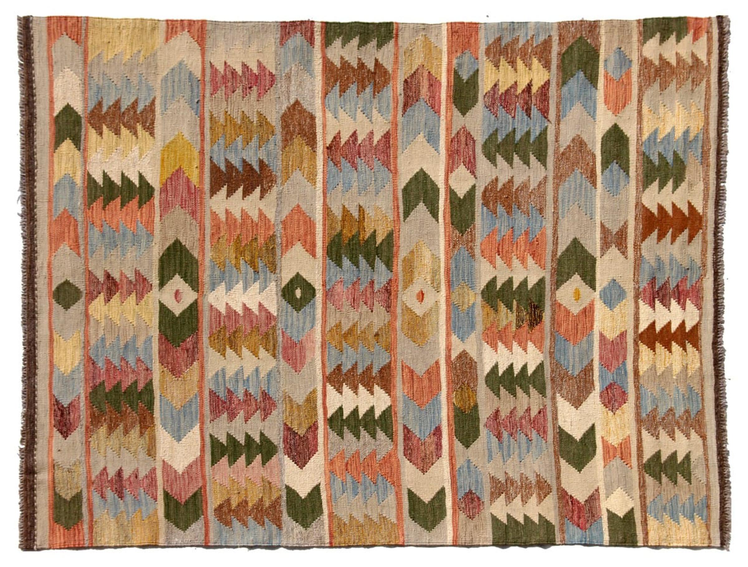 Denna handvävda kelim afghan är vacker tack vare de mångfacetterade färgerna och det typiska mönstret. Den var handvävd i Afghanistan av 100 % fårull. Den är utan tvekan mer robust och hållbar än maskintillverkade mattor. Dessutom har denna kelim en alldeles egen karaktär. En unik pjäs för dig och ditt hem som du aldrig kommer att hitta igen.