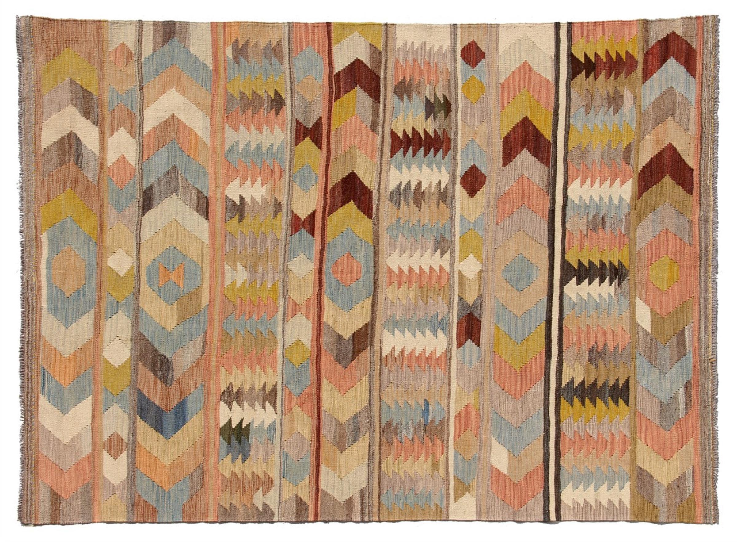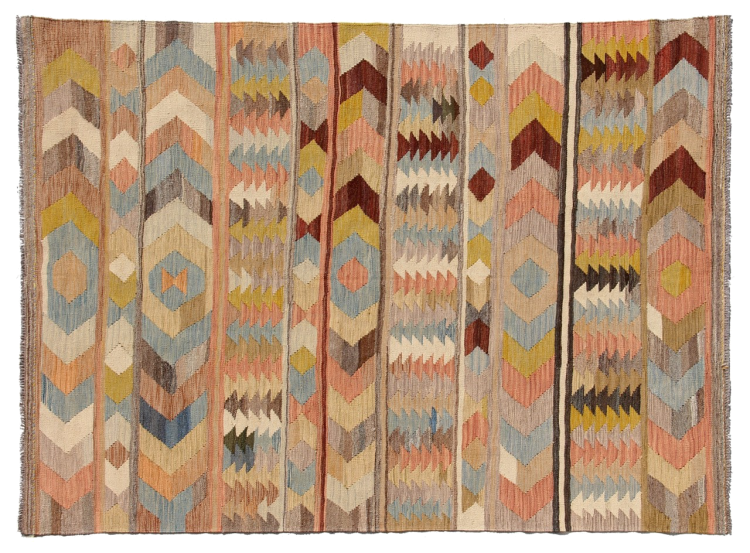 Denna handvävda kelim afghan är vacker tack vare de mångfacetterade färgerna och det typiska mönstret. Den var handvävd i Afghanistan av 100 % fårull. Den är utan tvekan mer robust och hållbar än maskintillverkade mattor. Dessutom har denna kelim en alldeles egen karaktär. En unik pjäs för dig och ditt hem som du aldrig kommer att hitta igen.