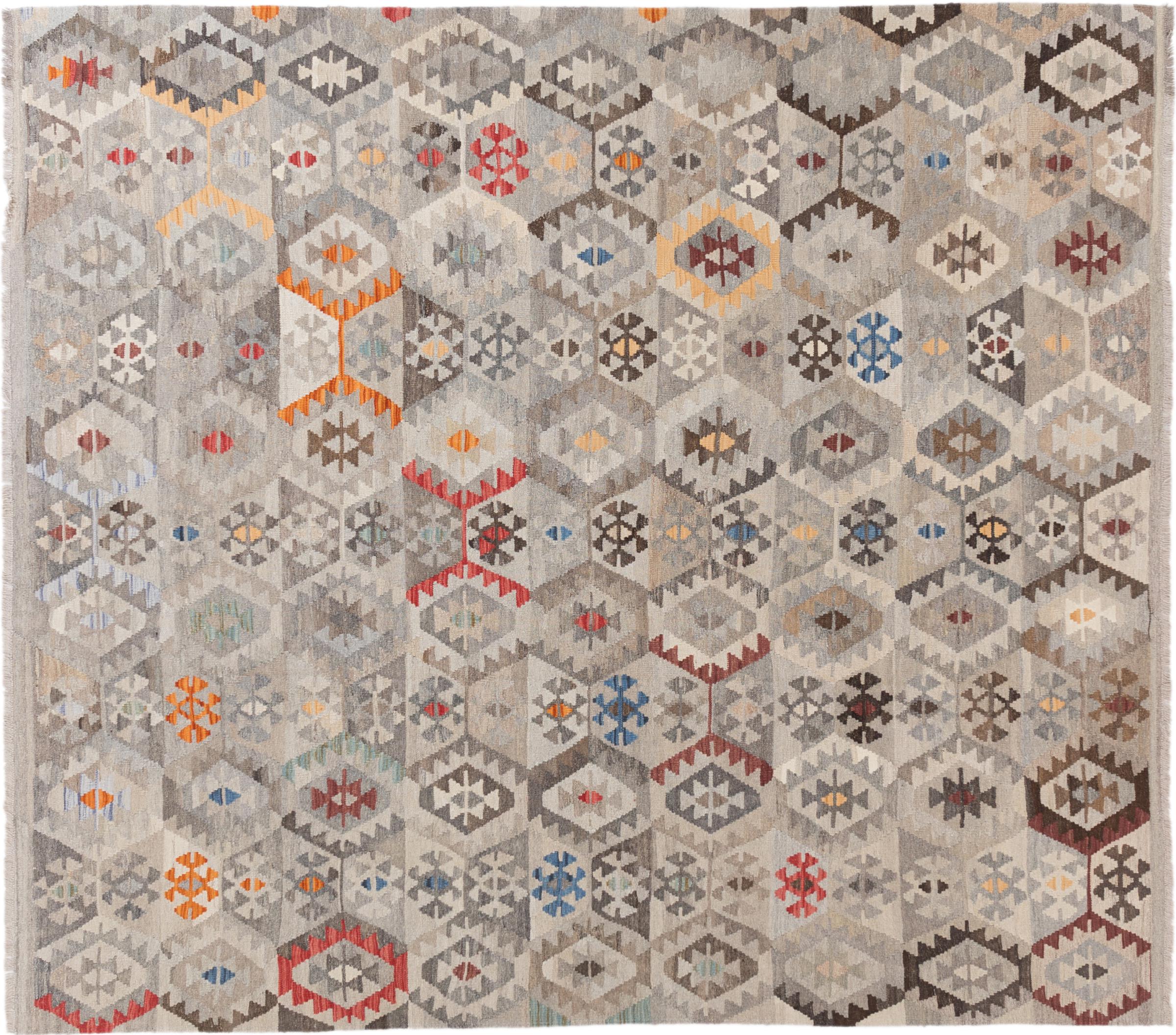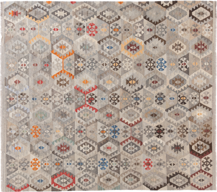 Mattans ID: 2941470051777 Storlek: 291x261 cm Tjocklek: ap. 3 mm Tillverkning: handvävd Lugg: Handspunnen ull Varp: Ull Ursprung: Afghanistan Ålder: Ny Vikt: ap. 11 kg Också känd som Kilim, Qilim, Chilim, Afgan, Afghán I lager: Unik - Endast 1 i lager
