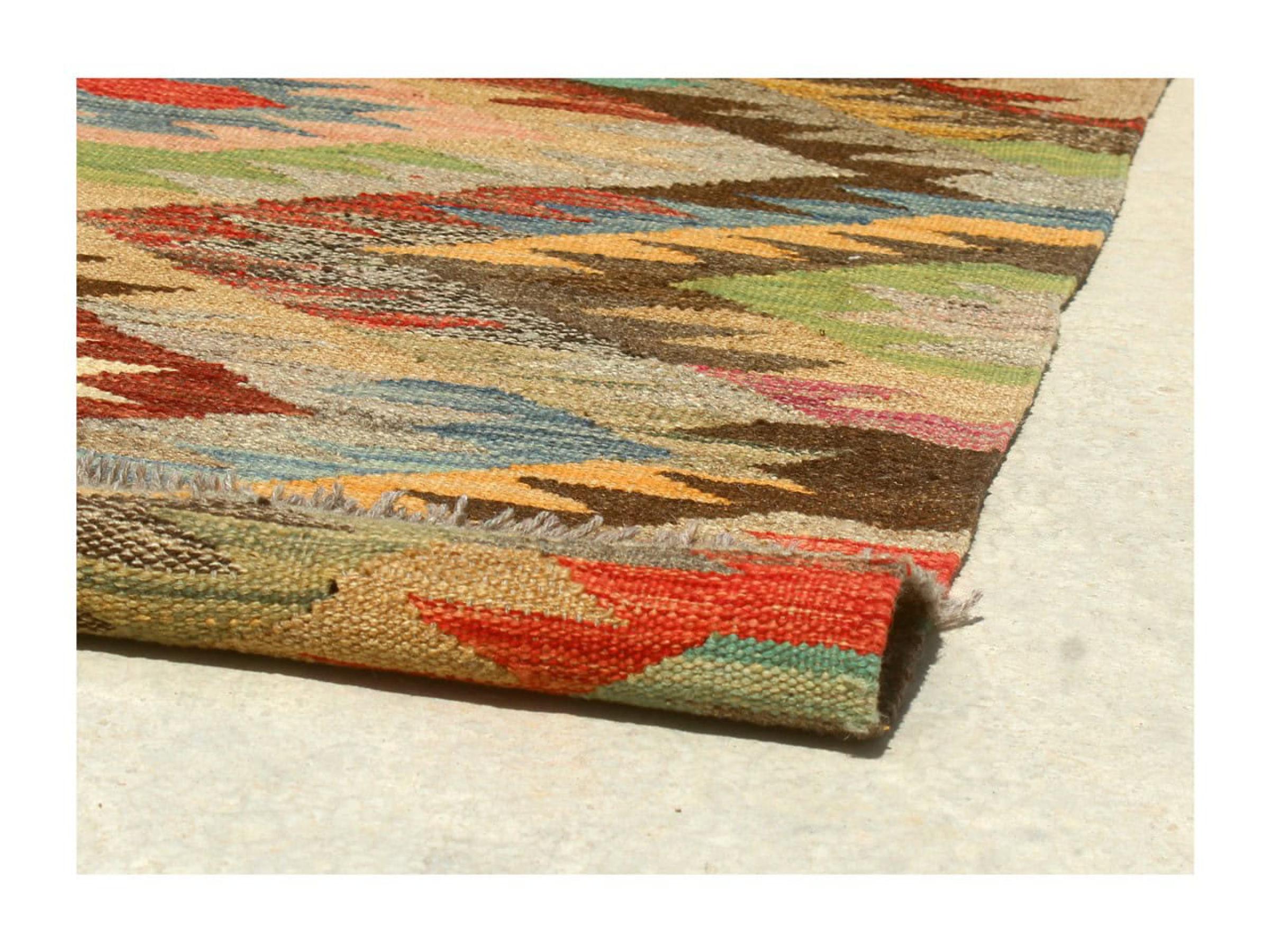 Denna handvävda kelim afghan är vacker tack vare de mångfacetterade färgerna och det typiska mönstret. Den var handvävd i Afghanistan av 100 % fårull. Den är utan tvekan mer robust och hållbar än maskintillverkade mattor. Dessutom har denna kelim en alldeles egen karaktär. En unik pjäs för dig och ditt hem som du aldrig kommer att hitta igen.