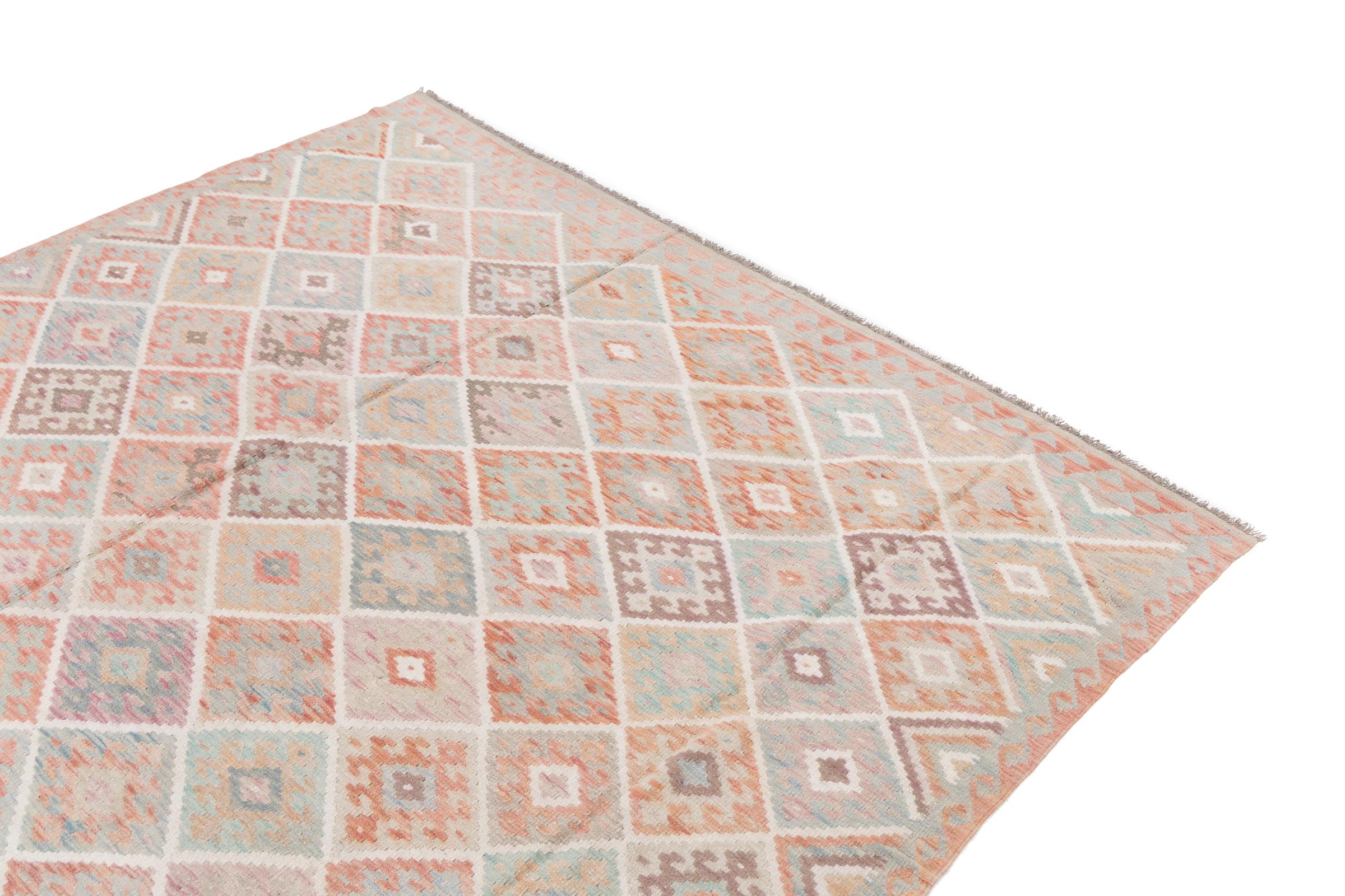 Denna kelimmatta är väldigt speciell eftersom den inte bara är vävd för hand, utan dess ull är också handspunnen. Kilim Heritage-kollektionen erbjuder en högmodern design i pastellfärger och i kombination med det mest traditionella hantverket från Orienten. Stort värde och helt överkomligt. Du kommer inte att hitta ett unikt föremål som detta igen.
