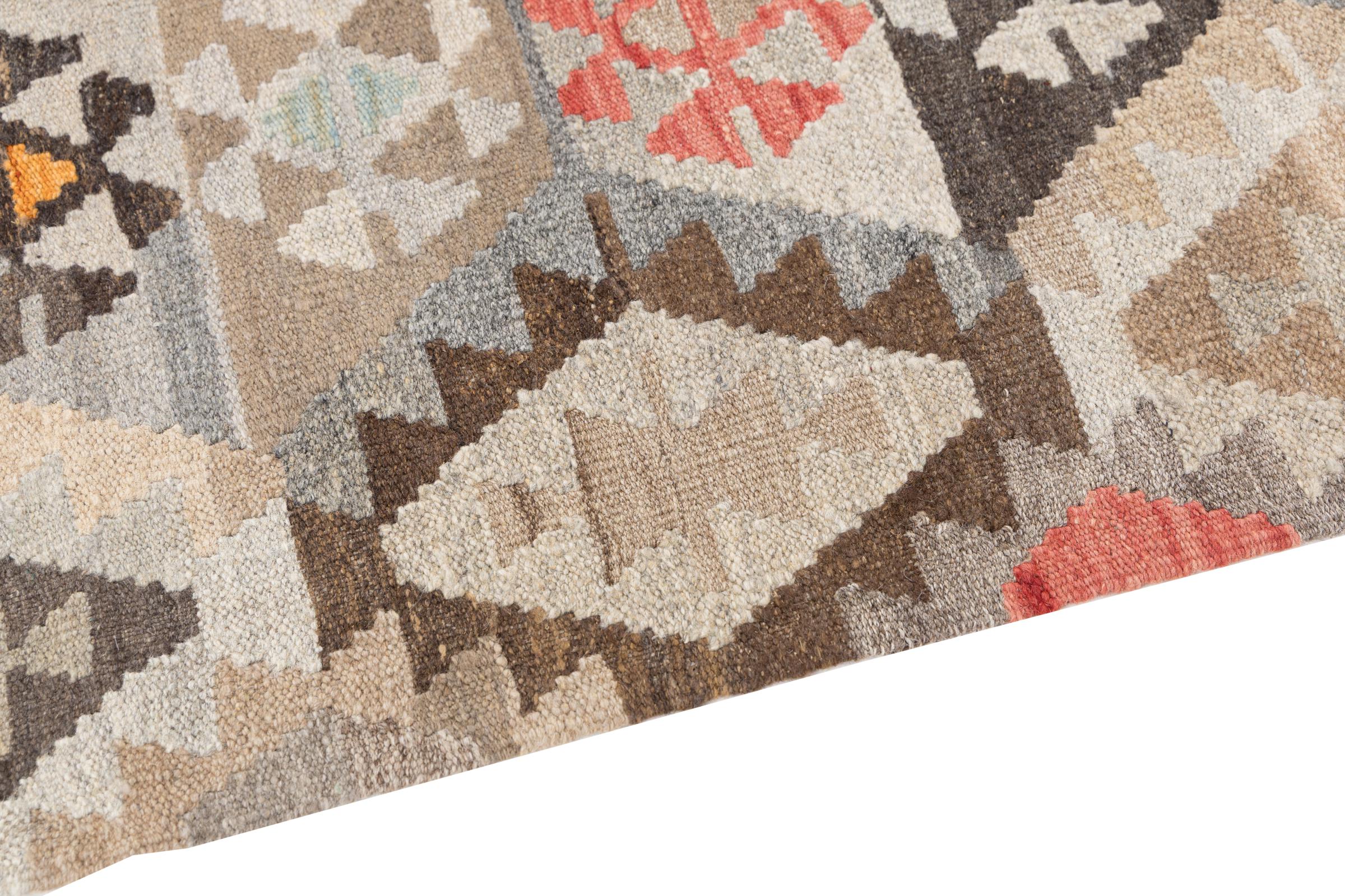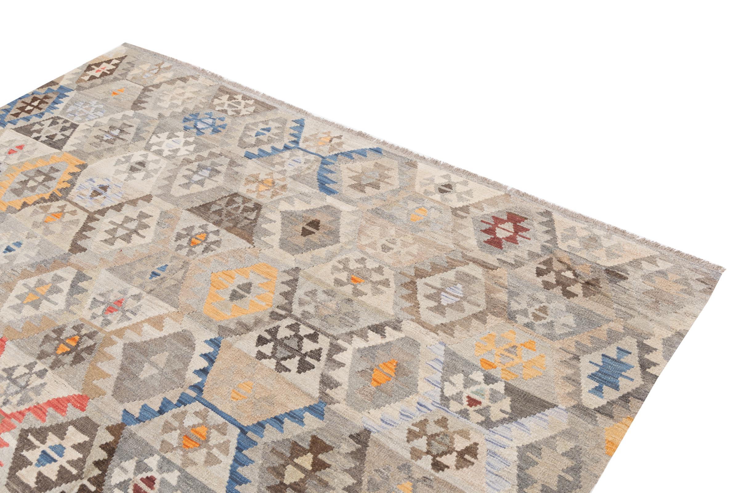 Denna kelimmatta är väldigt speciell eftersom den inte bara är vävd för hand, utan dess ull är också handspunnen. Kilim Heritage-kollektionen erbjuder en högmodern design i pastellfärger och i kombination med det mest traditionella hantverket från Orienten. Stort värde och helt överkomligt. Du kommer inte att hitta ett unikt föremål som detta igen.