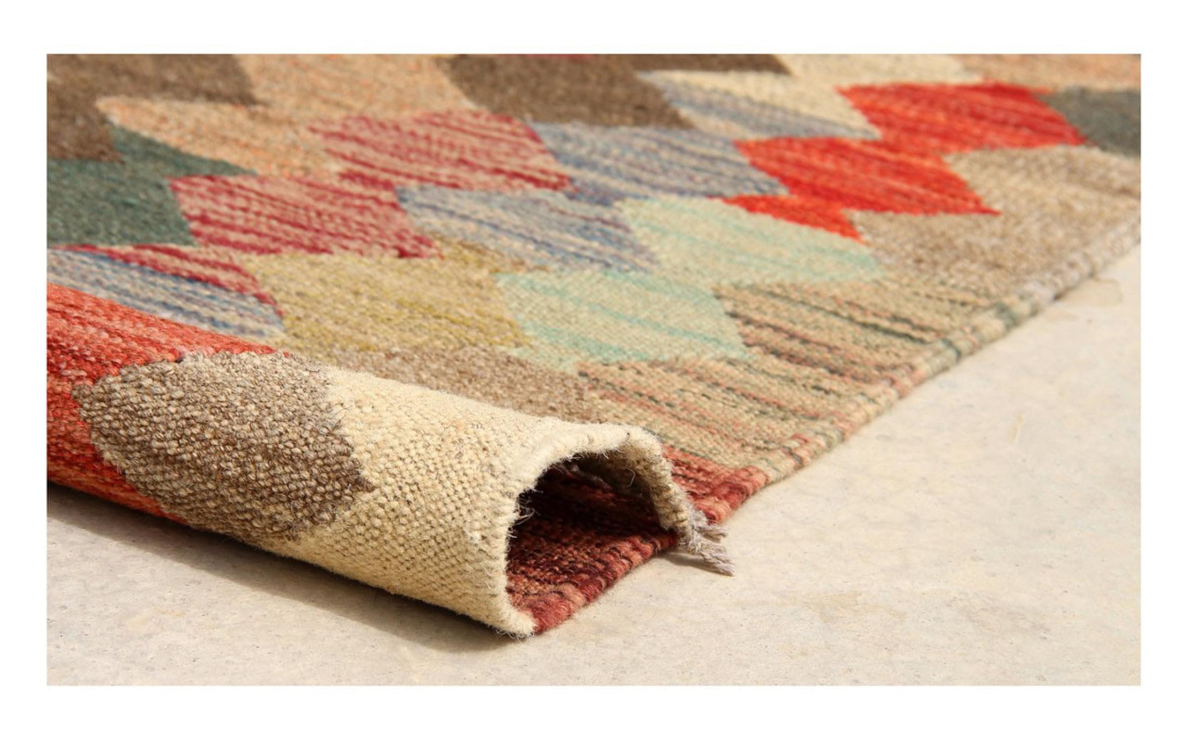 Denna matta tillverkas för hand på vävstolen som en platt väv. Flatweaves är mattor som inte har någon hög. Som namnet antyder är dessa mattor vävda och inte knutna. Detta resulterar i en platt matta med en strukturerad yta. Platta väver är inte så mjuka och mest tunnare än knutna mattor. Samtidigt är de betydligt mindre komplexa att tillverka och kan vanligtvis utformas från båda sidor (fram och bak). Deras mönster är vanligtvis geometriska, vilket beror på tyget.