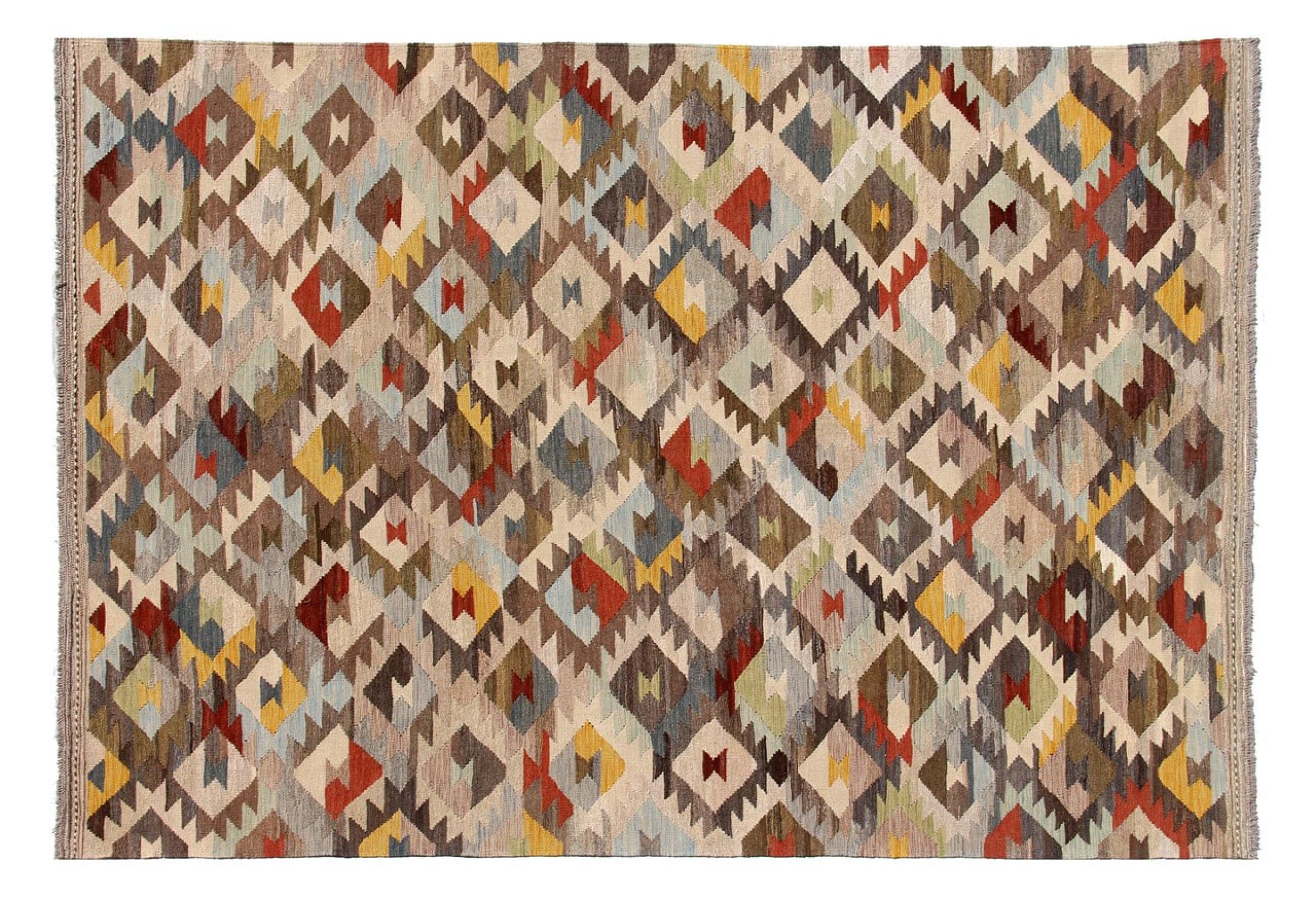 Denna handvävda kelim afghan är vacker tack vare de mångfacetterade färgerna och det typiska mönstret. Den var handvävd i Afghanistan av 100 % fårull. Den är utan tvekan mer robust och hållbar än maskintillverkade mattor. Dessutom har denna kelim en alldeles egen karaktär. En unik pjäs för dig och ditt hem som du aldrig kommer att hitta igen.