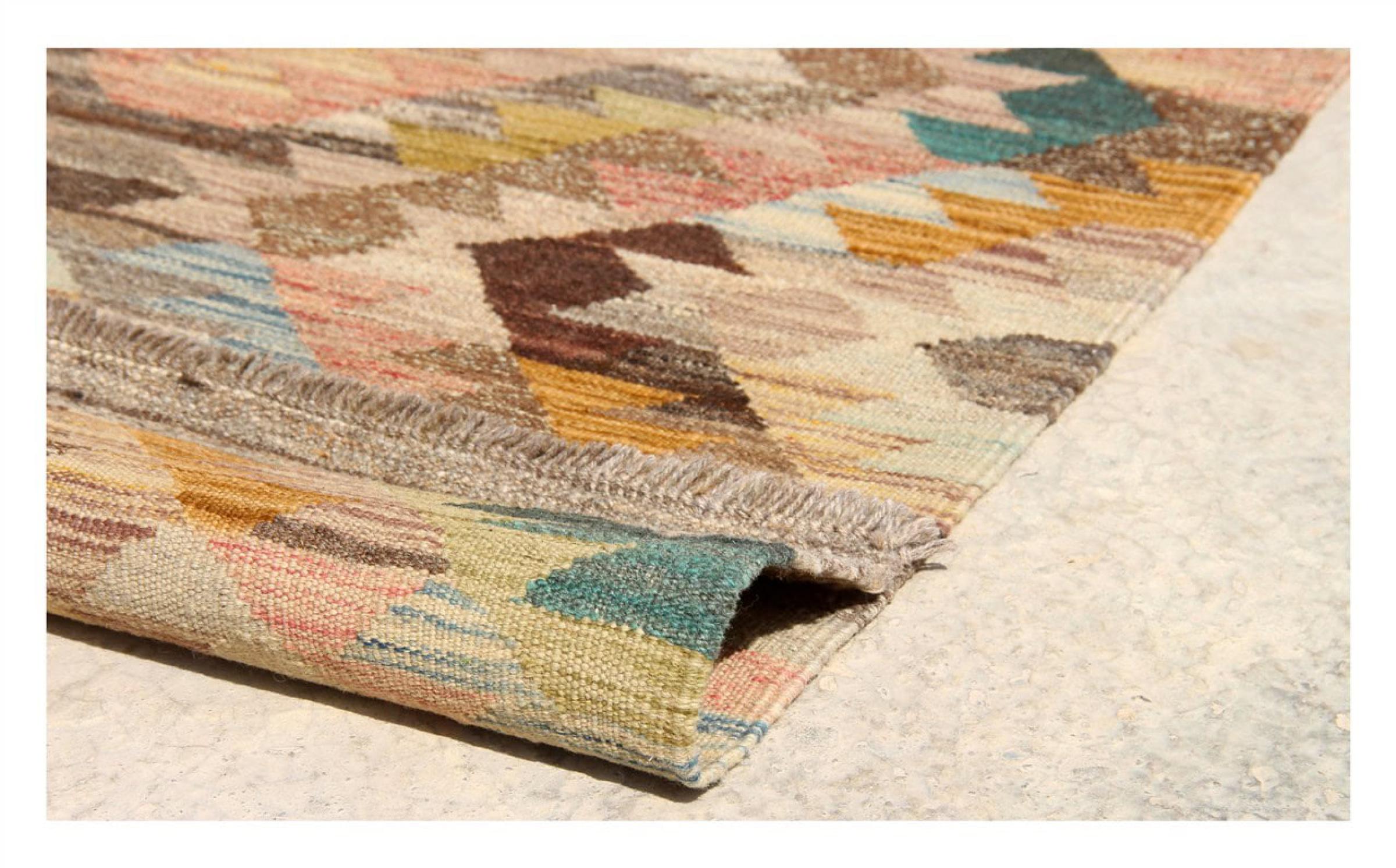 Denna handvävda kelim afghan är vacker tack vare de mångfacetterade färgerna och det typiska mönstret. Den var handvävd i Afghanistan av 100 % fårull. Den är utan tvekan mer robust och hållbar än maskintillverkade mattor. Dessutom har denna kelim en alldeles egen karaktär. En unik pjäs för dig och ditt hem som du aldrig kommer att hitta igen.