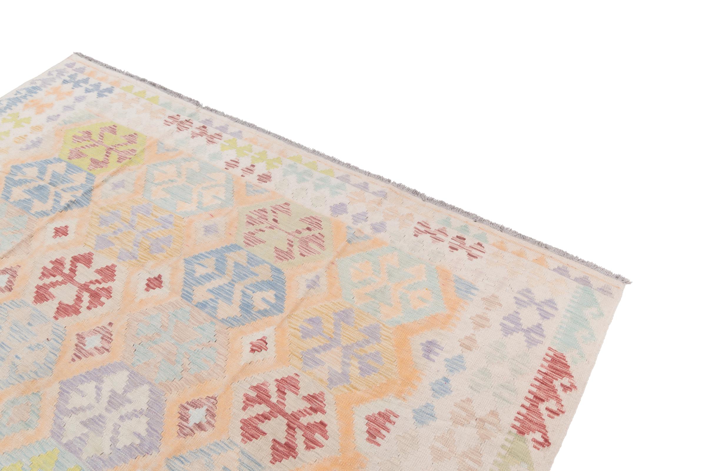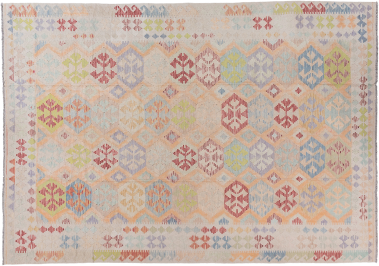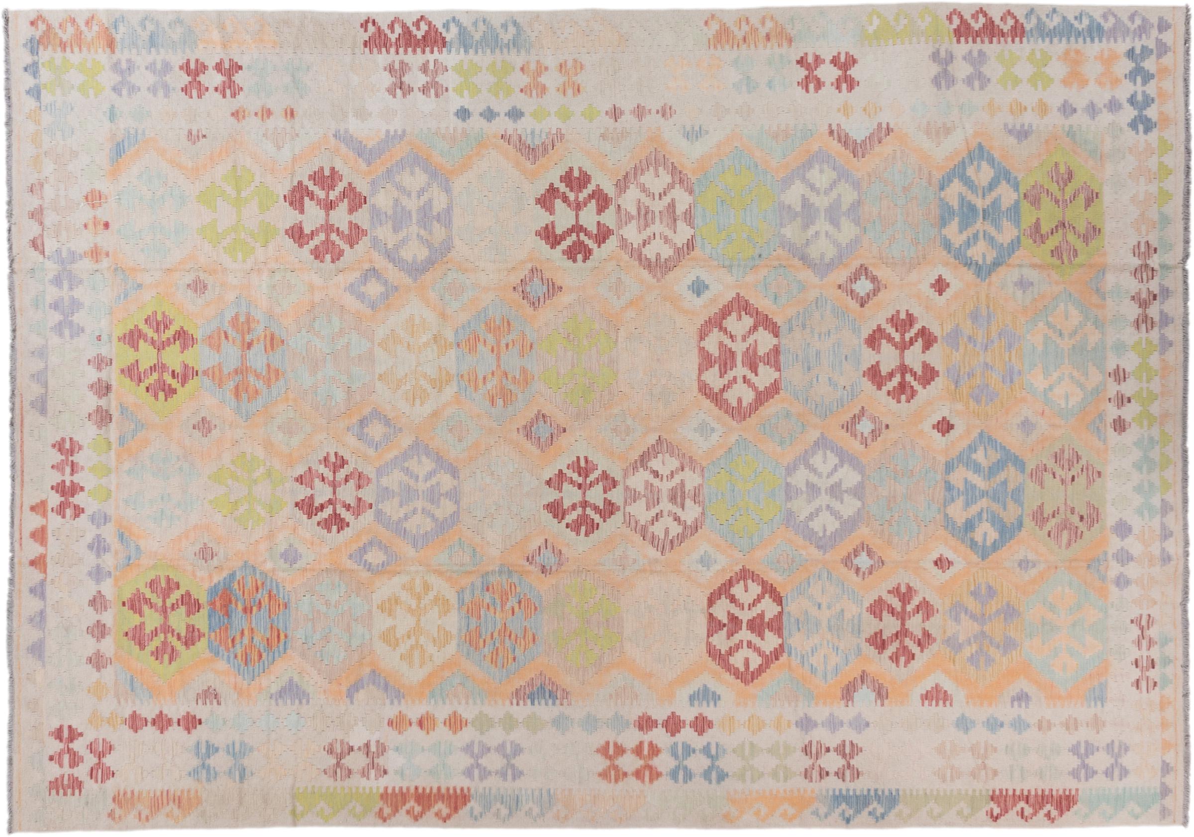 Denna kelimmatta är väldigt speciell eftersom den inte bara är vävd för hand, utan dess ull är också handspunnen. Kilim Heritage-kollektionen erbjuder en högmodern design i pastellfärger och i kombination med det mest traditionella hantverket från Orienten. Stort värde och helt överkomligt. Du kommer inte att hitta ett unikt föremål som detta igen.