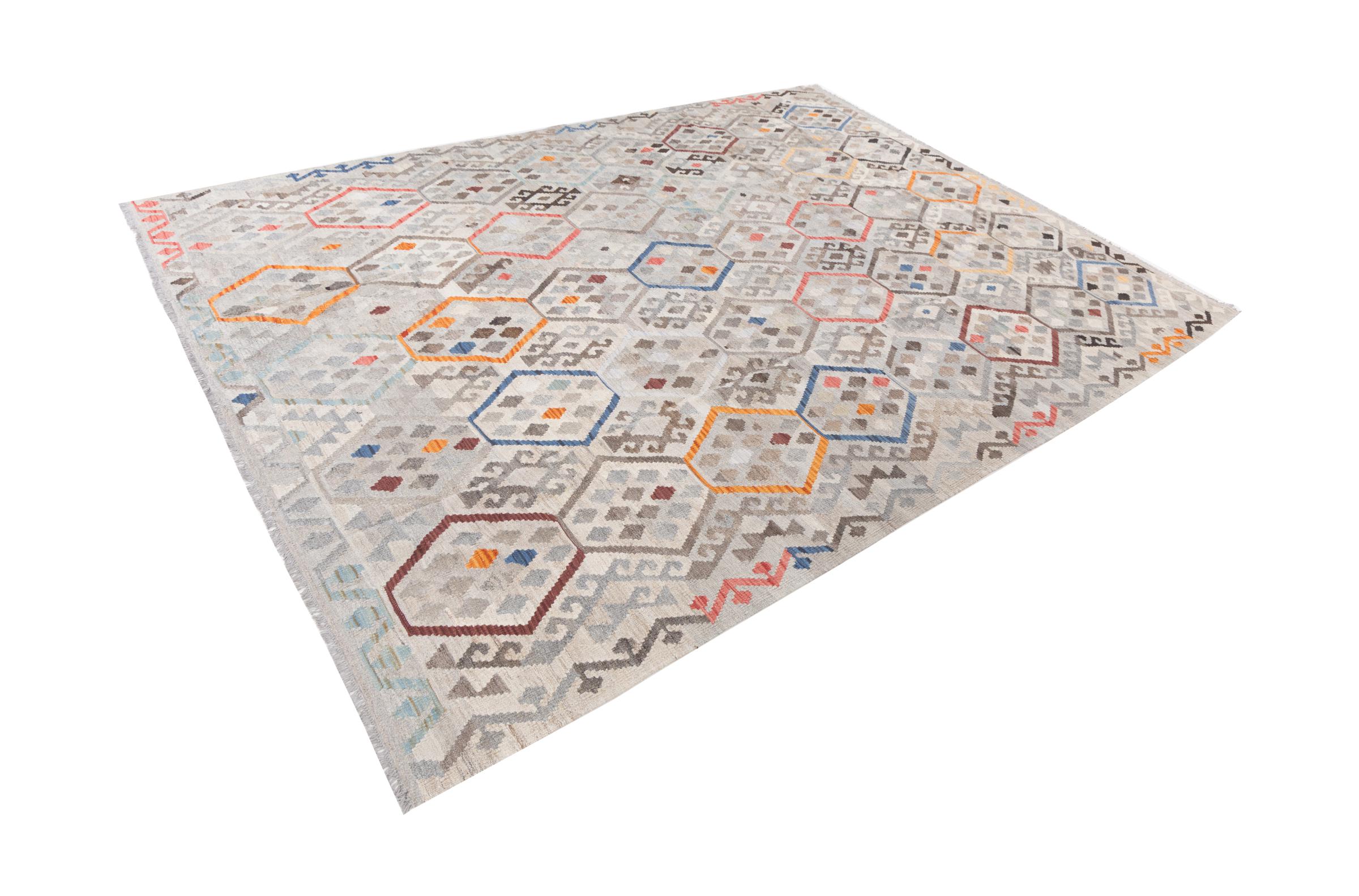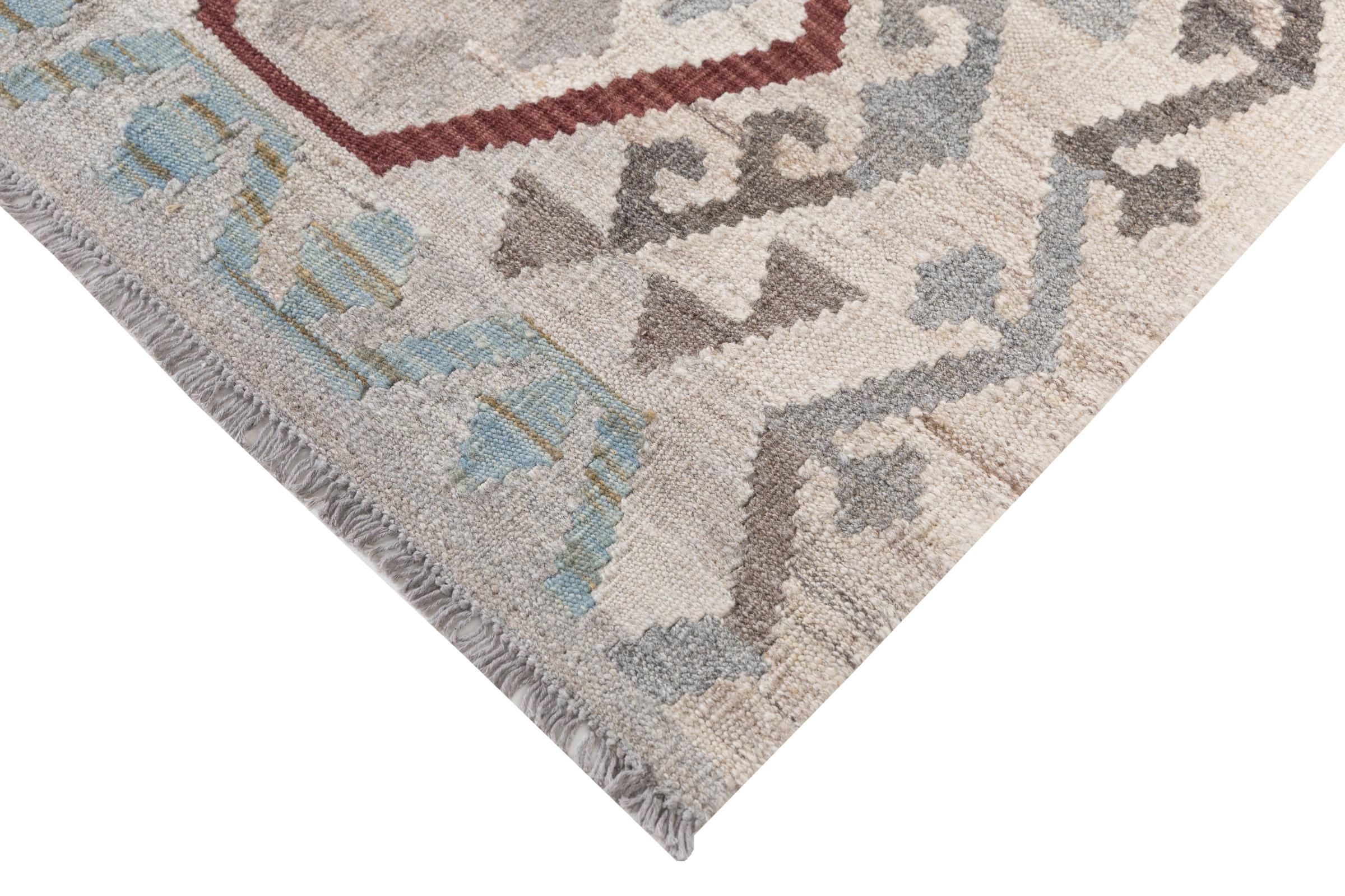Denna kelimmatta är väldigt speciell eftersom den inte bara är vävd för hand, utan dess ull är också handspunnen. Kilim Heritage-kollektionen erbjuder en högmodern design i pastellfärger och i kombination med det mest traditionella hantverket från Orienten. Stort värde och helt överkomligt. Du kommer inte att hitta ett unikt föremål som detta igen.