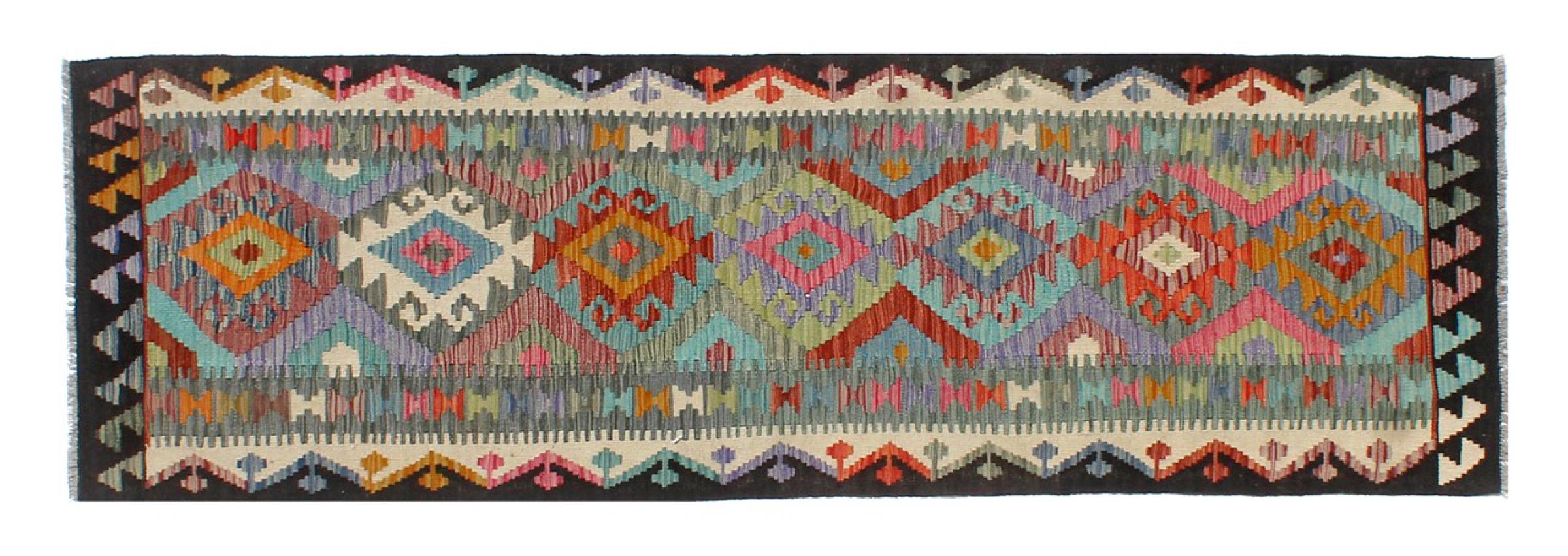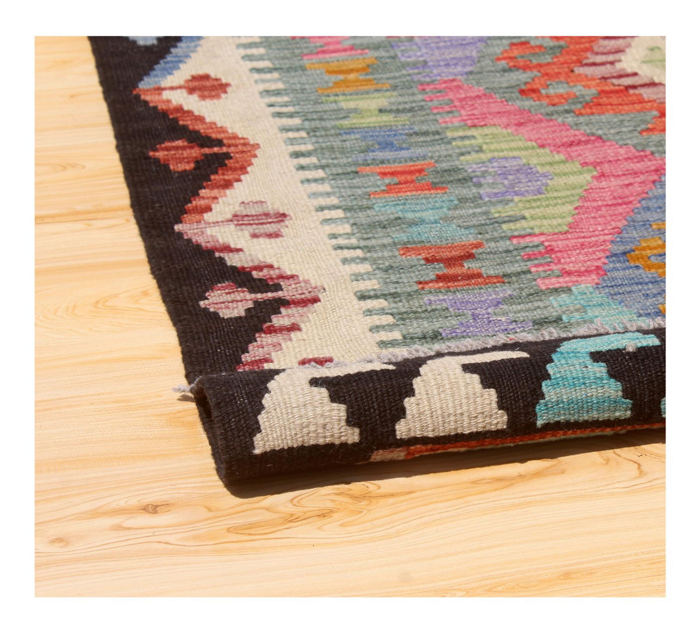 Denna handvävda kelim afghan är vacker tack vare de mångfacetterade färgerna och det typiska mönstret. Den var handvävd i Afghanistan av 100 % fårull. Den är utan tvekan mer robust och hållbar än maskintillverkade mattor. Dessutom har denna kelim en alldeles egen karaktär. En unik pjäs för dig och ditt hem som du aldrig kommer att hitta igen.